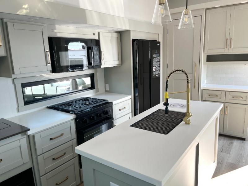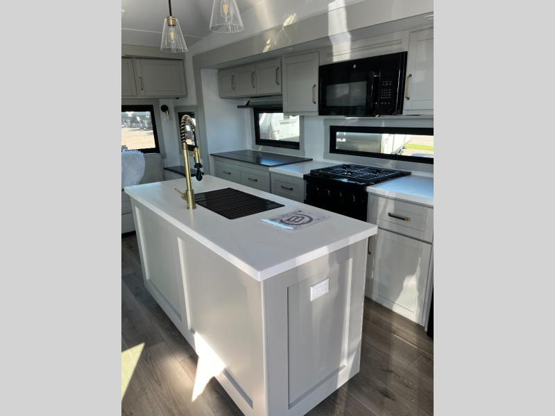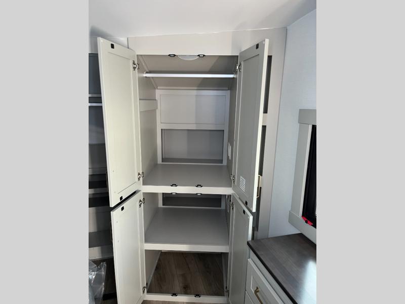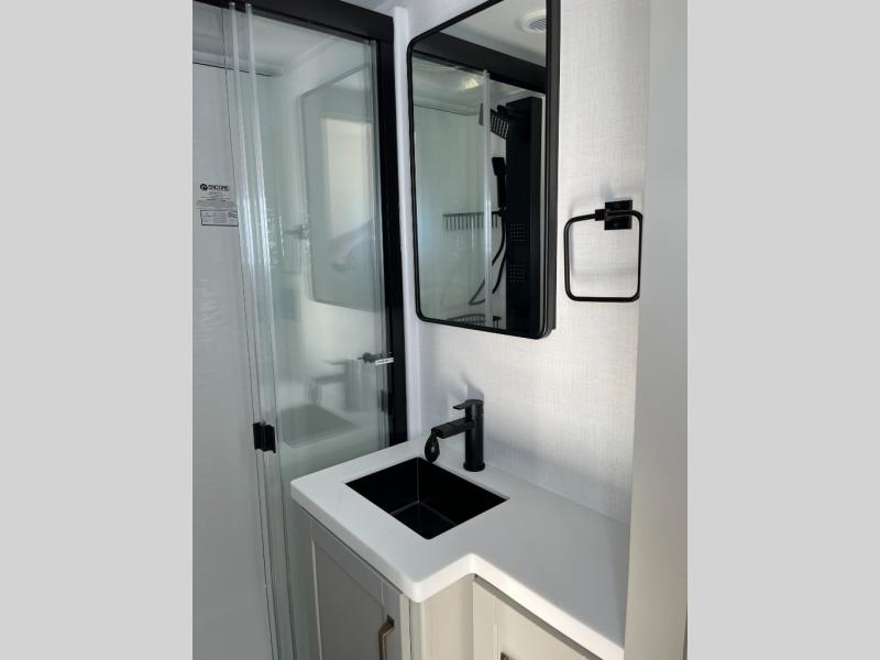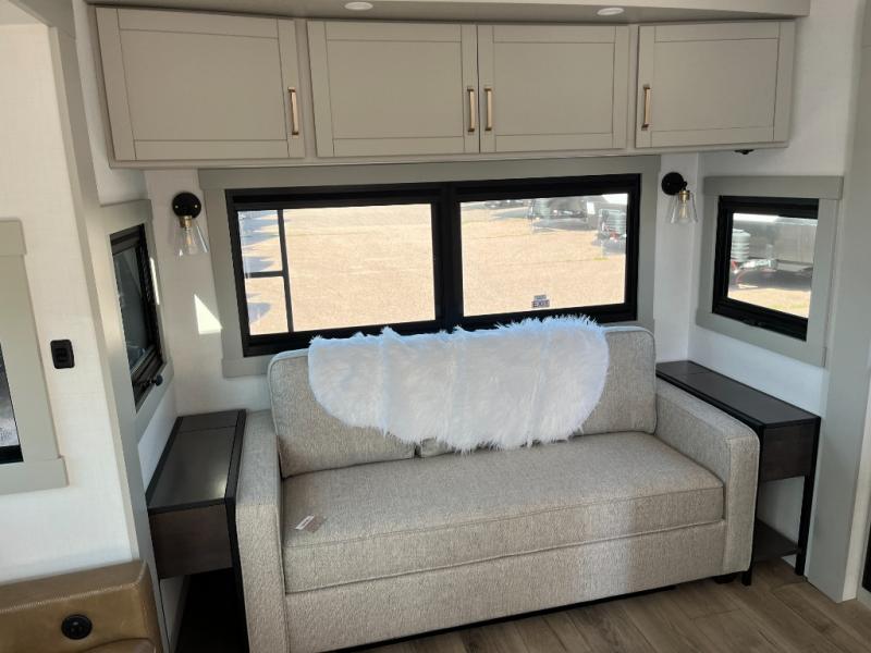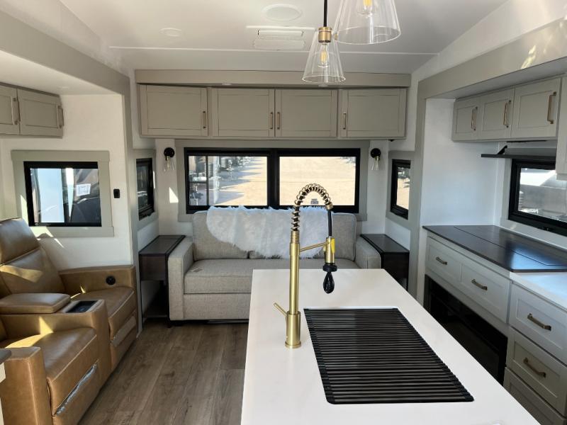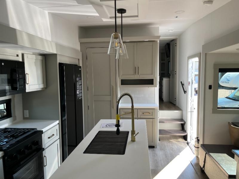 This Model Z luxury fifth wheel is bright and modern on the inside, with loads of amenities that will have you dreaming of your next trip! Enter and find a spacious combined living/kitchen space thanks to dual opposing slides. There is ample seating with a sliding desk/dining table, 62" theater seating, and a 72" tri-fold sofa along the rear wall. You can easily relax and enjoy the 50" Smart telescoping TV with a cozy fireplace below. The kitchen offers all that you need to prepare and cook meals just like home with a 16 cu. ft. refrigerator for your perishables, a 30" microwave oven, and three burner range top and oven. You will love the integrated spice rack, and the kitchen island all outfitted with dog bowls and double pull out trash bins with an integrated Stow 'N Go paper towel holder. There is also an 84" pantry with adjustable shelves for all of your canned and dry goods. Head up the steps to a private master suite with king bed slide. You can opt for the queen bed if you like. A sliding dresser top features hidden storage which is perfect for jewelry and other personal belongings. The front wardrobe features mirrored doors and the corner closet has been prepped for a stackable washer and dryer if you choose to add that option. Relax and enjoy a large bath featuring a linen cabinet, a 30" x 42" shower, and vanity with sink, plus medicine cabinet.