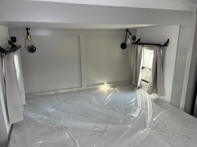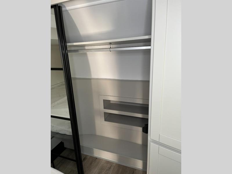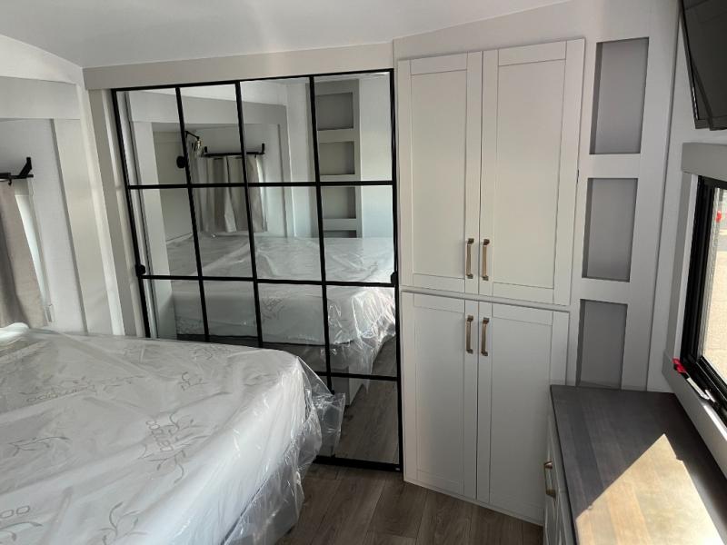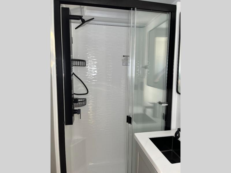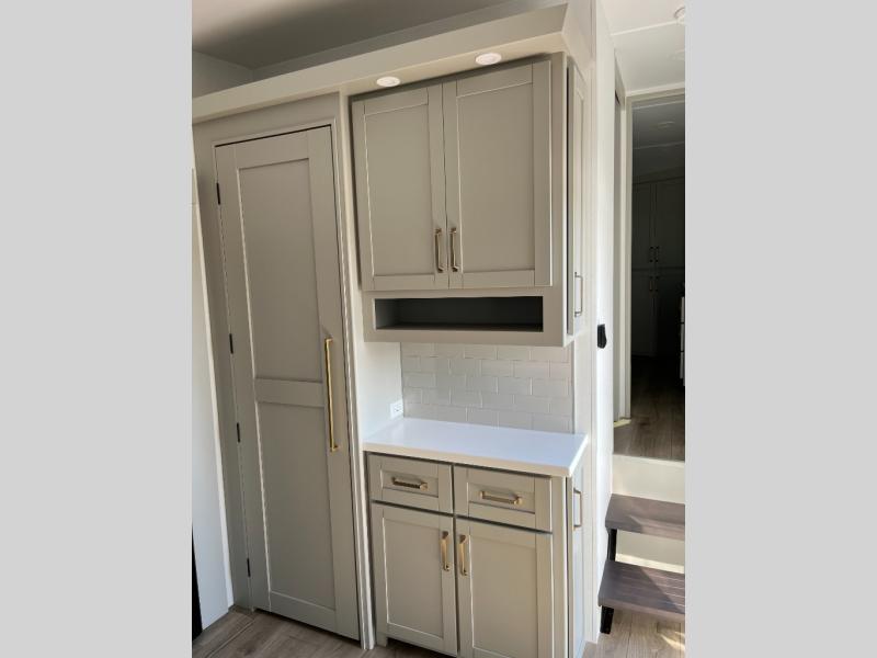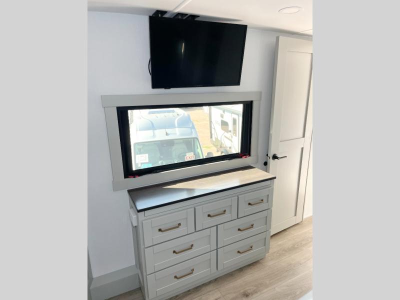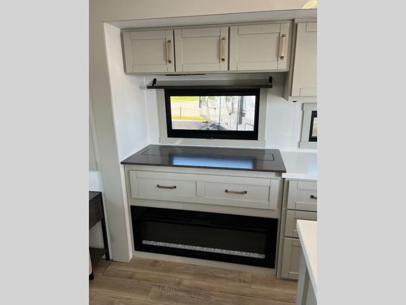 This Model Z luxury fifth wheel is bright and modern on the inside, with loads of amenities that will have you dreaming of your next trip! Enter and find a spacious combined living/kitchen space thanks to dual opposing slides. There is ample seating with a sliding desk/dining table, 62" theater seating, and a 72" tri-fold sofa along the rear wall. You can easily relax and enjoy the 50" Smart telescoping TV with a cozy fireplace below. The kitchen offers all that you need to prepare and cook meals just like home with a 16 cu. ft. refrigerator for your perishables, a 30" microwave oven, and three burner range top and oven. You will love the integrated spice rack, and the kitchen island all outfitted with dog bowls and double pull out trash bins with an integrated Stow 'N Go paper towel holder. There is also an 84" pantry with adjustable shelves for all of your canned and dry goods. Head up the steps to a private master suite with king bed slide. You can opt for the queen bed if you like. A sliding dresser top features hidden storage which is perfect for jewelry and other personal belongings. The front wardrobe features mirrored doors and the corner closet has been prepped for a stackable washer and dryer if you choose to add that option. Relax and enjoy a large bath featuring a linen cabinet, a 30" x 42" shower, and vanity with sink, plus medicine cabinet.
