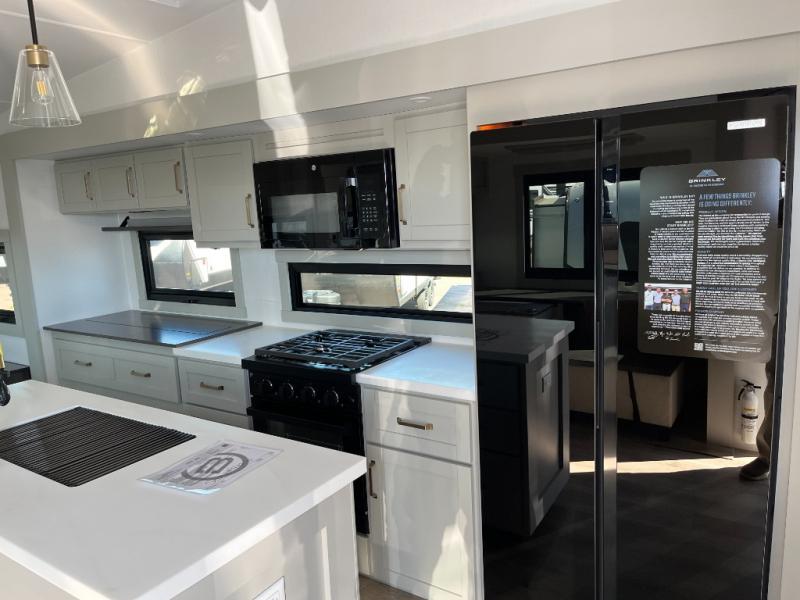 The Brinkley mid-profile Model Z fifth wheels bring you clean lines and an upscale look with plenty of style and exciting new features like the industry first brass plumbing connections. These units also feature an automotive grade front cap, plenty of exterior storage, dual exterior hot and cold showers, and wide stance leveling jacks for easy set up. Residential frameless windows provide a clean look and beautiful views, and ample electrical outlets and 6 USB/USB-C outlets allow all of your electronics and appliances to easily be used and charged.