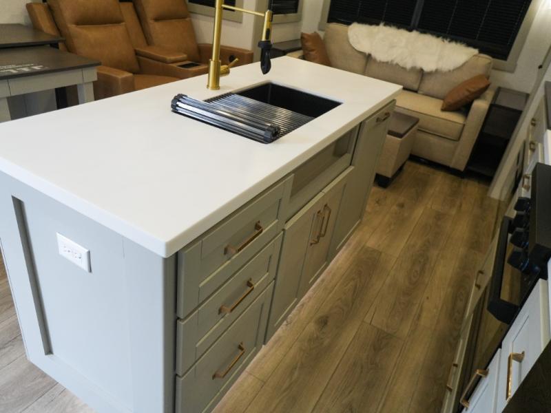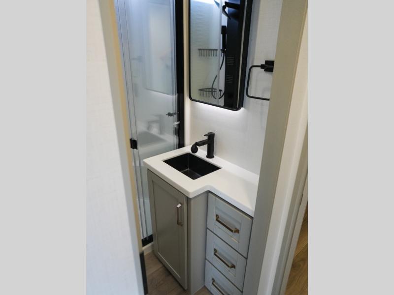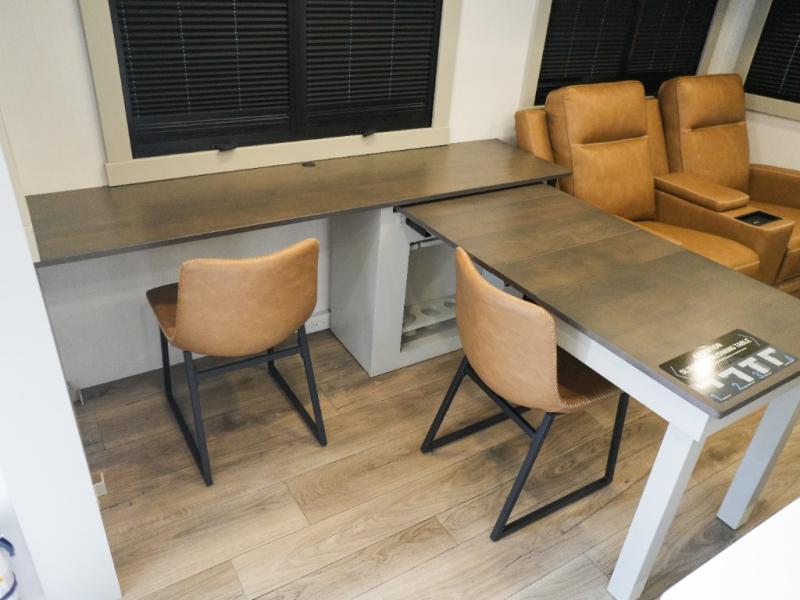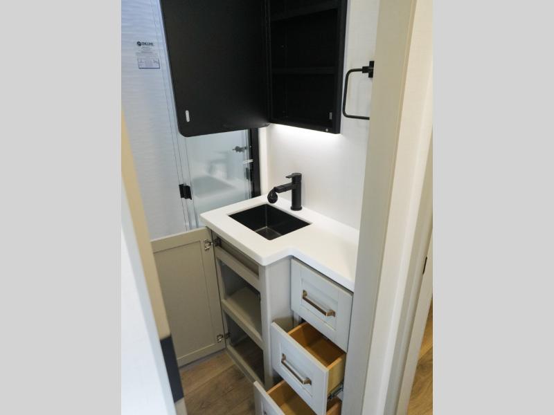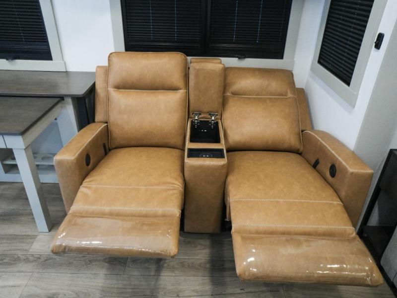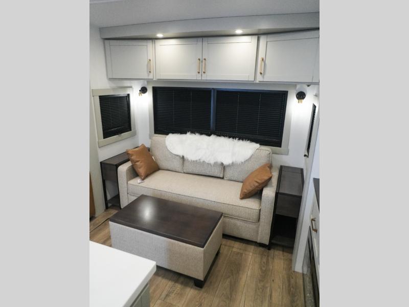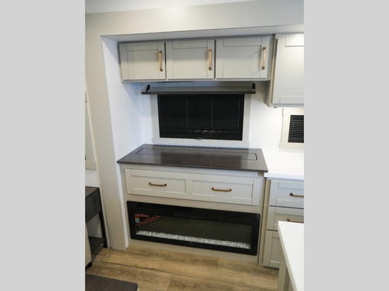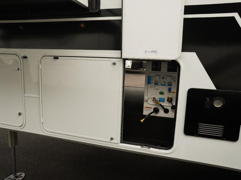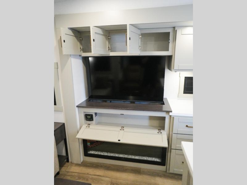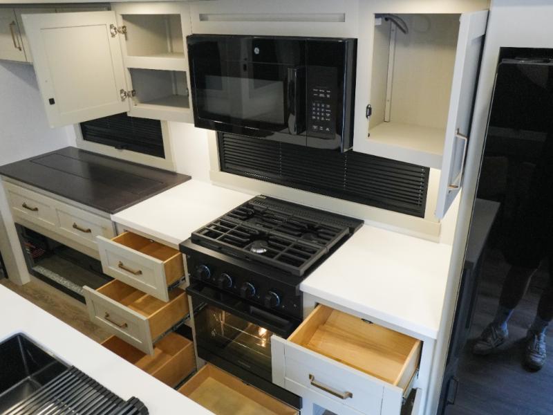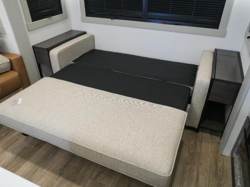 This Model Z luxury fifth wheel is bright and modern on the inside, with loads of amenities that will have you dreaming of your next trip! Enter and find a spacious combined living/kitchen space thanks to dual opposing slides. There is ample seating with a sliding desk/dining table, 62" theater seating, and a 72" tri-fold sofa along the rear wall. You can easily relax and enjoy the 50" Smart telescoping TV with a cozy fireplace below. The kitchen offers all that you need to prepare and cook meals just like home with a 16 cu. ft. refrigerator for your perishables, a 30" microwave oven, and three burner range top and oven. You will love the integrated spice rack, and the kitchen island all outfitted with dog bowls and double pull out trash bins with an integrated Stow 'N Go paper towel holder. There is also an 84" pantry with adjustable shelves for all of your canned and dry goods. Head up the steps to a private master suite with king bed slide. You can opt for the queen bed if you like. A sliding dresser top features hidden storage which is perfect for jewelry and other personal belongings. The front wardrobe features mirrored doors and the corner closet has been prepped for a stackable washer and dryer if you choose to add that option. Relax and enjoy a large bath featuring a linen cabinet, a 30" x 42" shower, and vanity with sink, plus medicine cabinet.