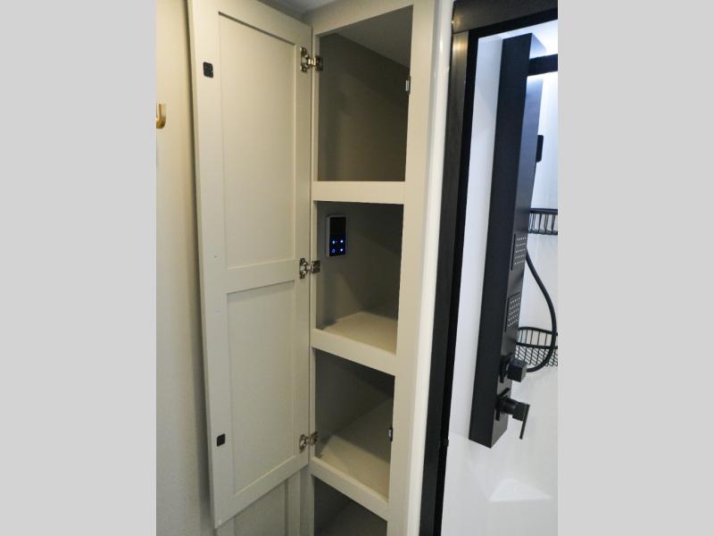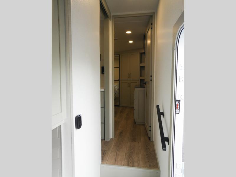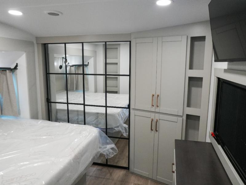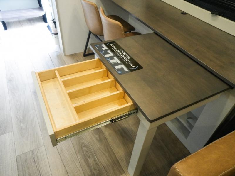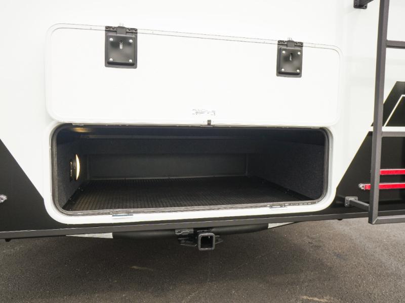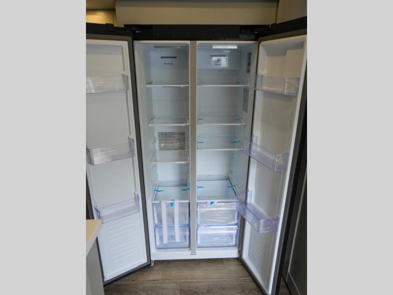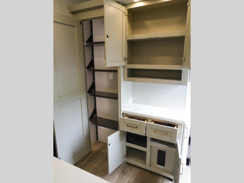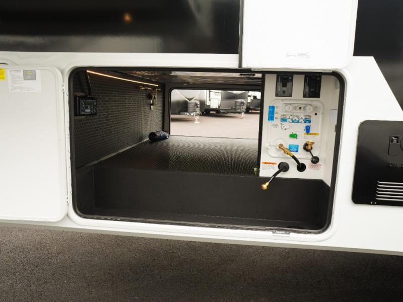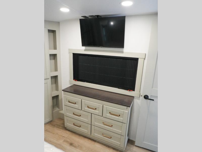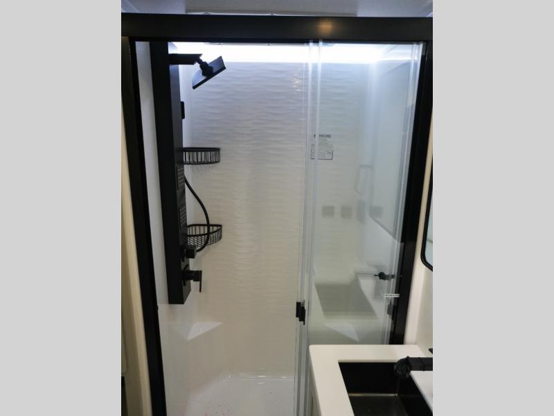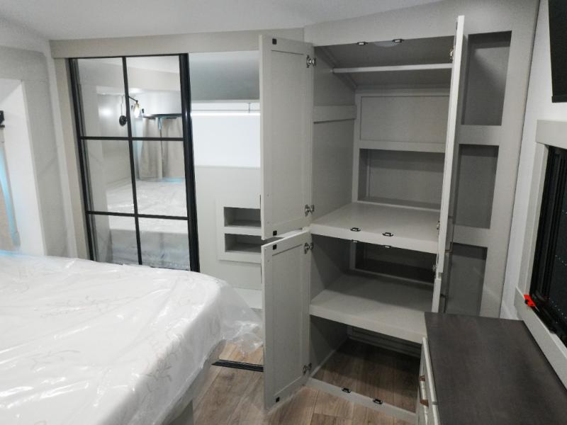 This Model Z luxury fifth wheel is bright and modern on the inside, with loads of amenities that will have you dreaming of your next trip! Enter and find a spacious combined living/kitchen space thanks to dual opposing slides. There is ample seating with a sliding desk/dining table, 62" theater seating, and a 72" tri-fold sofa along the rear wall. You can easily relax and enjoy the 50" Smart telescoping TV with a cozy fireplace below. The kitchen offers all that you need to prepare and cook meals just like home with a 16 cu. ft. refrigerator for your perishables, a 30" microwave oven, and three burner range top and oven. You will love the integrated spice rack, and the kitchen island all outfitted with dog bowls and double pull out trash bins with an integrated Stow 'N Go paper towel holder. There is also an 84" pantry with adjustable shelves for all of your canned and dry goods. Head up the steps to a private master suite with king bed slide. You can opt for the queen bed if you like. A sliding dresser top features hidden storage which is perfect for jewelry and other personal belongings. The front wardrobe features mirrored doors and the corner closet has been prepped for a stackable washer and dryer if you choose to add that option. Relax and enjoy a large bath featuring a linen cabinet, a 30" x 42" shower, and vanity with sink, plus medicine cabinet.