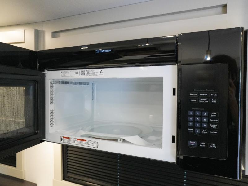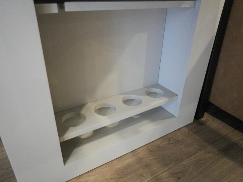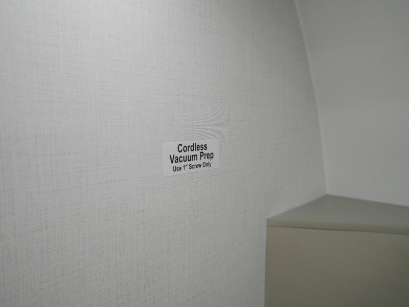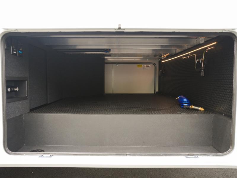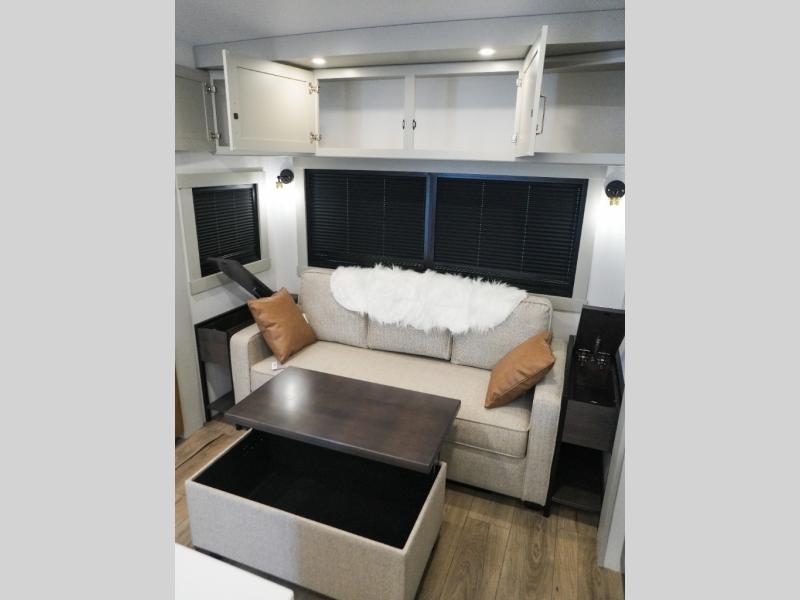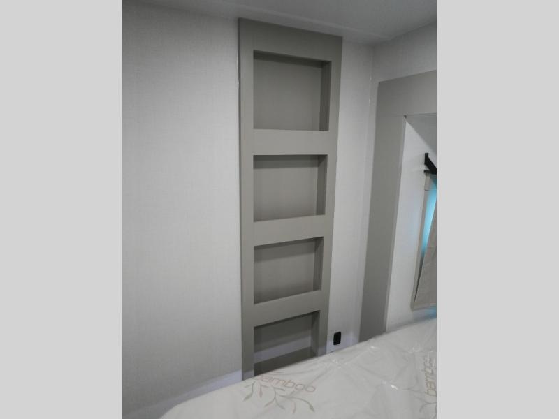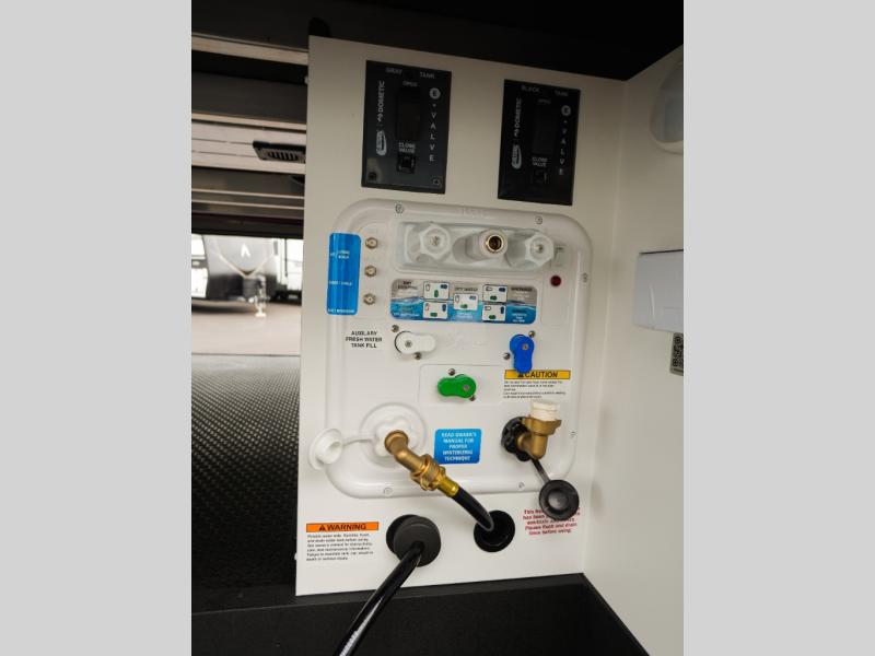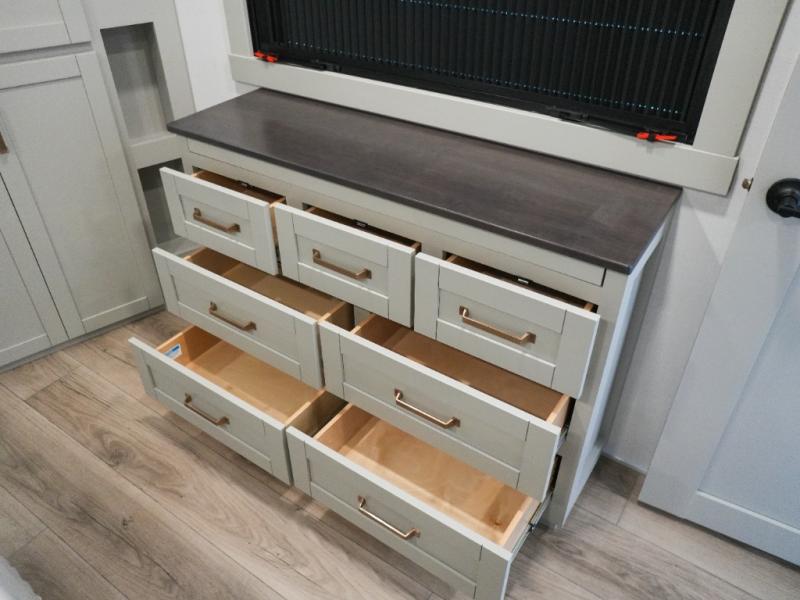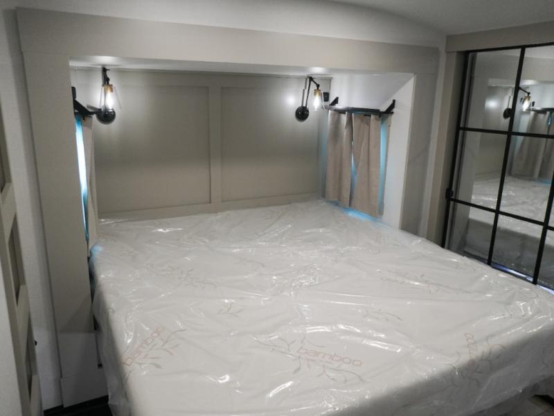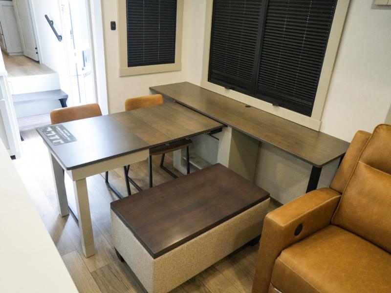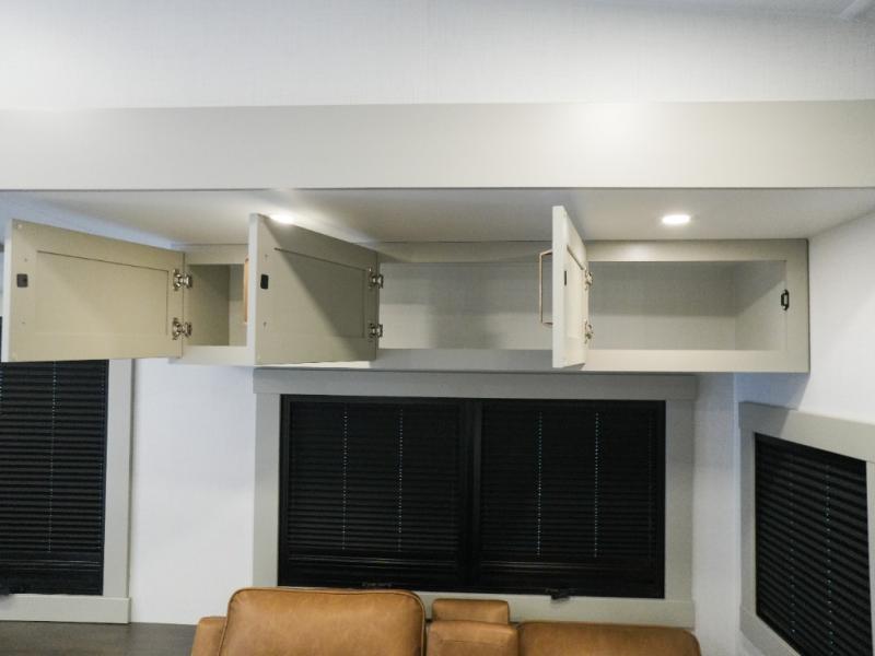 This Model Z luxury fifth wheel is bright and modern on the inside, with loads of amenities that will have you dreaming of your next trip! Enter and find a spacious combined living/kitchen space thanks to dual opposing slides. There is ample seating with a sliding desk/dining table, 62" theater seating, and a 72" tri-fold sofa along the rear wall. You can easily relax and enjoy the 50" Smart telescoping TV with a cozy fireplace below. The kitchen offers all that you need to prepare and cook meals just like home with a 16 cu. ft. refrigerator for your perishables, a 30" microwave oven, and three burner range top and oven. You will love the integrated spice rack, and the kitchen island all outfitted with dog bowls and double pull out trash bins with an integrated Stow 'N Go paper towel holder. There is also an 84" pantry with adjustable shelves for all of your canned and dry goods. Head up the steps to a private master suite with king bed slide. You can opt for the queen bed if you like. A sliding dresser top features hidden storage which is perfect for jewelry and other personal belongings. The front wardrobe features mirrored doors and the corner closet has been prepped for a stackable washer and dryer if you choose to add that option. Relax and enjoy a large bath featuring a linen cabinet, a 30" x 42" shower, and vanity with sink, plus medicine cabinet.