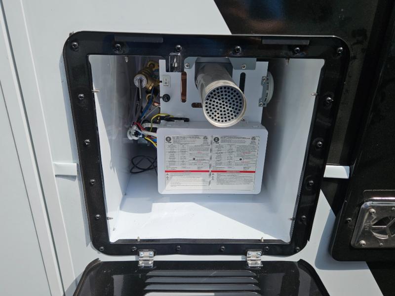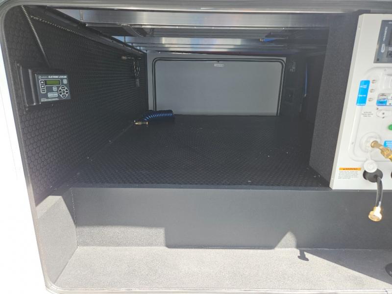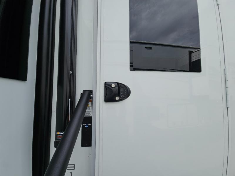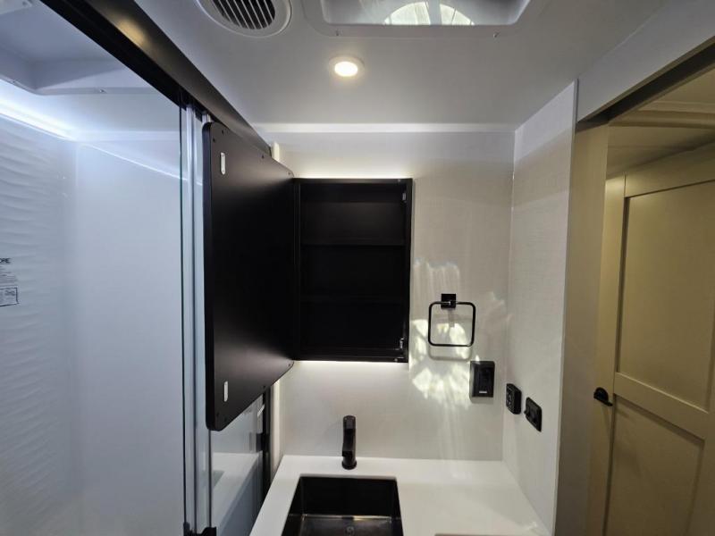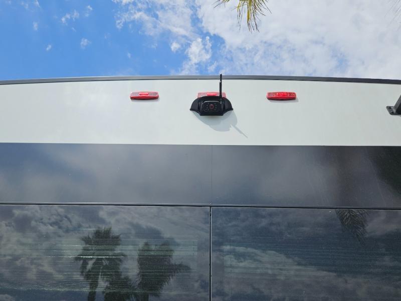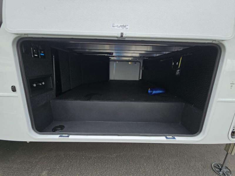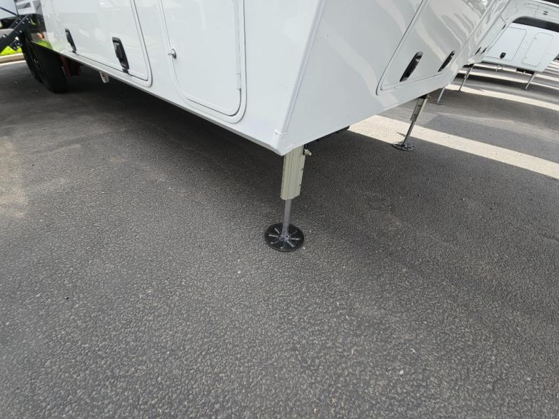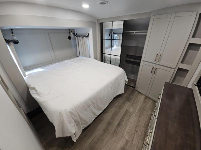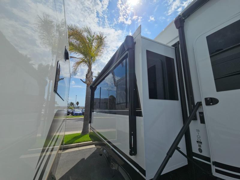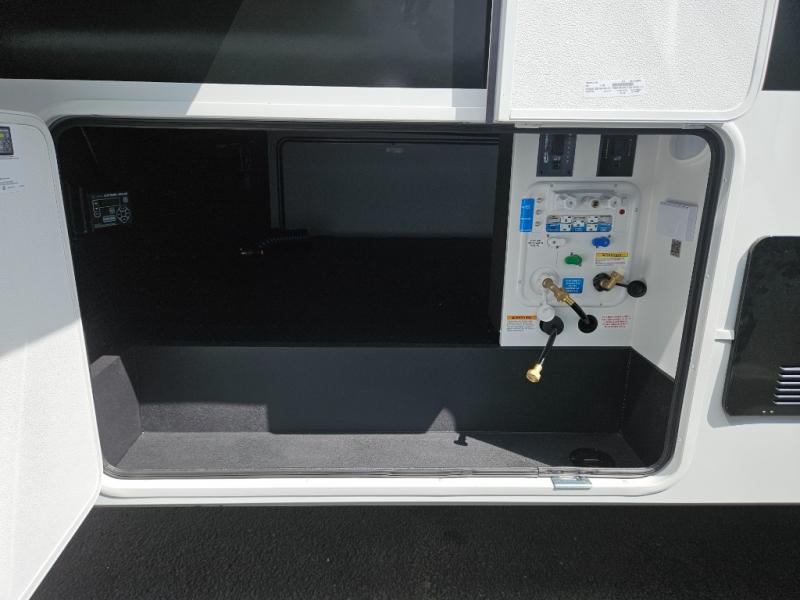 This Model Z luxury fifth wheel is bright and modern on the inside, with loads of amenities that will have you dreaming of your next trip! Enter and find a spacious combined living/kitchen space thanks to dual opposing slides. There is ample seating with a sliding desk/dining table, 62" theater seating, and a 72" tri-fold sofa along the rear wall. You can easily relax and enjoy the 50" Smart telescoping TV with a cozy fireplace below. The kitchen offers all that you need to prepare and cook meals just like home with a 16 cu. ft. refrigerator for your perishables, a 30" microwave oven, and three burner range top and oven. You will love the integrated spice rack, and the kitchen island all outfitted with dog bowls and double pull out trash bins with an integrated Stow 'N Go paper towel holder. There is also an 84" pantry with adjustable shelves for all of your canned and dry goods. Head up the steps to a private master suite with king bed slide. You can opt for the queen bed if you like. A sliding dresser top features hidden storage which is perfect for jewelry and other personal belongings. The front wardrobe features mirrored doors and the corner closet has been prepped for a stackable washer and dryer if you choose to add that option. Relax and enjoy a large bath featuring a linen cabinet, a 30" x 42" shower, and vanity with sink, plus medicine cabinet.