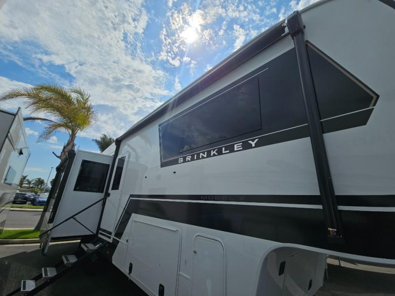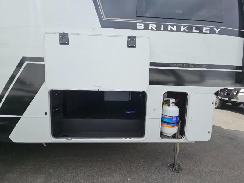 The Brinkley mid-profile Model Z fifth wheels bring you clean lines and an upscale look with plenty of style and exciting new features like the industry first brass plumbing connections. These units also feature an automotive grade front cap, plenty of exterior storage, dual exterior hot and cold showers, and wide stance leveling jacks for easy set up. Residential frameless windows provide a clean look and beautiful views, and ample electrical outlets and 6 USB/USB-C outlets allow all of your electronics and appliances to easily be used and charged.