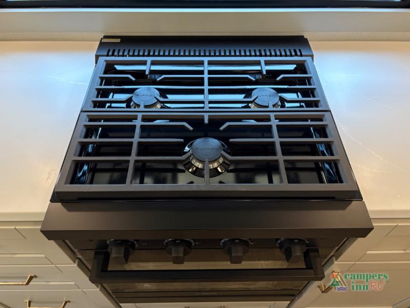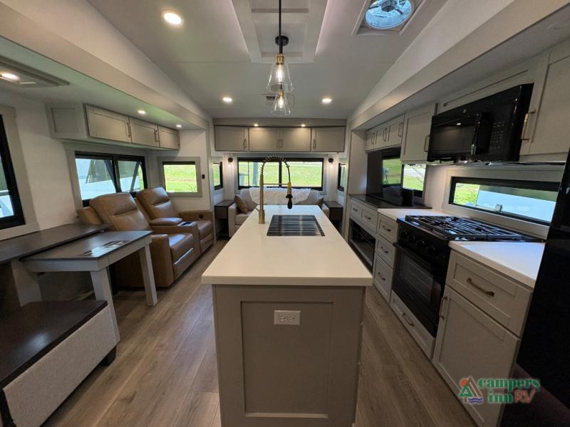Think plush seating, residential-style finishes, and thoughtful design elements that make every inch of space feel open and inviting. The living area is perfect for relaxing after a long day on the road, while the chef-inspired kitchen makes cooking a breeze – whether you're whipping up a quick snack or a full family meal. And don’t even get us started on the spacious bedroom and spa-like bathroom – you might forget you’re camping!