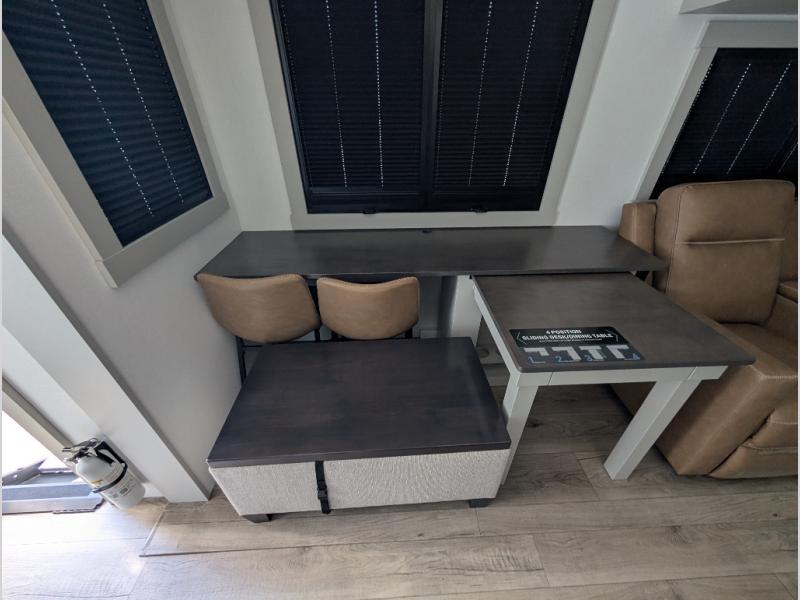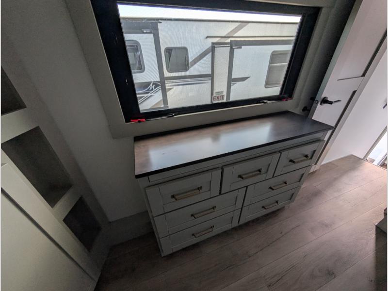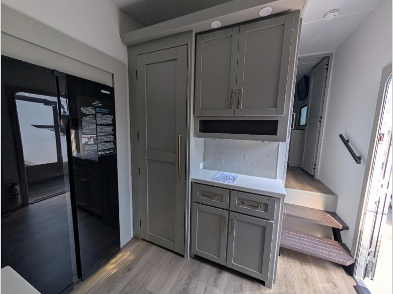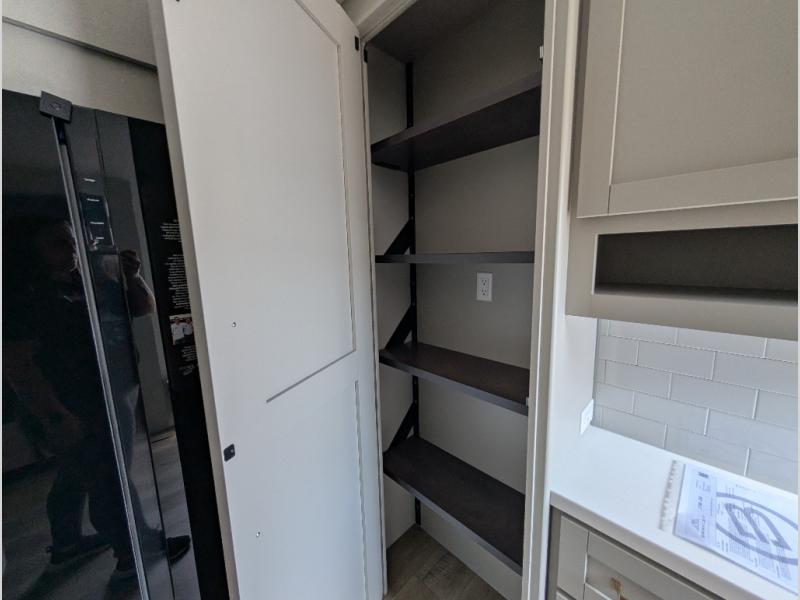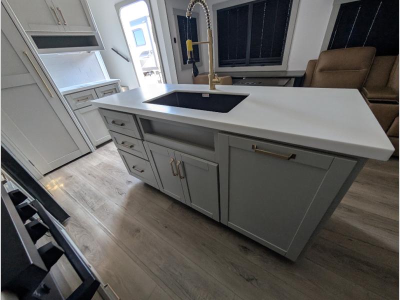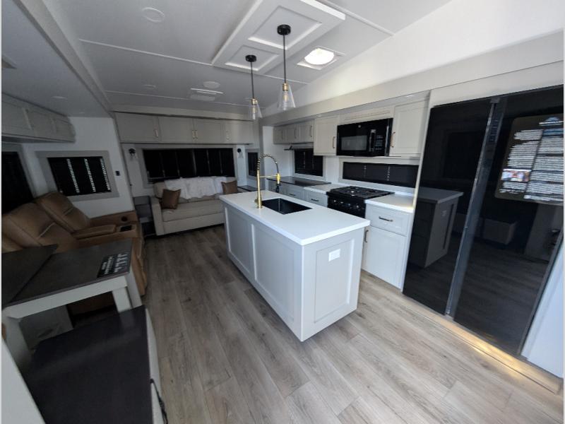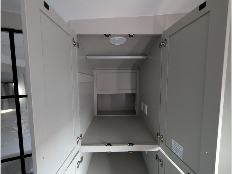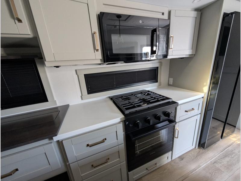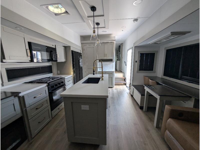 This Model Z luxury fifth wheel is bright and modern on the inside, with loads of amenities that will have you dreaming of your next trip! Enter and find a spacious combined living/kitchen space thanks to dual opposing slides. There is ample seating with a sliding desk/dining table, 62" theater seating, and a 72" tri-fold sofa along the rear wall. You can easily relax and enjoy the 50" Smart telescoping TV with a cozy fireplace below. The kitchen offers all that you need to prepare and cook meals just like home with a 16 cu. ft. refrigerator for your perishables, a 30" microwave oven, and three burner range top and oven. You will love the integrated spice rack, and the kitchen island all outfitted with dog bowls and double pull out trash bins with an integrated Stow 'N Go paper towel holder. There is also an 84" pantry with adjustable shelves for all of your canned and dry goods. Head up the steps to a private master suite with king bed slide. You can opt for the queen bed if you like. A sliding dresser top features hidden storage which is perfect for jewelry and other personal belongings. The front wardrobe features mirrored doors and the corner closet has been prepped for a stackable washer and dryer if you choose to add that option. Relax and enjoy a large bath featuring a linen cabinet, a 30" x 42" shower, and vanity with sink, plus medicine cabinet.