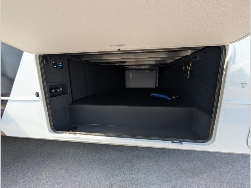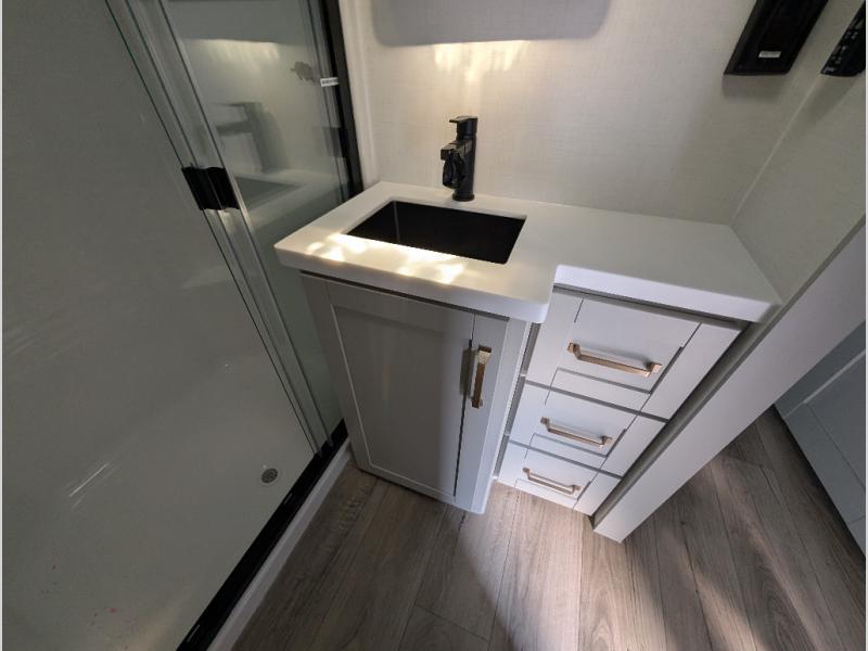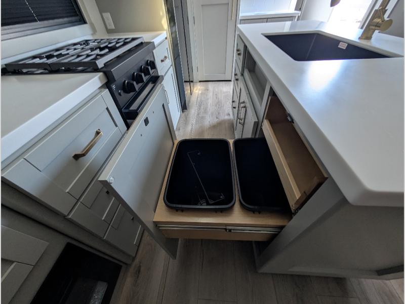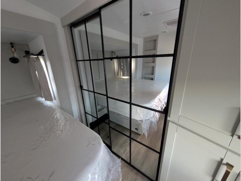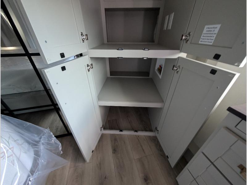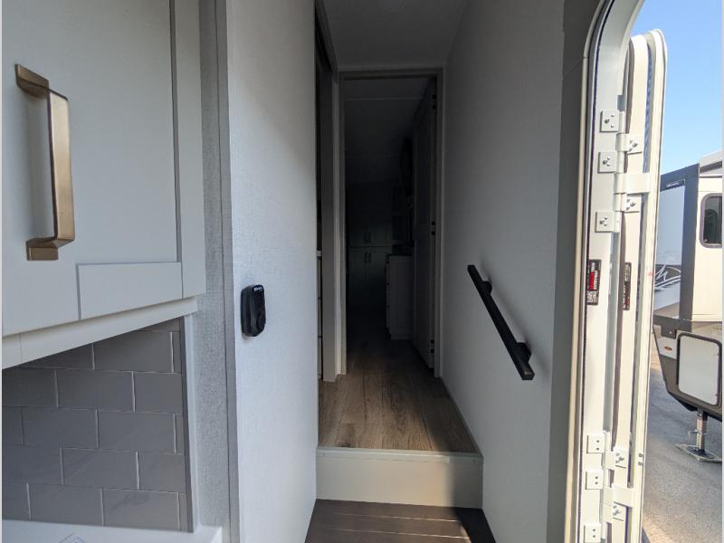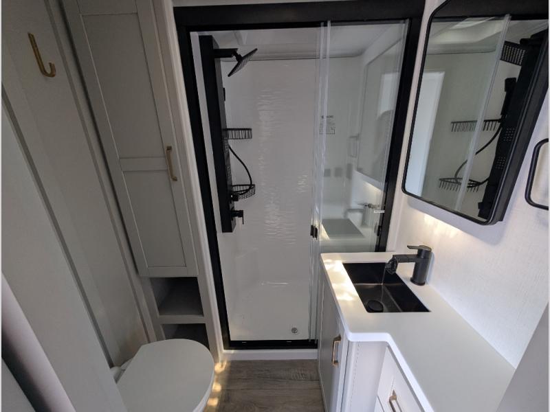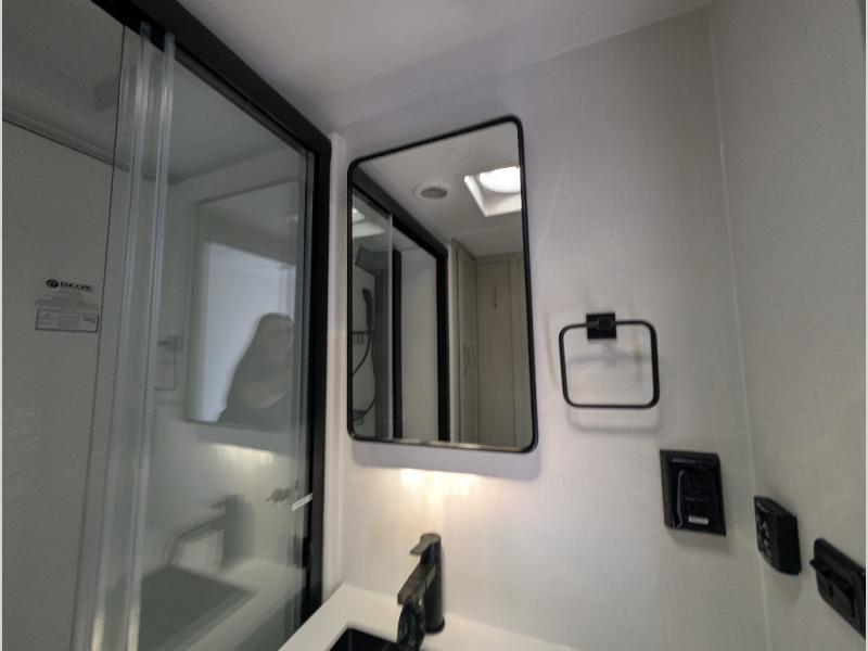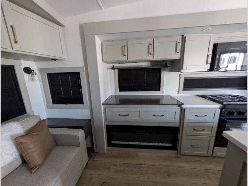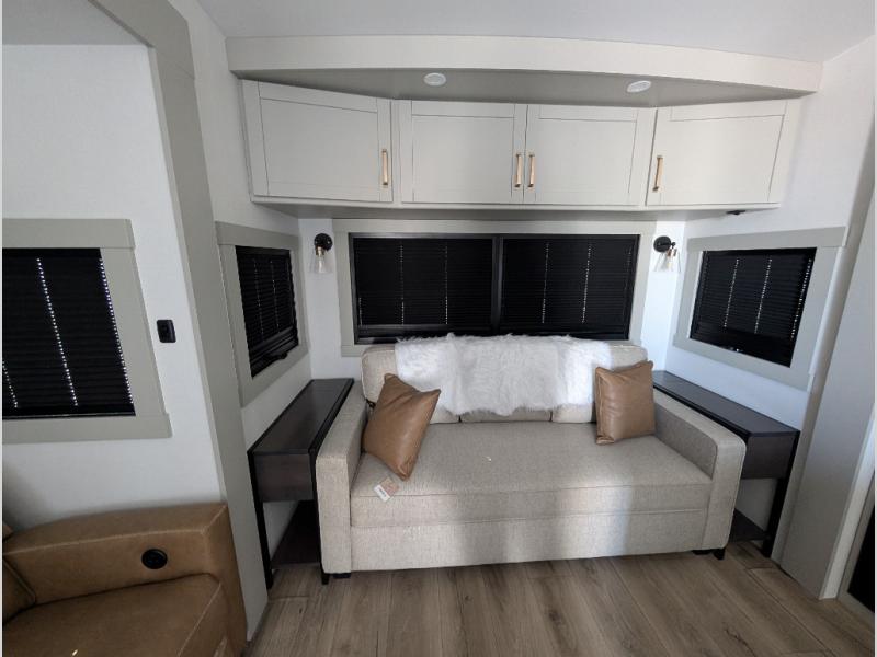 This Model Z luxury fifth wheel is bright and modern on the inside, with loads of amenities that will have you dreaming of your next trip! Enter and find a spacious combined living/kitchen space thanks to dual opposing slides. There is ample seating with a sliding desk/dining table, 62" theater seating, and a 72" tri-fold sofa along the rear wall. You can easily relax and enjoy the 50" Smart telescoping TV with a cozy fireplace below. The kitchen offers all that you need to prepare and cook meals just like home with a 16 cu. ft. refrigerator for your perishables, a 30" microwave oven, and three burner range top and oven. You will love the integrated spice rack, and the kitchen island all outfitted with dog bowls and double pull out trash bins with an integrated Stow 'N Go paper towel holder. There is also an 84" pantry with adjustable shelves for all of your canned and dry goods. Head up the steps to a private master suite with king bed slide. You can opt for the queen bed if you like. A sliding dresser top features hidden storage which is perfect for jewelry and other personal belongings. The front wardrobe features mirrored doors and the corner closet has been prepped for a stackable washer and dryer if you choose to add that option. Relax and enjoy a large bath featuring a linen cabinet, a 30" x 42" shower, and vanity with sink, plus medicine cabinet.
