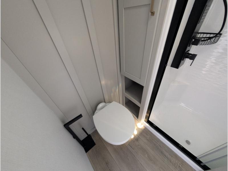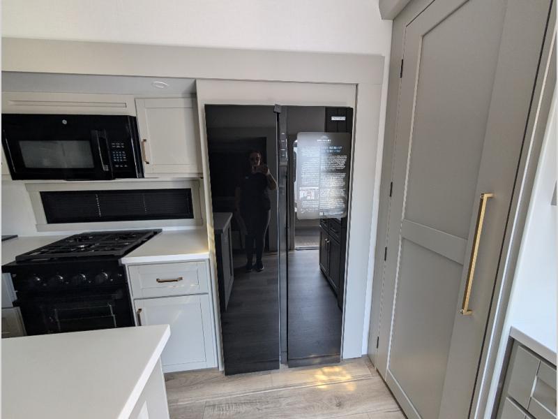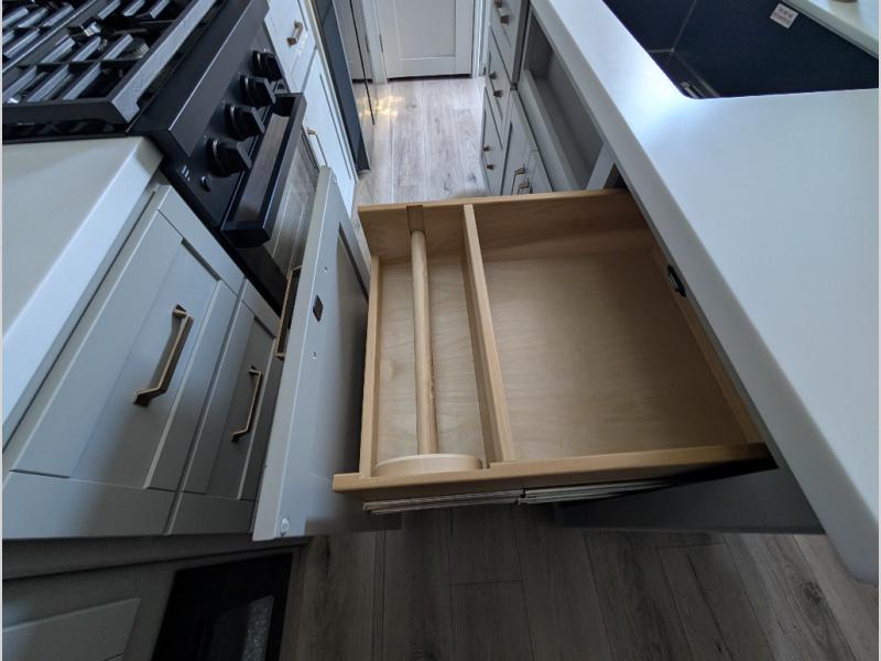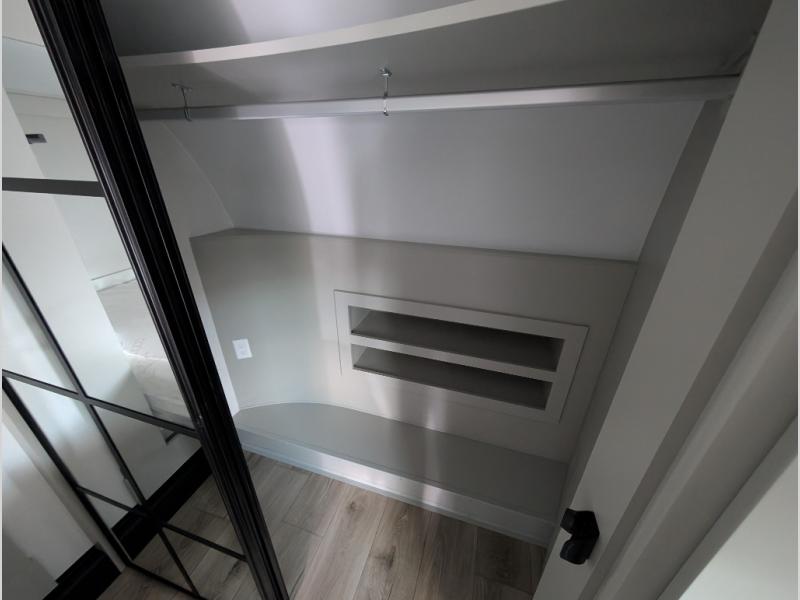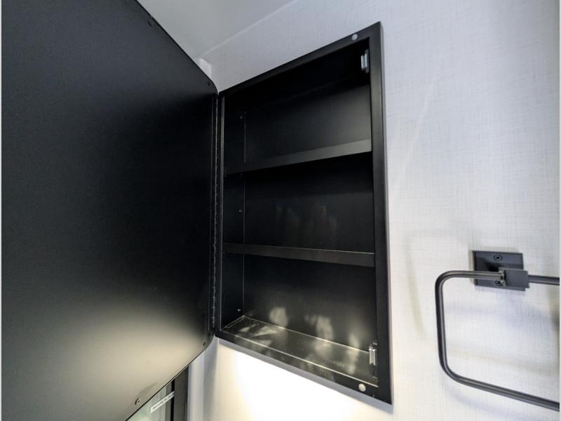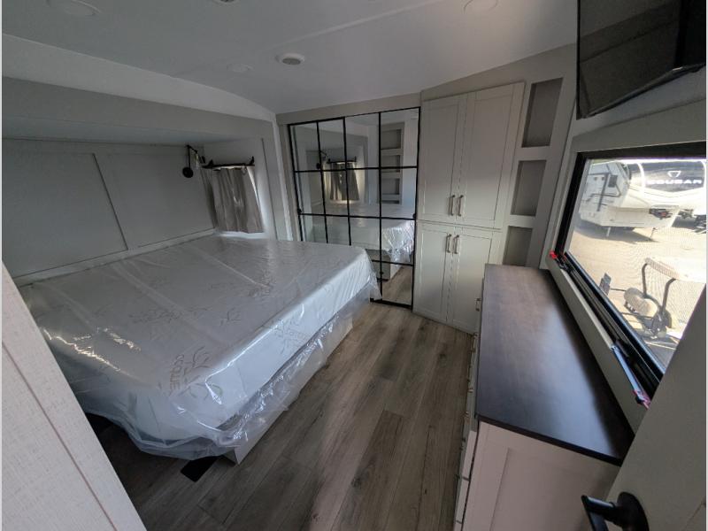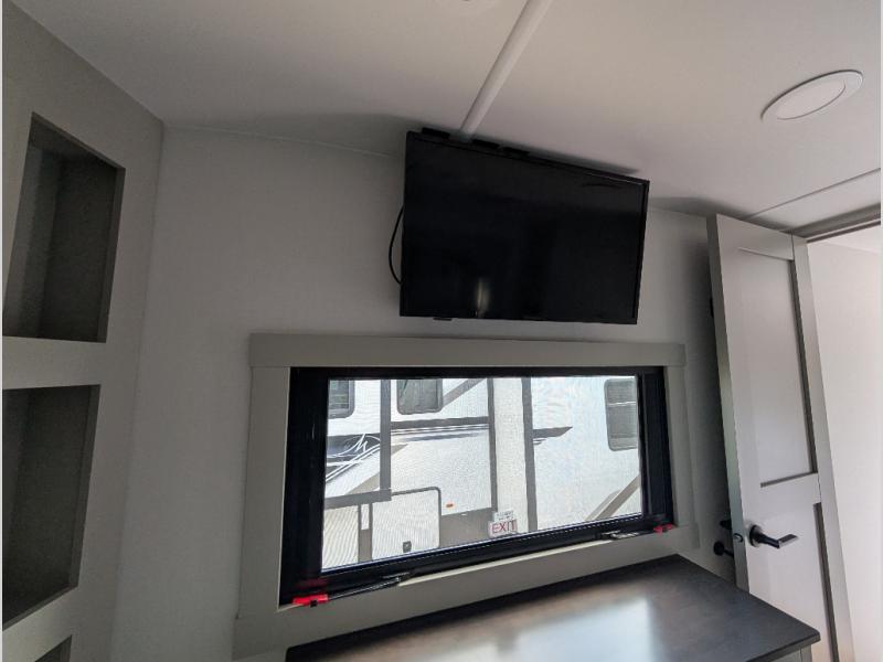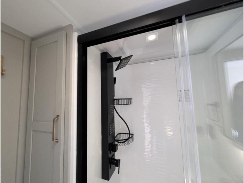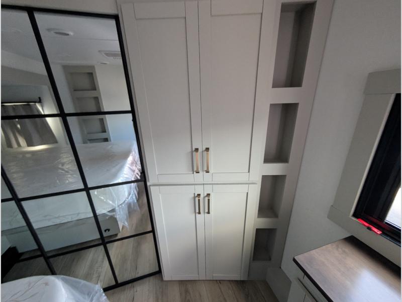 This Model Z luxury fifth wheel is bright and modern on the inside, with loads of amenities that will have you dreaming of your next trip! Enter and find a spacious combined living/kitchen space thanks to dual opposing slides. There is ample seating with a sliding desk/dining table, 62" theater seating, and a 72" tri-fold sofa along the rear wall. You can easily relax and enjoy the 50" Smart telescoping TV with a cozy fireplace below. The kitchen offers all that you need to prepare and cook meals just like home with a 16 cu. ft. refrigerator for your perishables, a 30" microwave oven, and three burner range top and oven. You will love the integrated spice rack, and the kitchen island all outfitted with dog bowls and double pull out trash bins with an integrated Stow 'N Go paper towel holder. There is also an 84" pantry with adjustable shelves for all of your canned and dry goods. Head up the steps to a private master suite with king bed slide. You can opt for the queen bed if you like. A sliding dresser top features hidden storage which is perfect for jewelry and other personal belongings. The front wardrobe features mirrored doors and the corner closet has been prepped for a stackable washer and dryer if you choose to add that option. Relax and enjoy a large bath featuring a linen cabinet, a 30" x 42" shower, and vanity with sink, plus medicine cabinet.