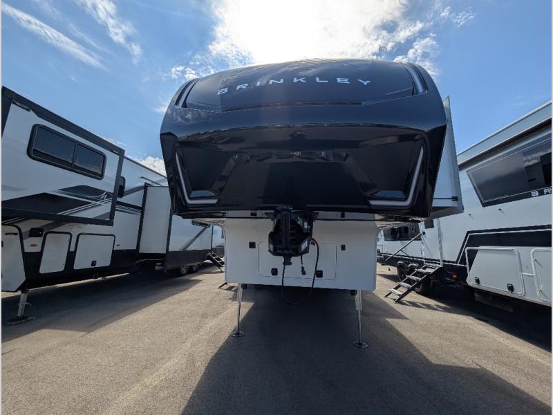 The Brinkley mid-profile Model Z fifth wheels bring you clean lines and an upscale look with plenty of style and exciting new features like the industry first brass plumbing connections. These units also feature an automotive grade front cap, plenty of exterior storage, dual exterior hot and cold showers, and wide stance leveling jacks for easy set up. Residential frameless windows provide a clean look and beautiful views, and ample electrical outlets and 6 USB/USB-C outlets allow all of your electronics and appliances to easily be used and charged.