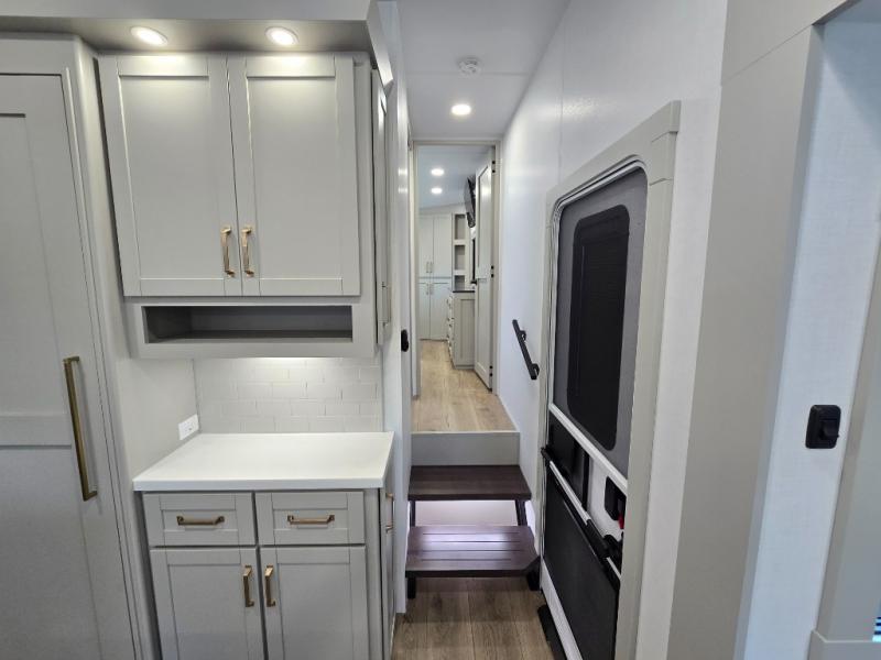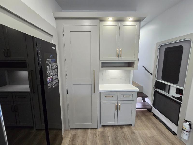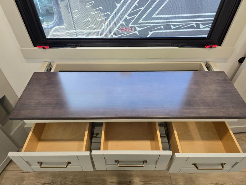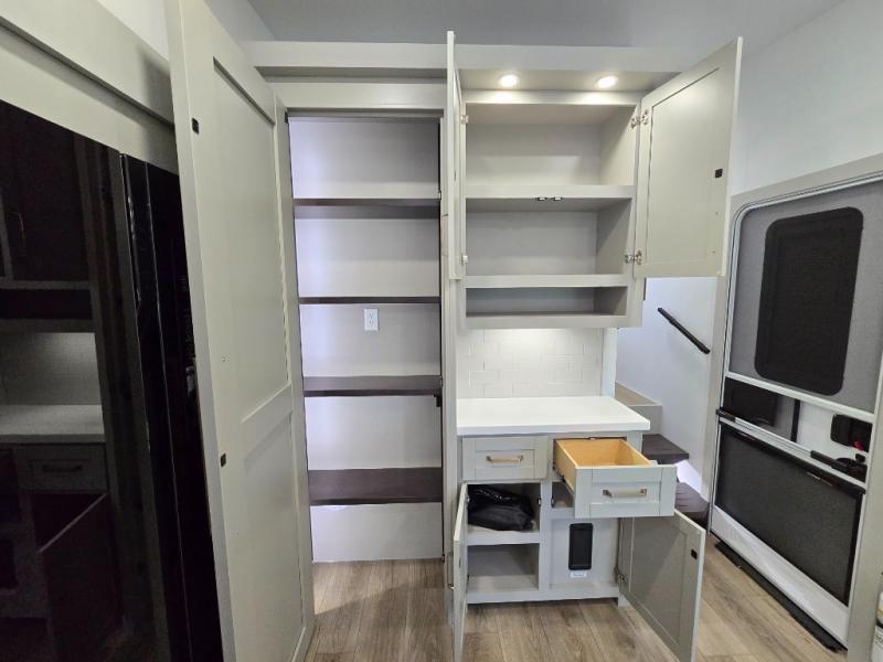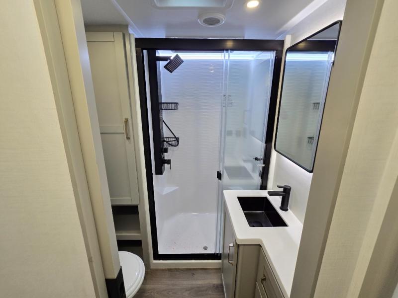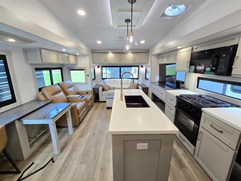 This Model Z luxury fifth wheel is bright and modern on the inside, with loads of amenities that will have you dreaming of your next trip! Enter and find a spacious combined living/kitchen space thanks to dual opposing slides. There is ample seating with a sliding desk/dining table, 62" theater seating, and a 72" tri-fold sofa along the rear wall. You can easily relax and enjoy the 50" Smart telescoping TV with a cozy fireplace below. The kitchen offers all that you need to prepare and cook meals just like home with a 16 cu. ft. refrigerator for your perishables, a 30" microwave oven, and three burner range top and oven. You will love the integrated spice rack, and the kitchen island all outfitted with dog bowls and double pull out trash bins with an integrated Stow 'N Go paper towel holder. There is also an 84" pantry with adjustable shelves for all of your canned and dry goods. Head up the steps to a private master suite with king bed slide. You can opt for the queen bed if you like. A sliding dresser top features hidden storage which is perfect for jewelry and other personal belongings. The front wardrobe features mirrored doors and the corner closet has been prepped for a stackable washer and dryer if you choose to add that option. Relax and enjoy a large bath featuring a linen cabinet, a 30" x 42" shower, and vanity with sink, plus medicine cabinet.