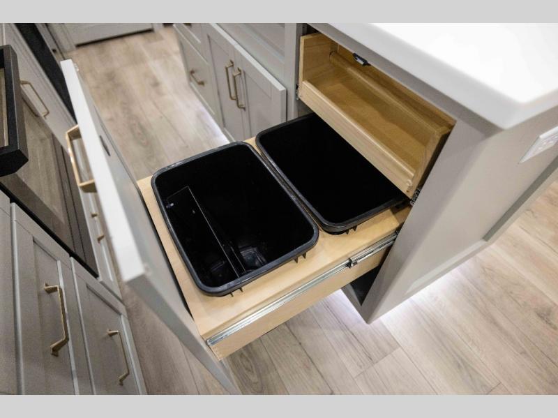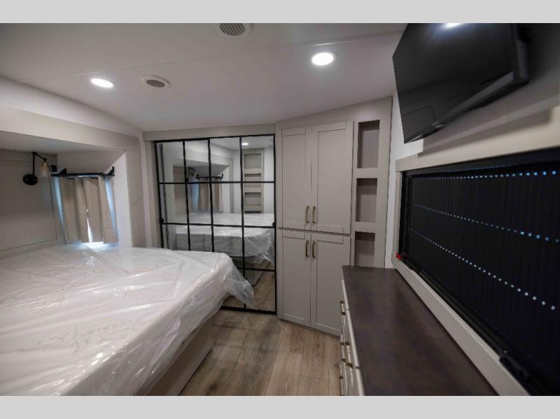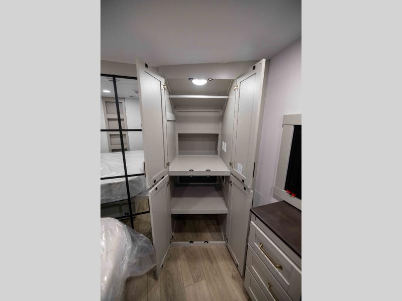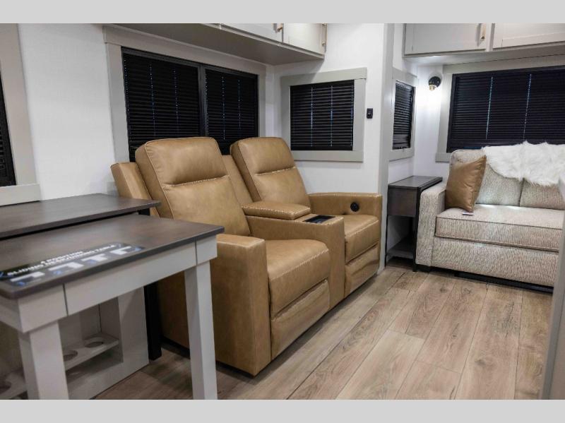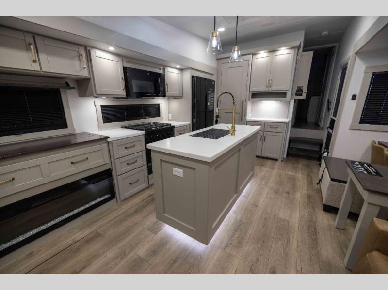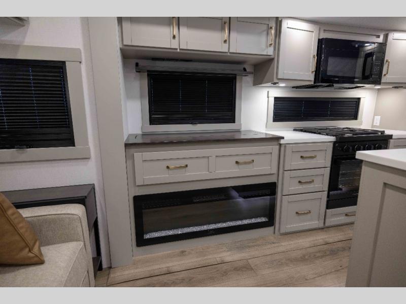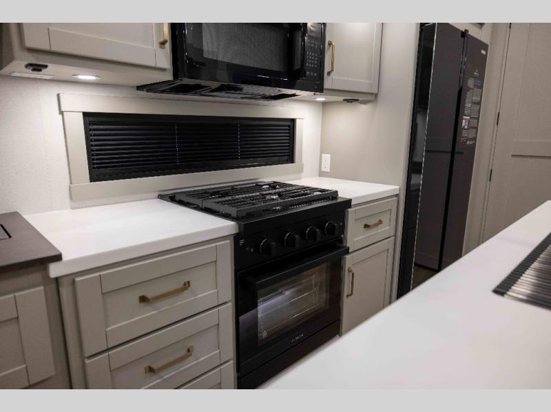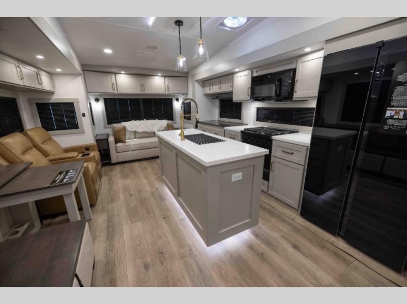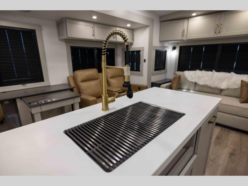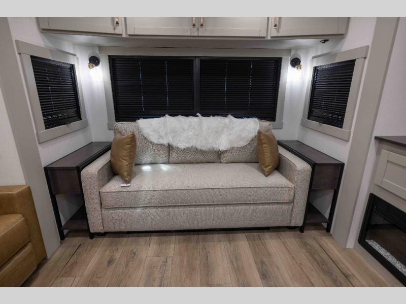 This Model Z luxury fifth wheel is bright and modern on the inside, with loads of amenities that will have you dreaming of your next trip! Enter and find a spacious combined living/kitchen space thanks to dual opposing slides. There is ample seating with a sliding desk/dining table, 62" theater seating, and a 72" tri-fold sofa along the rear wall. You can easily relax and enjoy the 50" Smart telescoping TV with a cozy fireplace below. The kitchen offers all that you need to prepare and cook meals just like home with a 16 cu. ft. refrigerator for your perishables, a 30" microwave oven, and three burner range top and oven. You will love the integrated spice rack, and the kitchen island all outfitted with dog bowls and double pull out trash bins with an integrated Stow 'N Go paper towel holder. There is also an 84" pantry with adjustable shelves for all of your canned and dry goods. Head up the steps to a private master suite with king bed slide. You can opt for the queen bed if you like. A sliding dresser top features hidden storage which is perfect for jewelry and other personal belongings. The front wardrobe features mirrored doors and the corner closet has been prepped for a stackable washer and dryer if you choose to add that option. Relax and enjoy a large bath featuring a linen cabinet, a 30" x 42" shower, and vanity with sink, plus medicine cabinet.