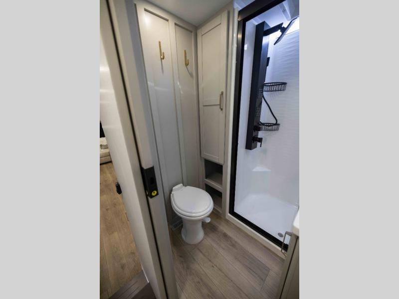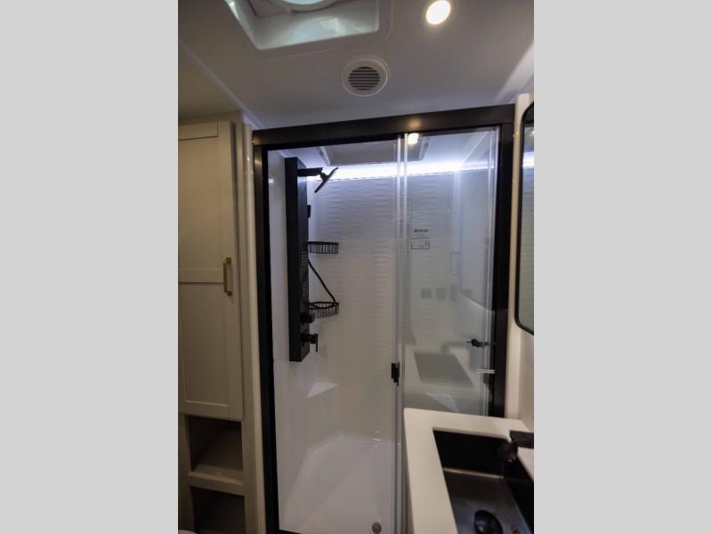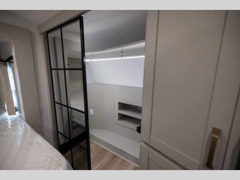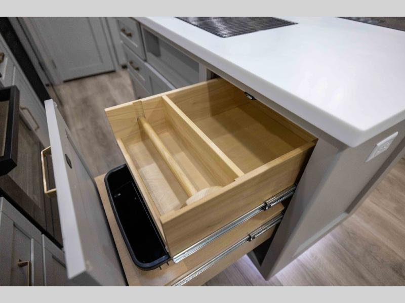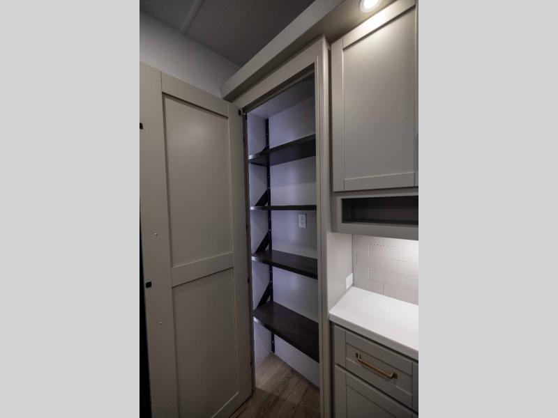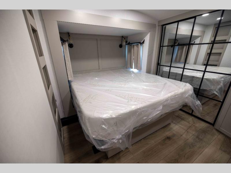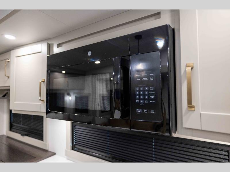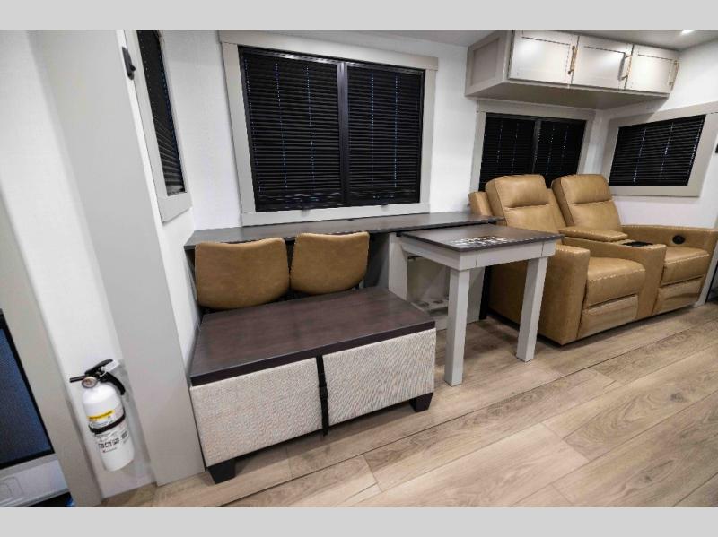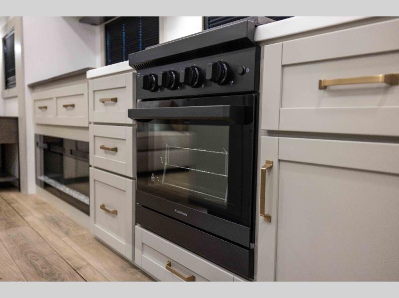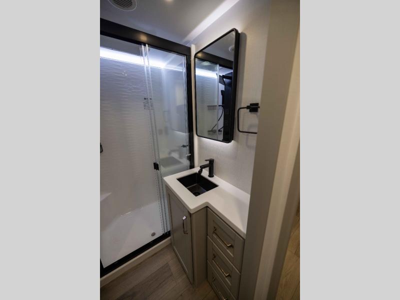 This Model Z luxury fifth wheel is bright and modern on the inside, with loads of amenities that will have you dreaming of your next trip! Enter and find a spacious combined living/kitchen space thanks to dual opposing slides. There is ample seating with a sliding desk/dining table, 62" theater seating, and a 72" tri-fold sofa along the rear wall. You can easily relax and enjoy the 50" Smart telescoping TV with a cozy fireplace below. The kitchen offers all that you need to prepare and cook meals just like home with a 16 cu. ft. refrigerator for your perishables, a 30" microwave oven, and three burner range top and oven. You will love the integrated spice rack, and the kitchen island all outfitted with dog bowls and double pull out trash bins with an integrated Stow 'N Go paper towel holder. There is also an 84" pantry with adjustable shelves for all of your canned and dry goods. Head up the steps to a private master suite with king bed slide. You can opt for the queen bed if you like. A sliding dresser top features hidden storage which is perfect for jewelry and other personal belongings. The front wardrobe features mirrored doors and the corner closet has been prepped for a stackable washer and dryer if you choose to add that option. Relax and enjoy a large bath featuring a linen cabinet, a 30" x 42" shower, and vanity with sink, plus medicine cabinet.