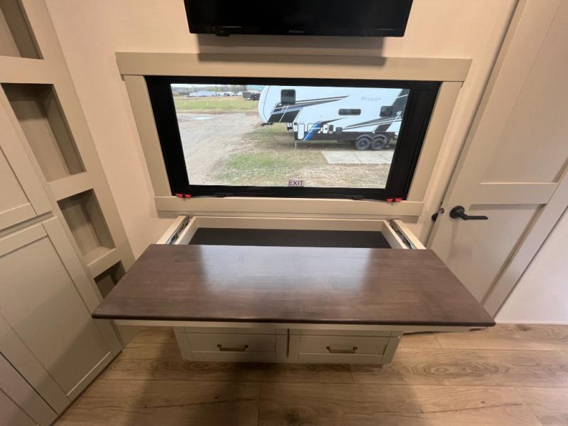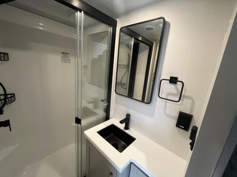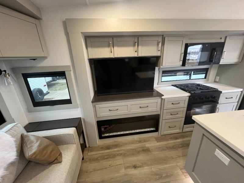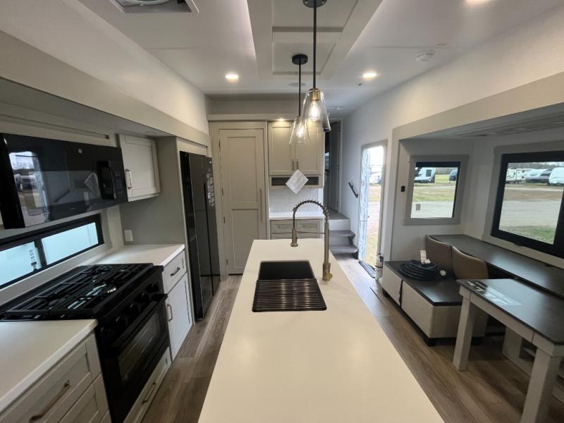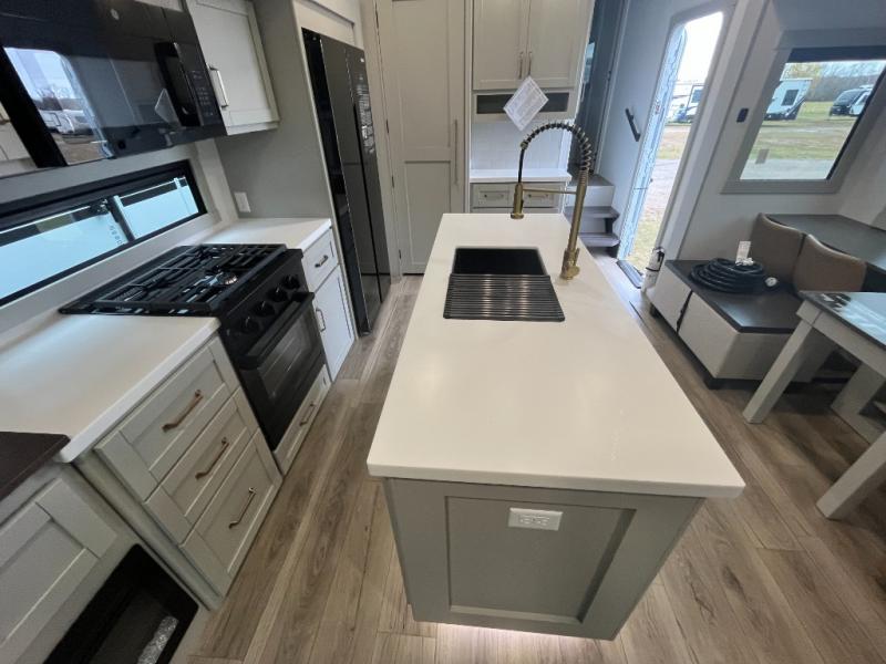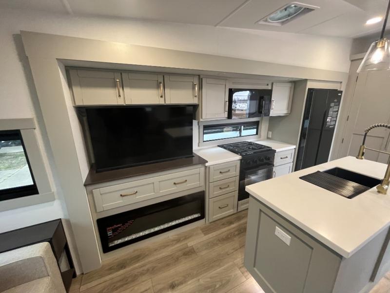 This Model Z luxury fifth wheel is bright and modern on the inside, with loads of amenities that will have you dreaming of your next trip! Enter and find a spacious combined living/kitchen space thanks to dual opposing slides. There is ample seating with a sliding desk/dining table, 62" theater seating, and a 72" tri-fold sofa along the rear wall. You can easily relax and enjoy the 50" Smart telescoping TV with a cozy fireplace below. The kitchen offers all that you need to prepare and cook meals just like home with a 16 cu. ft. refrigerator for your perishables, a 30" microwave oven, and three burner range top and oven. You will love the integrated spice rack, and the kitchen island all outfitted with dog bowls and double pull out trash bins with an integrated Stow 'N Go paper towel holder. There is also an 84" pantry with adjustable shelves for all of your canned and dry goods. Head up the steps to a private master suite with king bed slide. You can opt for the queen bed if you like. A sliding dresser top features hidden storage which is perfect for jewelry and other personal belongings. The front wardrobe features mirrored doors and the corner closet has been prepped for a stackable washer and dryer if you choose to add that option. Relax and enjoy a large bath featuring a linen cabinet, a 30" x 42" shower, and vanity with sink, plus medicine cabinet.