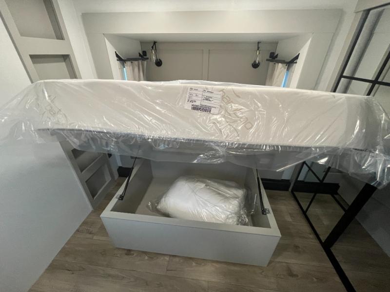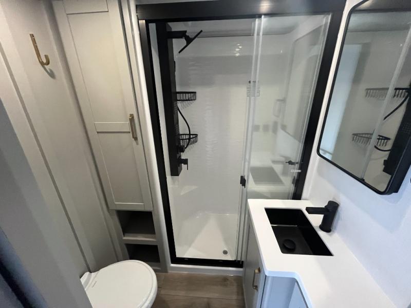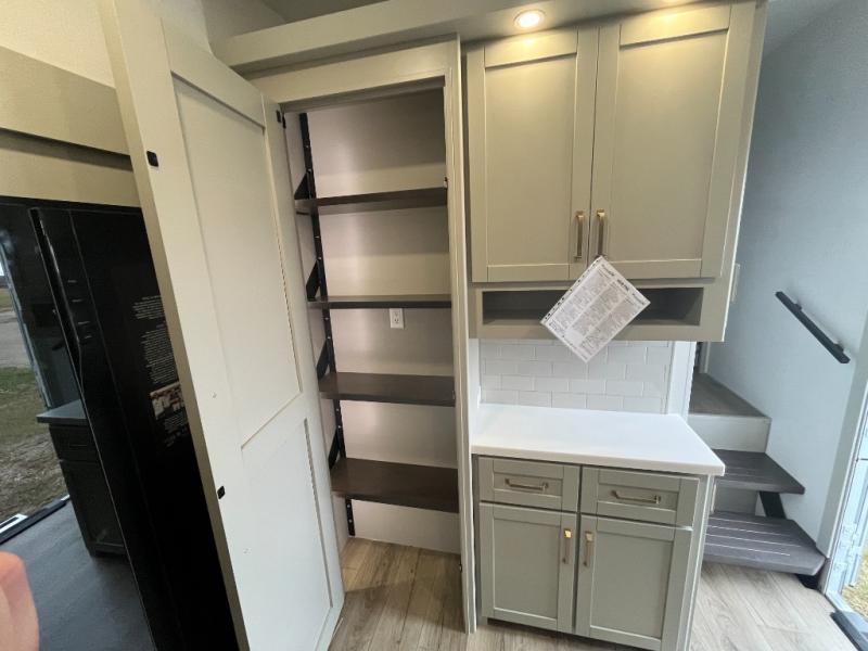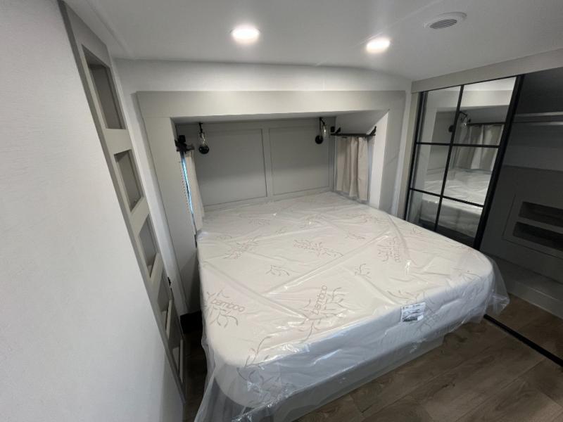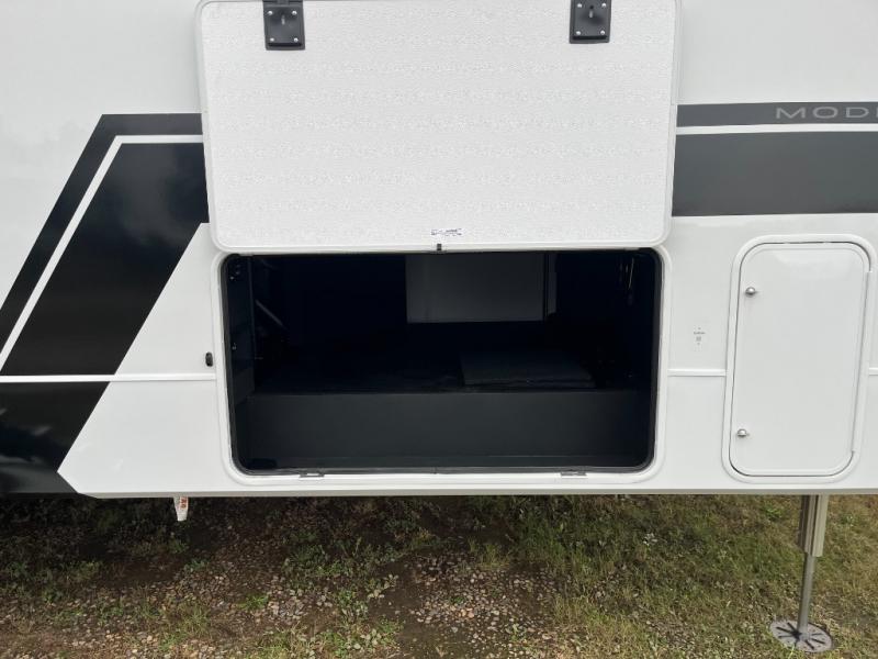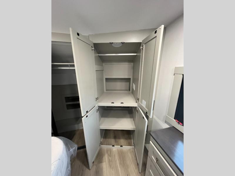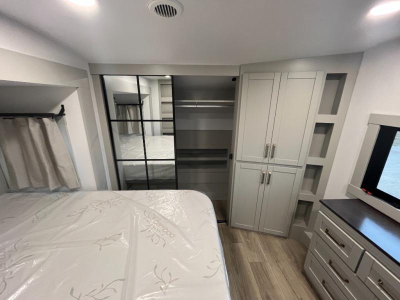 This Model Z luxury fifth wheel is bright and modern on the inside, with loads of amenities that will have you dreaming of your next trip! Enter and find a spacious combined living/kitchen space thanks to dual opposing slides. There is ample seating with a sliding desk/dining table, 62" theater seating, and a 72" tri-fold sofa along the rear wall. You can easily relax and enjoy the 50" Smart telescoping TV with a cozy fireplace below. The kitchen offers all that you need to prepare and cook meals just like home with a 16 cu. ft. refrigerator for your perishables, a 30" microwave oven, and three burner range top and oven. You will love the integrated spice rack, and the kitchen island all outfitted with dog bowls and double pull out trash bins with an integrated Stow 'N Go paper towel holder. There is also an 84" pantry with adjustable shelves for all of your canned and dry goods. Head up the steps to a private master suite with king bed slide. You can opt for the queen bed if you like. A sliding dresser top features hidden storage which is perfect for jewelry and other personal belongings. The front wardrobe features mirrored doors and the corner closet has been prepped for a stackable washer and dryer if you choose to add that option. Relax and enjoy a large bath featuring a linen cabinet, a 30" x 42" shower, and vanity with sink, plus medicine cabinet.