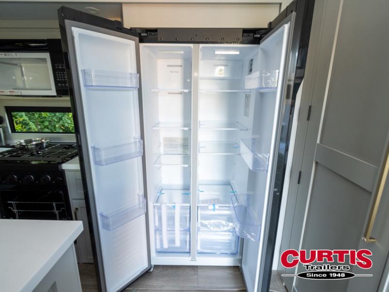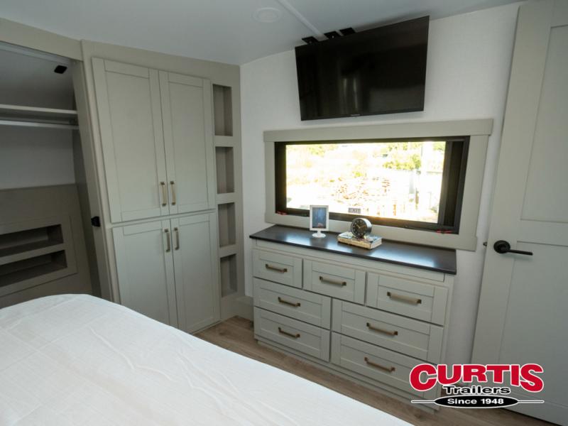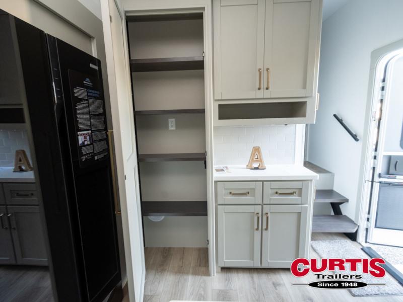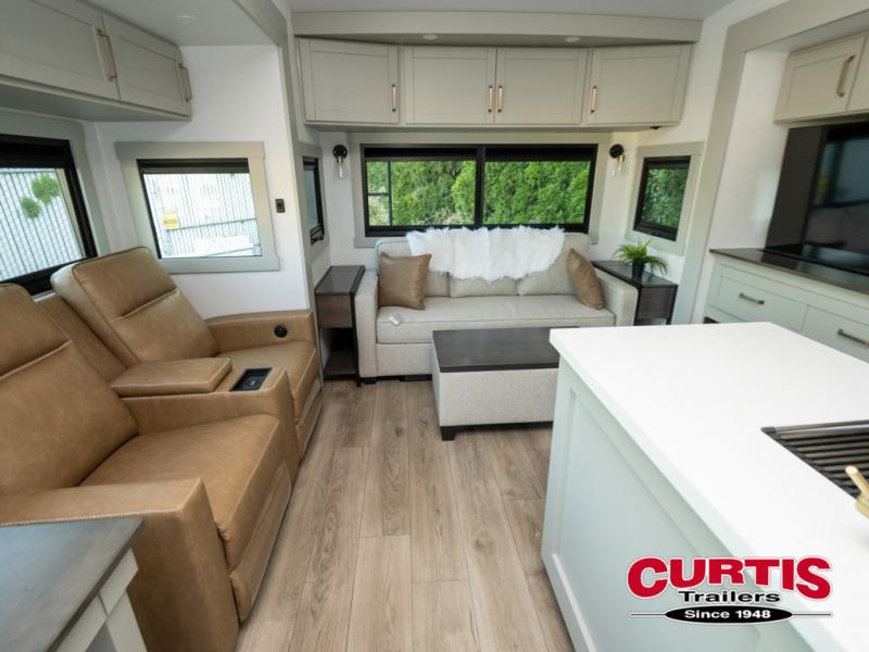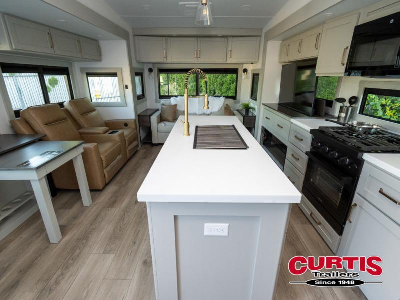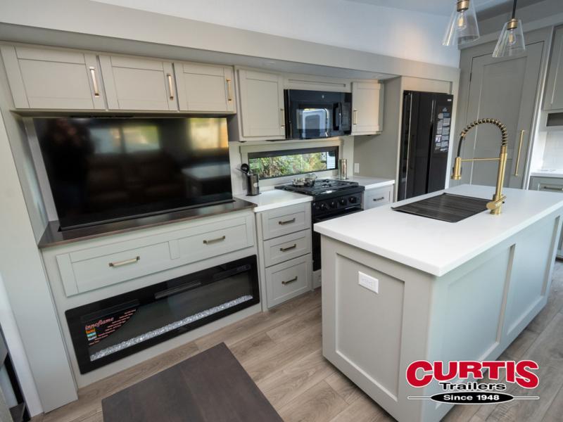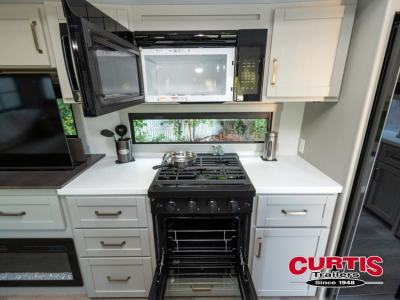 This Model Z luxury fifth wheel is bright and modern on the inside, with loads of amenities that will have you dreaming of your next trip! Enter and find a spacious combined living/kitchen space thanks to dual opposing slides. There is ample seating with a sliding desk/dining table, 62" theater seating, and a 72" tri-fold sofa along the rear wall. You can easily relax and enjoy the 50" Smart telescoping TV with a cozy fireplace below. The kitchen offers all that you need to prepare and cook meals just like home with a 16 cu. ft. refrigerator for your perishables, a 30" microwave oven, and three burner range top and oven. You will love the integrated spice rack, and the kitchen island all outfitted with dog bowls and double pull out trash bins with an integrated Stow 'N Go paper towel holder. There is also an 84" pantry with adjustable shelves for all of your canned and dry goods. Head up the steps to a private master suite with king bed slide. You can opt for the queen bed if you like. A sliding dresser top features hidden storage which is perfect for jewelry and other personal belongings. The front wardrobe features mirrored doors and the corner closet has been prepped for a stackable washer and dryer if you choose to add that option. Relax and enjoy a large bath featuring a linen cabinet, a 30" x 42" shower, and vanity with sink, plus medicine cabinet.