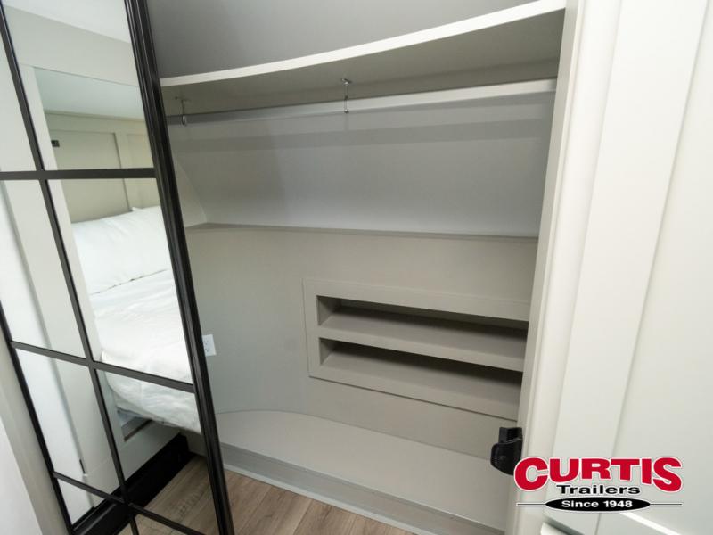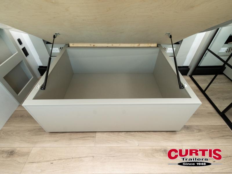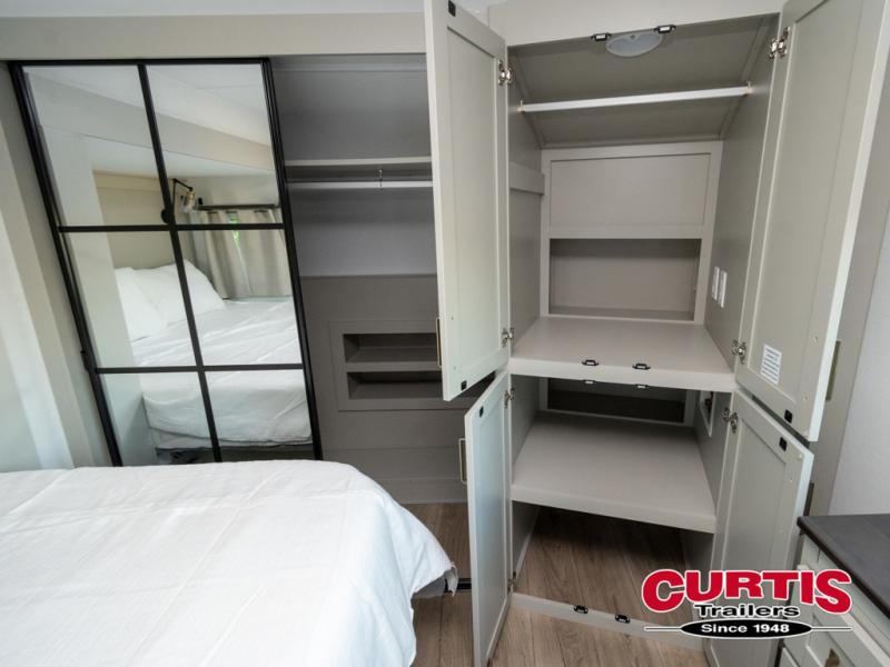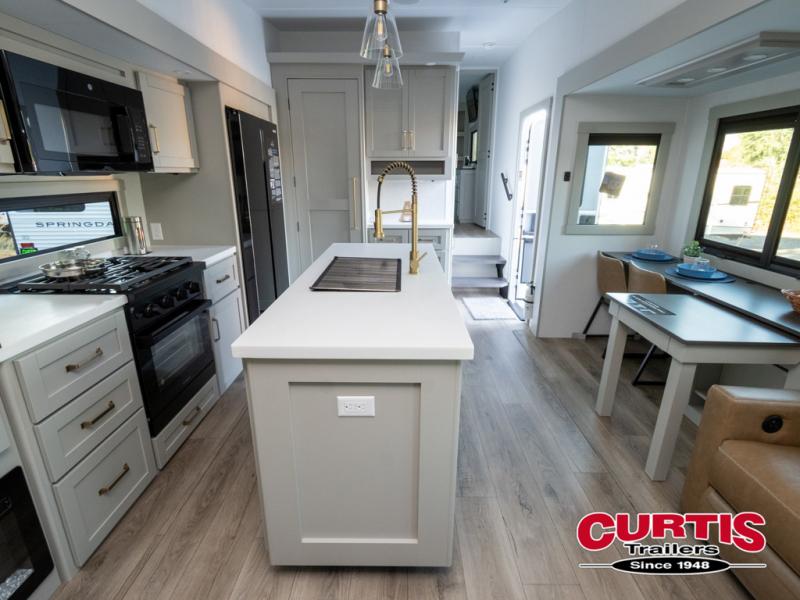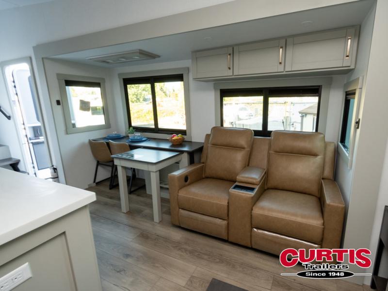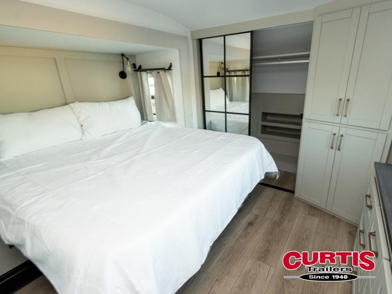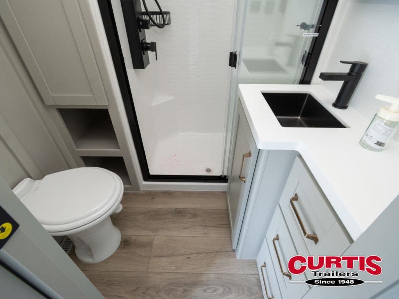 This Model Z luxury fifth wheel is bright and modern on the inside, with loads of amenities that will have you dreaming of your next trip! Enter and find a spacious combined living/kitchen space thanks to dual opposing slides. There is ample seating with a sliding desk/dining table, 62" theater seating, and a 72" tri-fold sofa along the rear wall. You can easily relax and enjoy the 50" Smart telescoping TV with a cozy fireplace below. The kitchen offers all that you need to prepare and cook meals just like home with a 16 cu. ft. refrigerator for your perishables, a 30" microwave oven, and three burner range top and oven. You will love the integrated spice rack, and the kitchen island all outfitted with dog bowls and double pull out trash bins with an integrated Stow 'N Go paper towel holder. There is also an 84" pantry with adjustable shelves for all of your canned and dry goods. Head up the steps to a private master suite with king bed slide. You can opt for the queen bed if you like. A sliding dresser top features hidden storage which is perfect for jewelry and other personal belongings. The front wardrobe features mirrored doors and the corner closet has been prepped for a stackable washer and dryer if you choose to add that option. Relax and enjoy a large bath featuring a linen cabinet, a 30" x 42" shower, and vanity with sink, plus medicine cabinet.