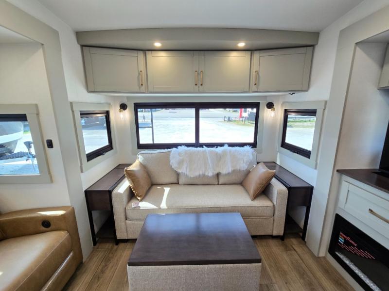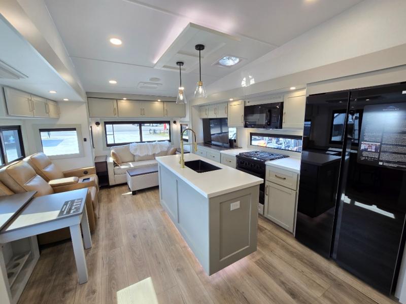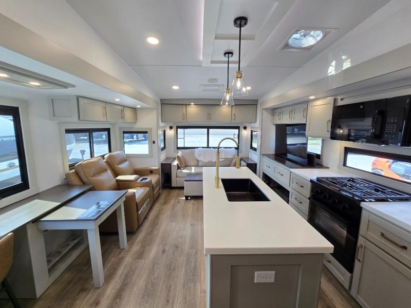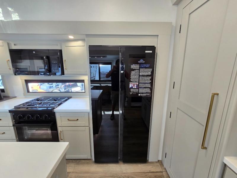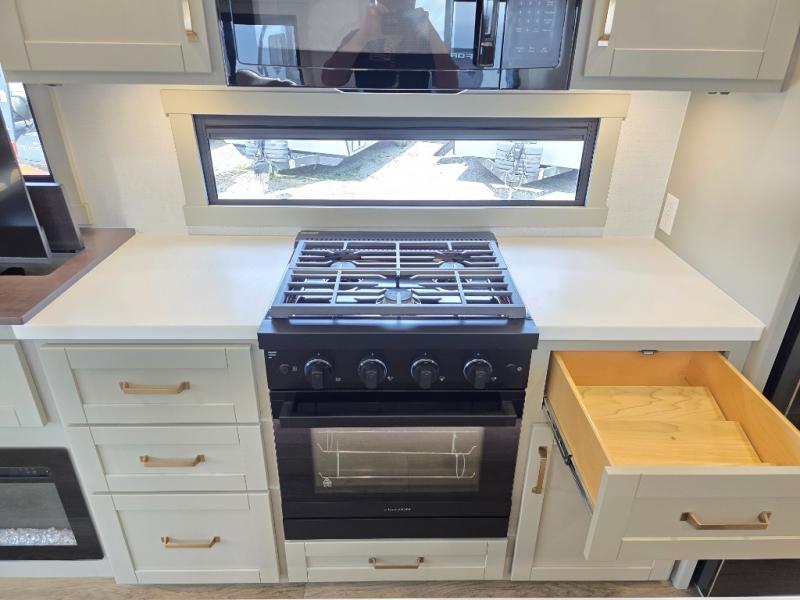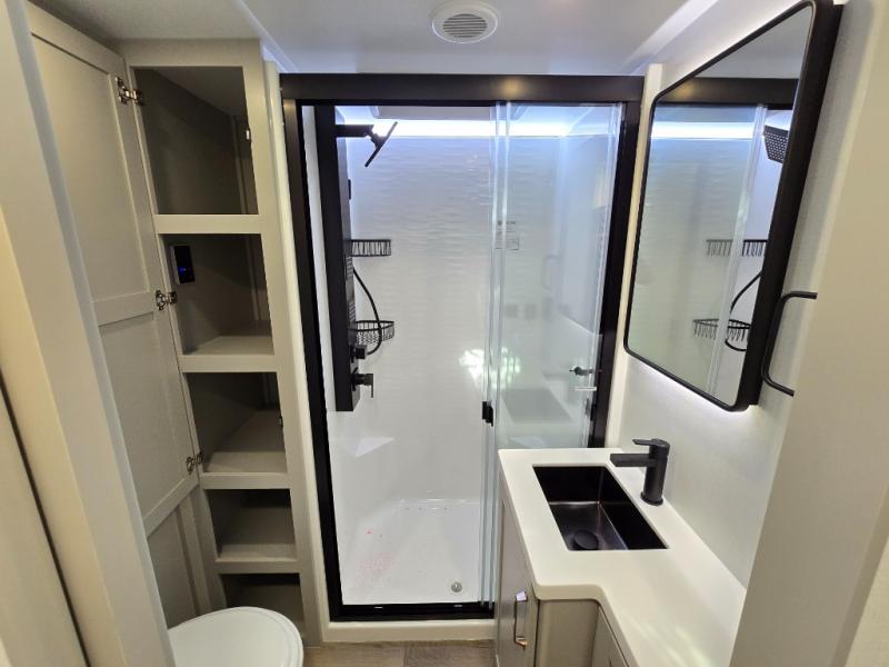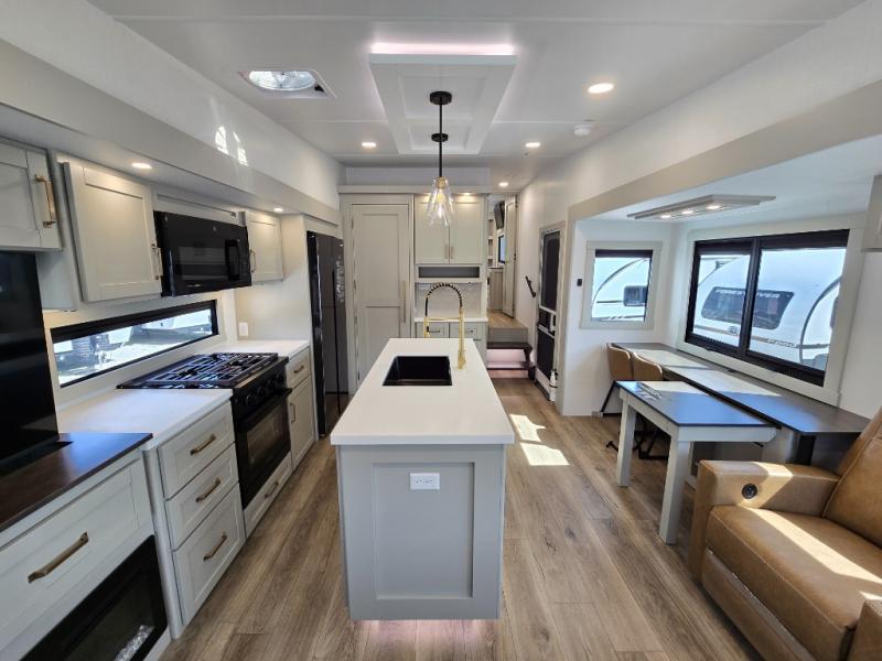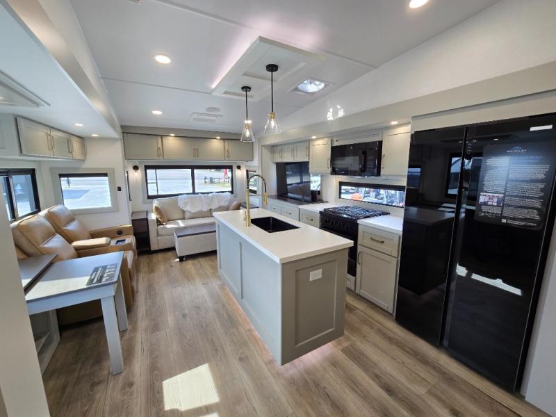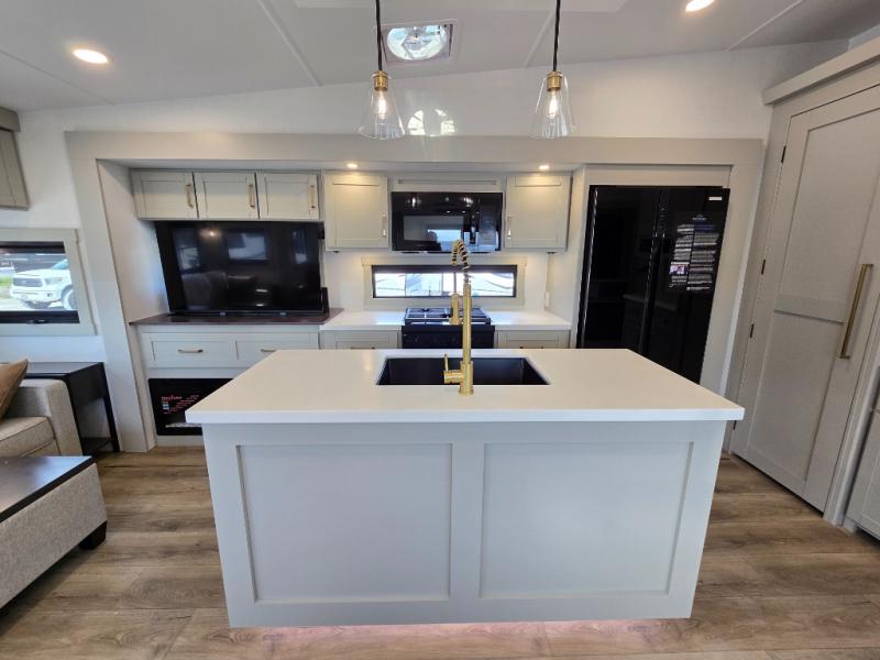 This Model Z luxury fifth wheel is bright and modern on the inside, with loads of amenities that will have you dreaming of your next trip! Enter and find a spacious combined living/kitchen space thanks to dual opposing slides. There is ample seating with a sliding desk/dining table, 62" theater seating, and a 72" tri-fold sofa along the rear wall. You can easily relax and enjoy the 50" Smart telescoping TV with a cozy fireplace below. The kitchen offers all that you need to prepare and cook meals just like home with a 16 cu. ft. refrigerator for your perishables, a 30" microwave oven, and three burner range top and oven. You will love the integrated spice rack, and the kitchen island all outfitted with dog bowls and double pull out trash bins with an integrated Stow 'N Go paper towel holder. There is also an 84" pantry with adjustable shelves for all of your canned and dry goods. Head up the steps to a private master suite with king bed slide. You can opt for the queen bed if you like. A sliding dresser top features hidden storage which is perfect for jewelry and other personal belongings. The front wardrobe features mirrored doors and the corner closet has been prepped for a stackable washer and dryer if you choose to add that option. Relax and enjoy a large bath featuring a linen cabinet, a 30" x 42" shower, and vanity with sink, plus medicine cabinet.