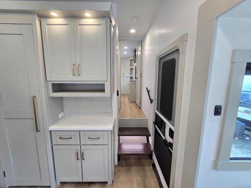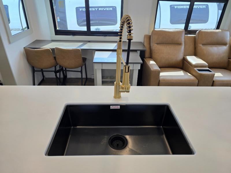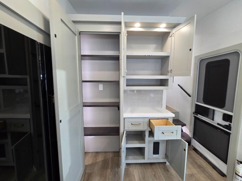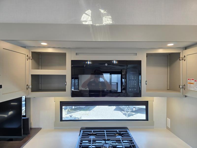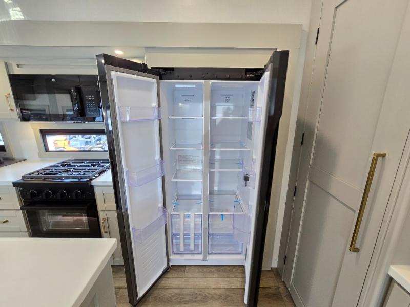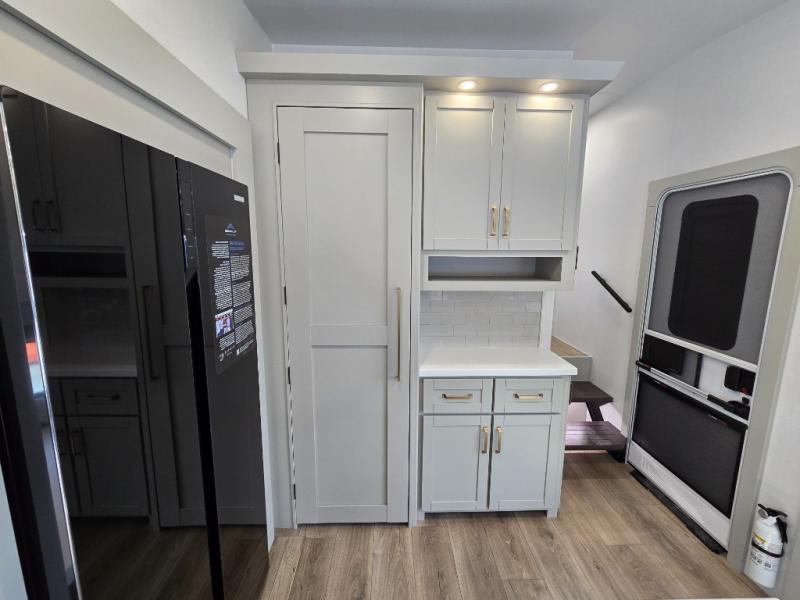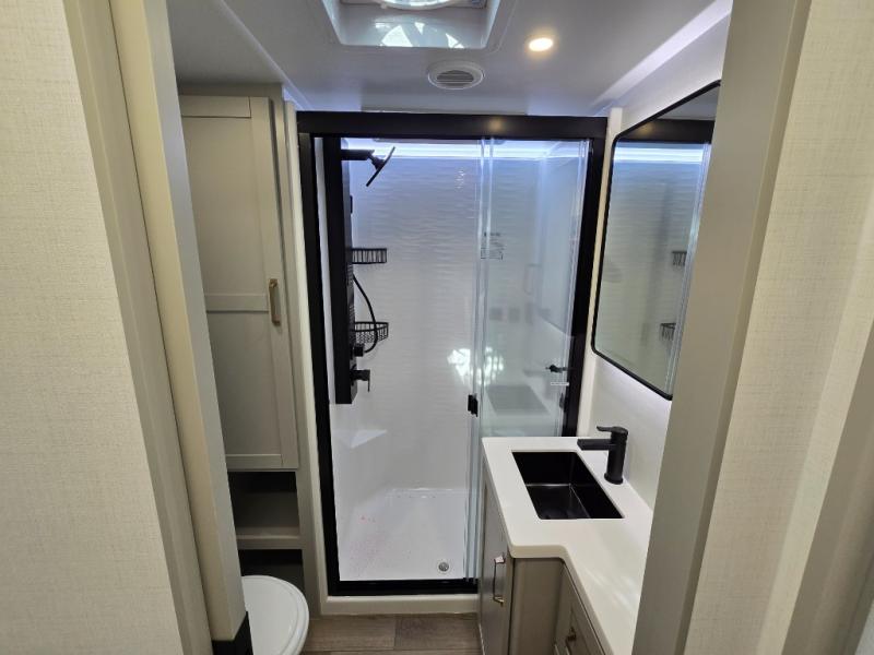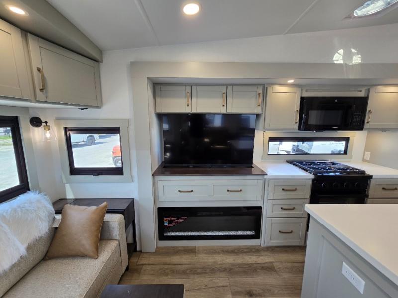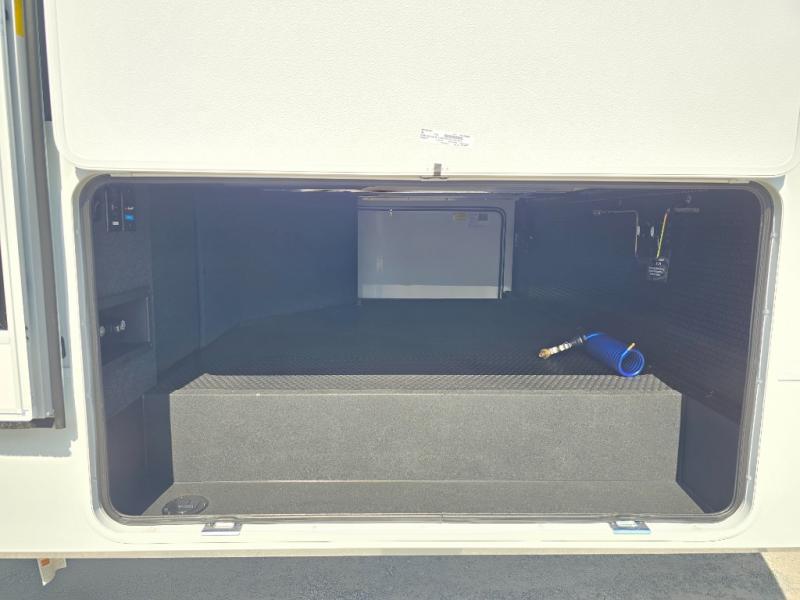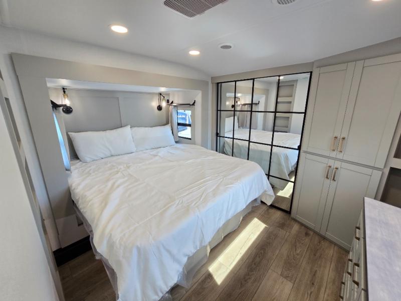 This Model Z luxury fifth wheel is bright and modern on the inside, with loads of amenities that will have you dreaming of your next trip! Enter and find a spacious combined living/kitchen space thanks to dual opposing slides. There is ample seating with a sliding desk/dining table, 62" theater seating, and a 72" tri-fold sofa along the rear wall. You can easily relax and enjoy the 50" Smart telescoping TV with a cozy fireplace below. The kitchen offers all that you need to prepare and cook meals just like home with a 16 cu. ft. refrigerator for your perishables, a 30" microwave oven, and three burner range top and oven. You will love the integrated spice rack, and the kitchen island all outfitted with dog bowls and double pull out trash bins with an integrated Stow 'N Go paper towel holder. There is also an 84" pantry with adjustable shelves for all of your canned and dry goods. Head up the steps to a private master suite with king bed slide. You can opt for the queen bed if you like. A sliding dresser top features hidden storage which is perfect for jewelry and other personal belongings. The front wardrobe features mirrored doors and the corner closet has been prepped for a stackable washer and dryer if you choose to add that option. Relax and enjoy a large bath featuring a linen cabinet, a 30" x 42" shower, and vanity with sink, plus medicine cabinet.