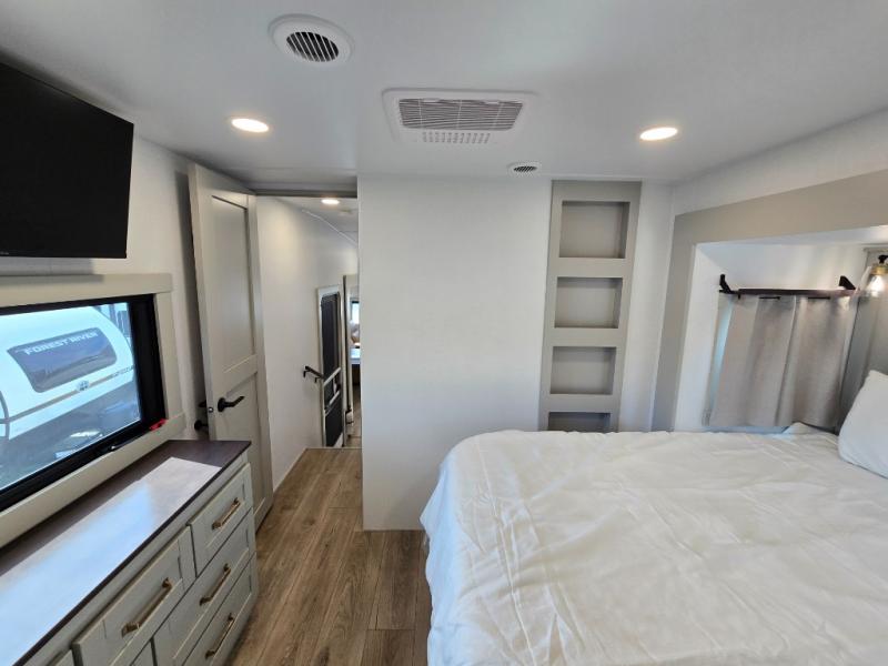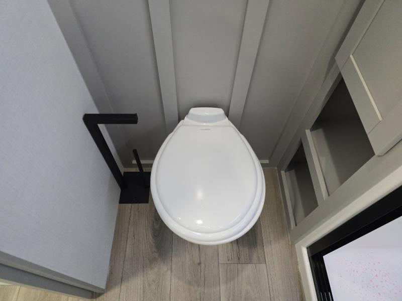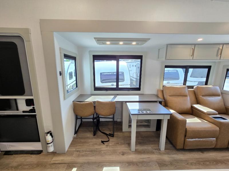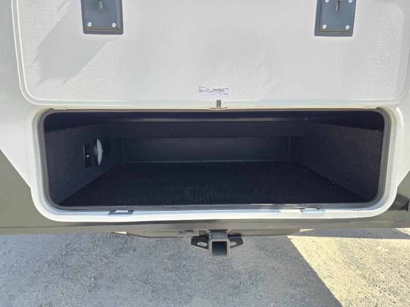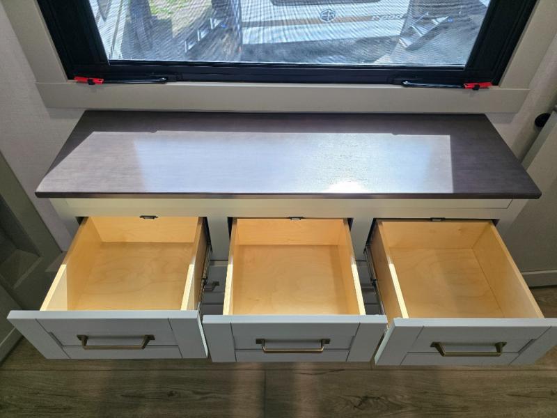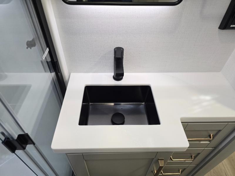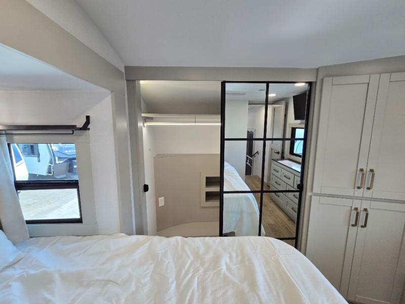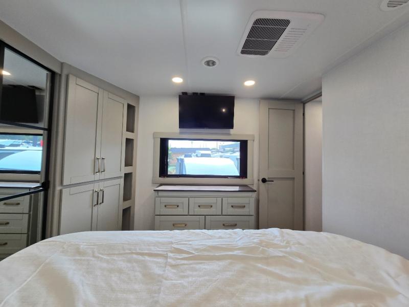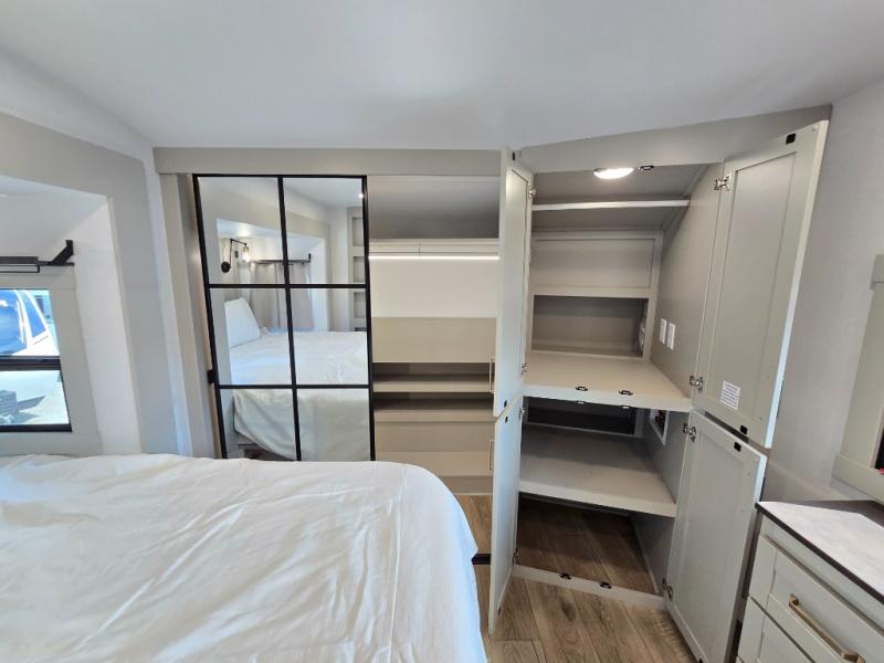 This Model Z luxury fifth wheel is bright and modern on the inside, with loads of amenities that will have you dreaming of your next trip! Enter and find a spacious combined living/kitchen space thanks to dual opposing slides. There is ample seating with a sliding desk/dining table, 62" theater seating, and a 72" tri-fold sofa along the rear wall. You can easily relax and enjoy the 50" Smart telescoping TV with a cozy fireplace below. The kitchen offers all that you need to prepare and cook meals just like home with a 16 cu. ft. refrigerator for your perishables, a 30" microwave oven, and three burner range top and oven. You will love the integrated spice rack, and the kitchen island all outfitted with dog bowls and double pull out trash bins with an integrated Stow 'N Go paper towel holder. There is also an 84" pantry with adjustable shelves for all of your canned and dry goods. Head up the steps to a private master suite with king bed slide. You can opt for the queen bed if you like. A sliding dresser top features hidden storage which is perfect for jewelry and other personal belongings. The front wardrobe features mirrored doors and the corner closet has been prepped for a stackable washer and dryer if you choose to add that option. Relax and enjoy a large bath featuring a linen cabinet, a 30" x 42" shower, and vanity with sink, plus medicine cabinet.