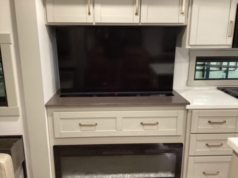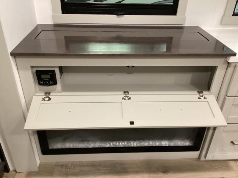 Rear living setup with theater seating, a 50-inch telescoping smart TV, fireplace, and tri-fold sofa—perfect for gathering or cozy evenings.