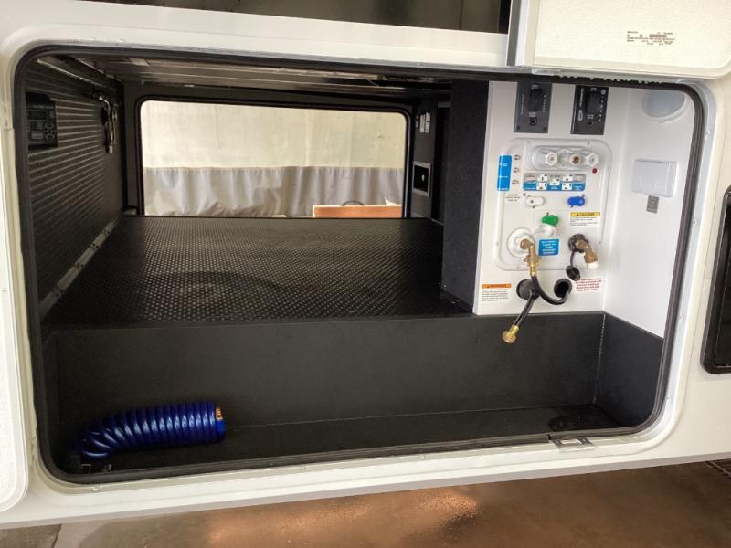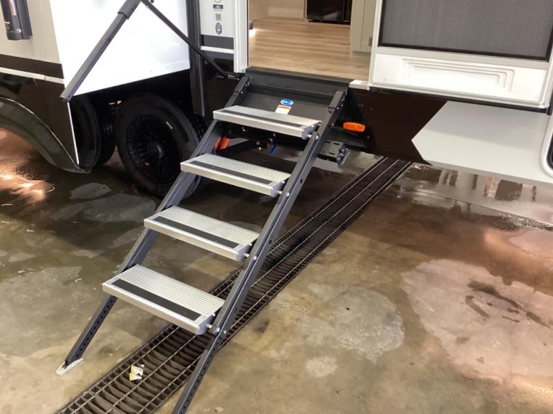 Exterior & utility built for serious travel: automotive exterior styling, wide-stance hydraulic leveling jacks, 2 electric awnings with LED lighting, big pass-through basement storage (130+ cu. ft.), tow/cargo receiver, utility centers with retractable hose and clear-cap termination valves.