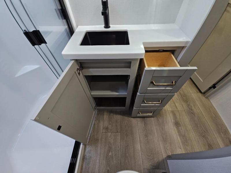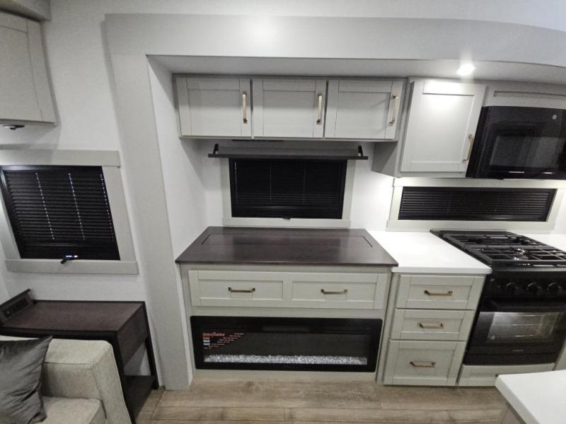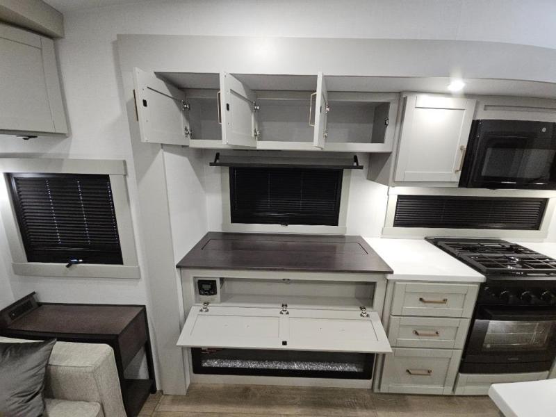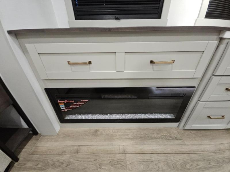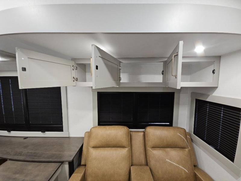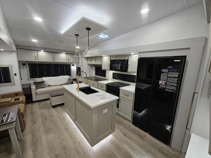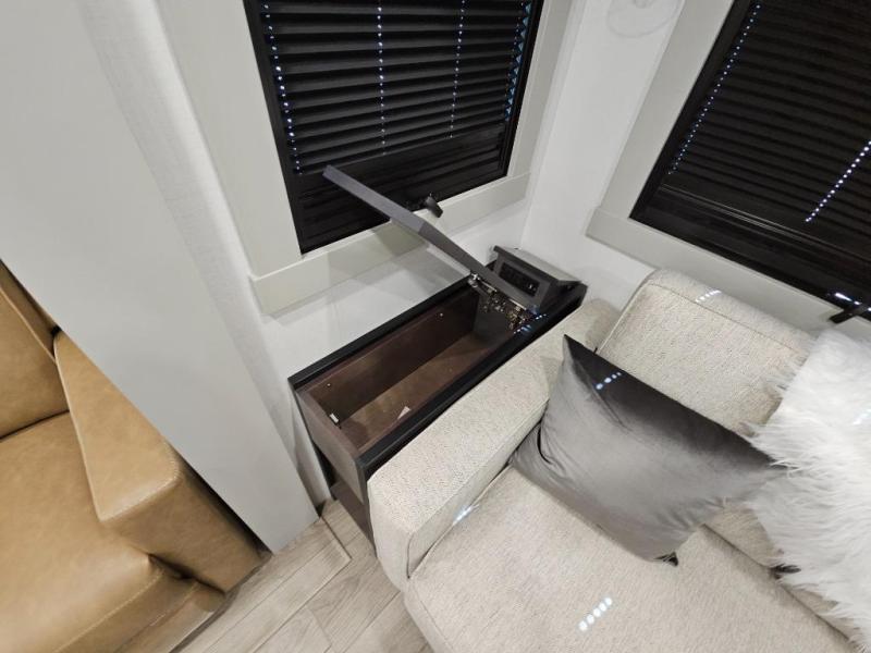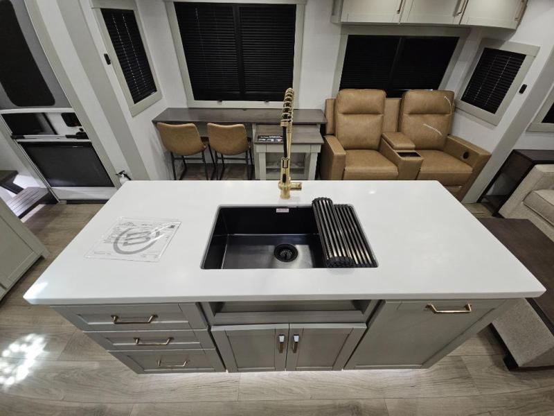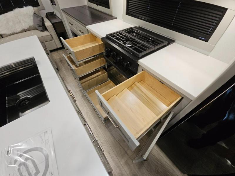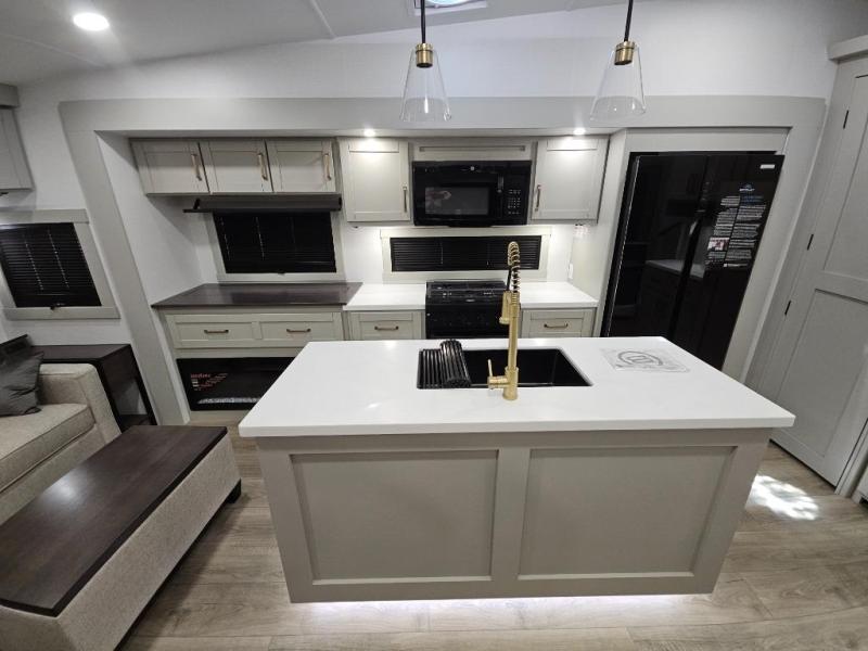 This Model Z luxury fifth wheel is bright and modern on the inside, with loads of amenities that will have you dreaming of your next trip! Enter and find a spacious combined living/kitchen space thanks to dual opposing slides. There is ample seating with a sliding desk/dining table, 62" theater seating, and a 72" tri-fold sofa along the rear wall. You can easily relax and enjoy the 50" Smart telescoping TV with a cozy fireplace below. The kitchen offers all that you need to prepare and cook meals just like home with a 16 cu. ft. refrigerator for your perishables, a 30" microwave oven, and three burner range top and oven. You will love the integrated spice rack, and the kitchen island all outfitted with dog bowls and double pull out trash bins with an integrated Stow 'N Go paper towel holder. There is also an 84" pantry with adjustable shelves for all of your canned and dry goods. Head up the steps to a private master suite with king bed slide. You can opt for the queen bed if you like. A sliding dresser top features hidden storage which is perfect for jewelry and other personal belongings. The front wardrobe features mirrored doors and the corner closet has been prepped for a stackable washer and dryer if you choose to add that option. Relax and enjoy a large bath featuring a linen cabinet, a 30" x 42" shower, and vanity with sink, plus medicine cabinet.