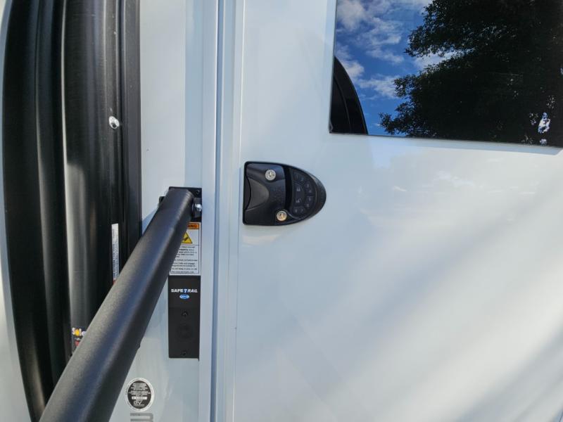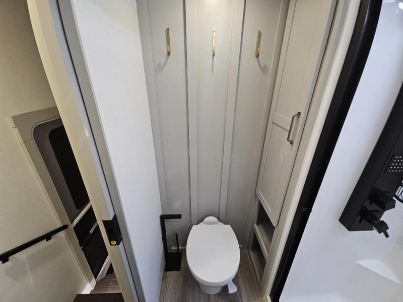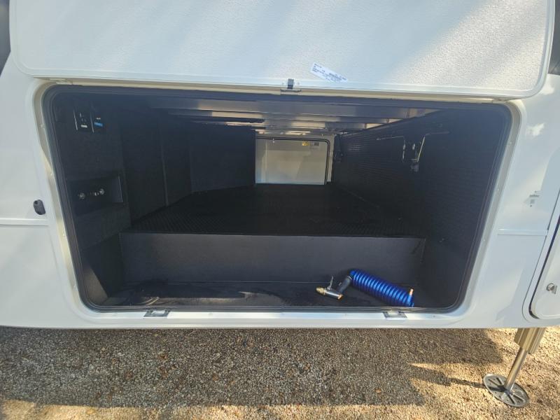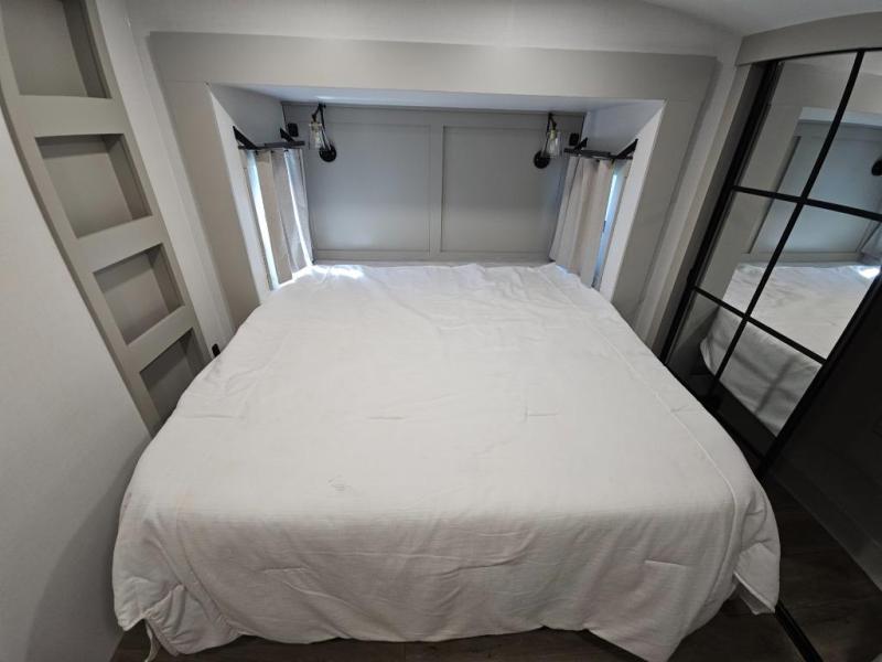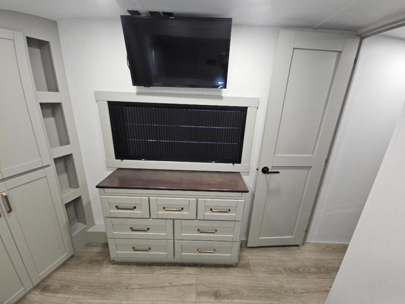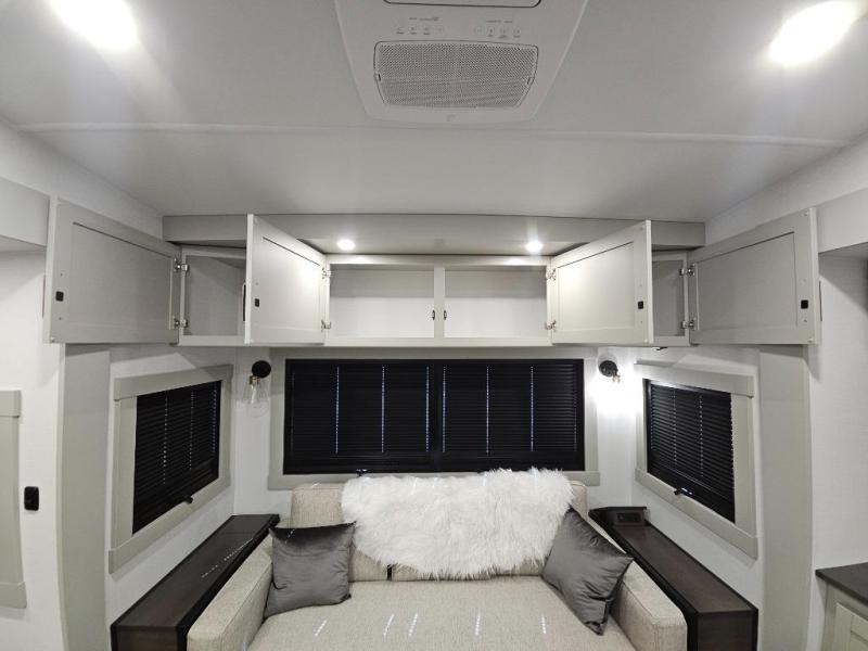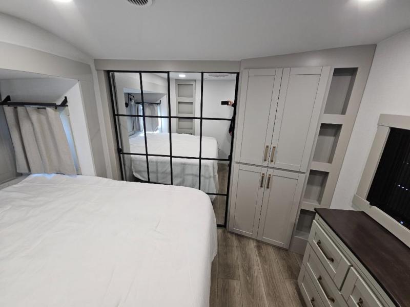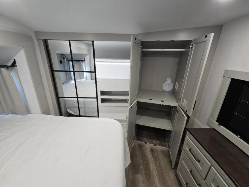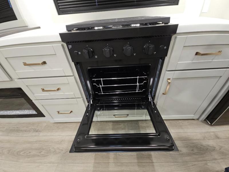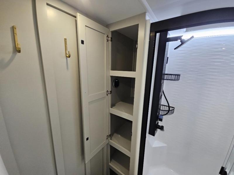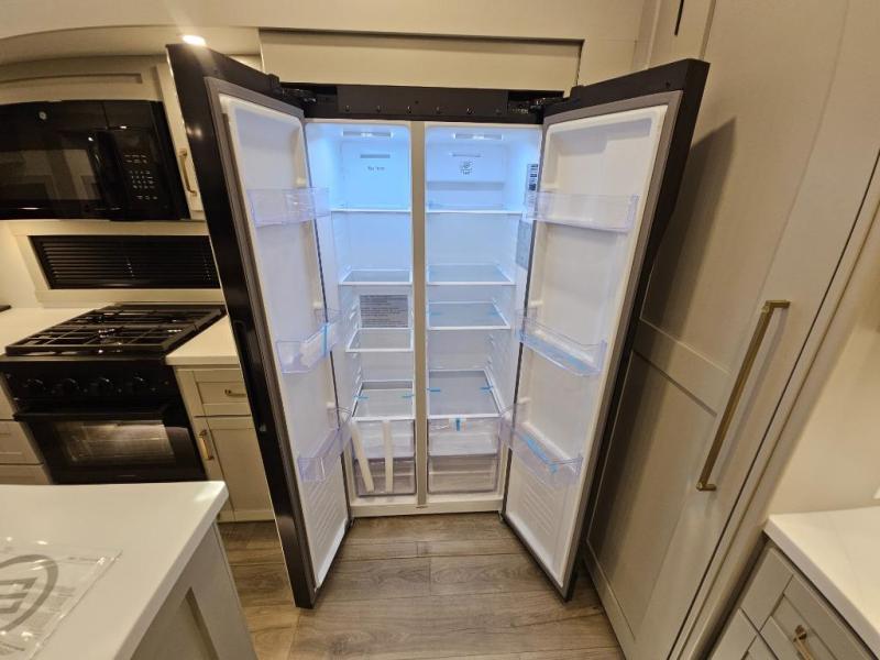 This Model Z luxury fifth wheel is bright and modern on the inside, with loads of amenities that will have you dreaming of your next trip! Enter and find a spacious combined living/kitchen space thanks to dual opposing slides. There is ample seating with a sliding desk/dining table, 62" theater seating, and a 72" tri-fold sofa along the rear wall. You can easily relax and enjoy the 50" Smart telescoping TV with a cozy fireplace below. The kitchen offers all that you need to prepare and cook meals just like home with a 16 cu. ft. refrigerator for your perishables, a 30" microwave oven, and three burner range top and oven. You will love the integrated spice rack, and the kitchen island all outfitted with dog bowls and double pull out trash bins with an integrated Stow 'N Go paper towel holder. There is also an 84" pantry with adjustable shelves for all of your canned and dry goods. Head up the steps to a private master suite with king bed slide. You can opt for the queen bed if you like. A sliding dresser top features hidden storage which is perfect for jewelry and other personal belongings. The front wardrobe features mirrored doors and the corner closet has been prepped for a stackable washer and dryer if you choose to add that option. Relax and enjoy a large bath featuring a linen cabinet, a 30" x 42" shower, and vanity with sink, plus medicine cabinet.
