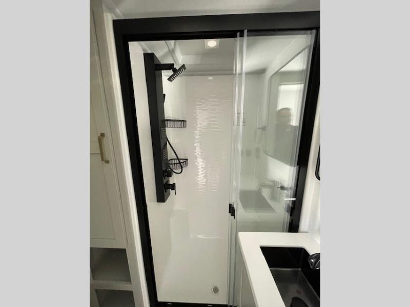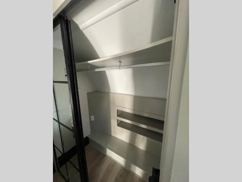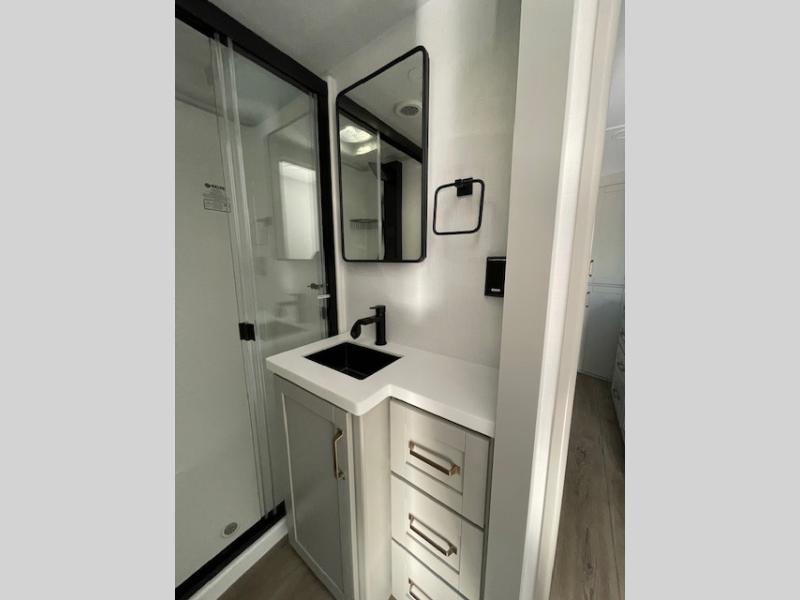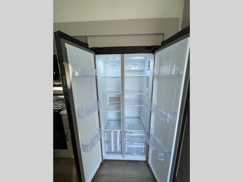 This Model Z luxury fifth wheel is bright and modern on the inside, with loads of amenities that will have you dreaming of your next trip! Enter and find a spacious combined living/kitchen space thanks to dual opposing slides. There is ample seating with a sliding desk/dining table, 62" theater seating, and a 72" tri-fold sofa along the rear wall. You can easily relax and enjoy the 50" Smart telescoping TV with a cozy fireplace below. The kitchen offers all that you need to prepare and cook meals just like home with a 16 cu. ft. refrigerator for your perishables, a 30" microwave oven, and three burner range top and oven. You will love the integrated spice rack, and the kitchen island all outfitted with dog bowls and double pull out trash bins with an integrated Stow 'N Go paper towel holder. There is also an 84" pantry with adjustable shelves for all of your canned and dry goods. Head up the steps to a private master suite with king bed slide. You can opt for the queen bed if you like. A sliding dresser top features hidden storage which is perfect for jewelry and other personal belongings. The front wardrobe features mirrored doors and the corner closet has been prepped for a stackable washer and dryer if you choose to add that option. Relax and enjoy a large bath featuring a linen cabinet, a 30" x 42" shower, and vanity with sink, plus medicine cabinet.