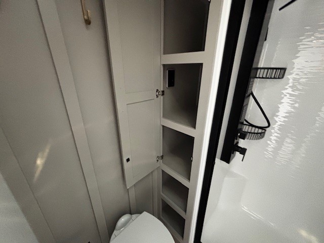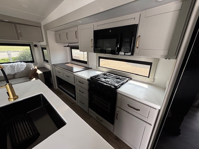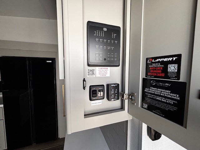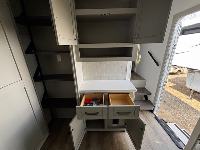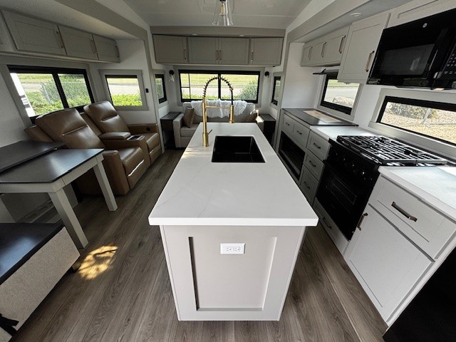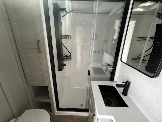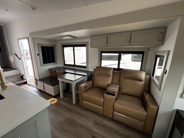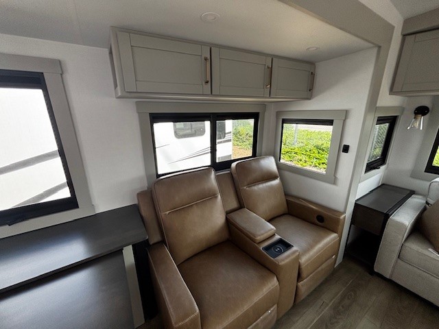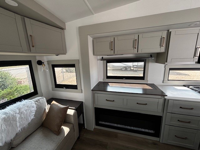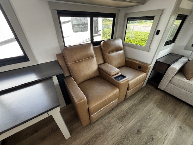 This Model Z luxury fifth wheel is bright and modern on the inside, with loads of amenities that will have you dreaming of your next trip! Enter and find a spacious combined living/kitchen space thanks to dual opposing slides. There is ample seating with a sliding desk/dining table, 62" theater seating, and a 72" tri-fold sofa along the rear wall. You can easily relax and enjoy the 50" Smart telescoping TV with a cozy fireplace below. The kitchen offers all that you need to prepare and cook meals just like home with a 16 cu. ft. refrigerator for your perishables, a 30" microwave oven, and three burner range top and oven. You will love the integrated spice rack, and the kitchen island all outfitted with dog bowls and double pull out trash bins with an integrated Stow 'N Go paper towel holder. There is also an 84" pantry with adjustable shelves for all of your canned and dry goods. Head up the steps to a private master suite with king bed slide. You can opt for the queen bed if you like. A sliding dresser top features hidden storage which is perfect for jewelry and other personal belongings. The front wardrobe features mirrored doors and the corner closet has been prepped for a stackable washer and dryer if you choose to add that option. Relax and enjoy a large bath featuring a linen cabinet, a 30" x 42" shower, and vanity with sink, plus medicine cabinet.
