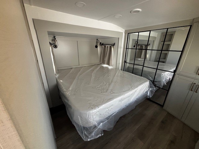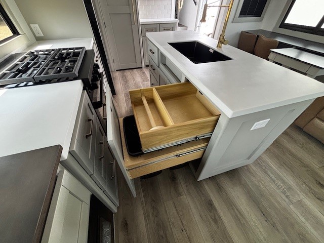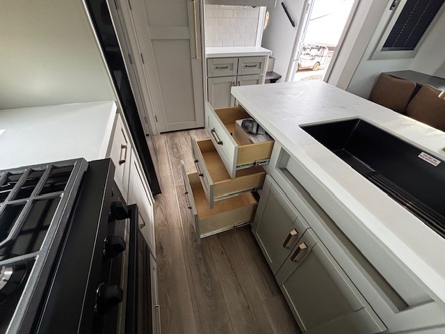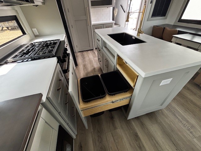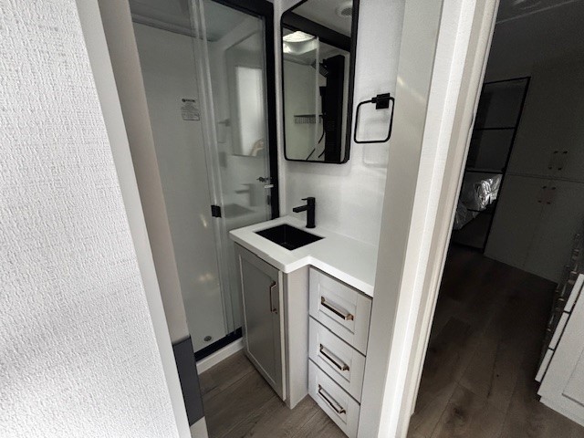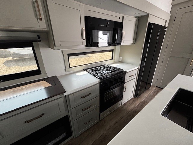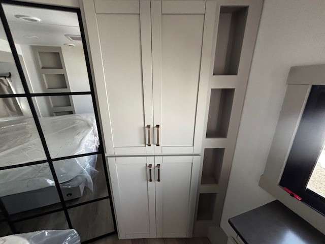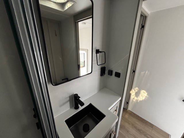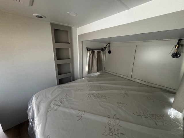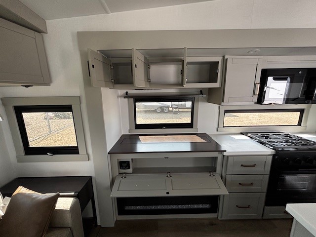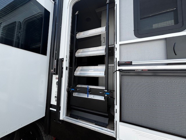 This Model Z luxury fifth wheel is bright and modern on the inside, with loads of amenities that will have you dreaming of your next trip! Enter and find a spacious combined living/kitchen space thanks to dual opposing slides. There is ample seating with a sliding desk/dining table, 62" theater seating, and a 72" tri-fold sofa along the rear wall. You can easily relax and enjoy the 50" Smart telescoping TV with a cozy fireplace below. The kitchen offers all that you need to prepare and cook meals just like home with a 16 cu. ft. refrigerator for your perishables, a 30" microwave oven, and three burner range top and oven. You will love the integrated spice rack, and the kitchen island all outfitted with dog bowls and double pull out trash bins with an integrated Stow 'N Go paper towel holder. There is also an 84" pantry with adjustable shelves for all of your canned and dry goods. Head up the steps to a private master suite with king bed slide. You can opt for the queen bed if you like. A sliding dresser top features hidden storage which is perfect for jewelry and other personal belongings. The front wardrobe features mirrored doors and the corner closet has been prepped for a stackable washer and dryer if you choose to add that option. Relax and enjoy a large bath featuring a linen cabinet, a 30" x 42" shower, and vanity with sink, plus medicine cabinet.