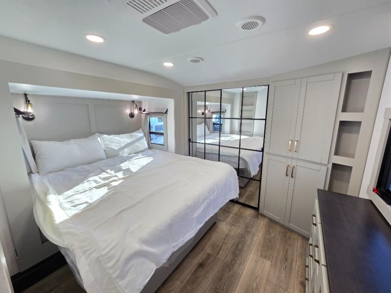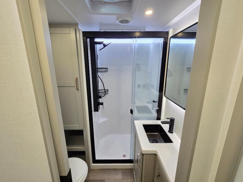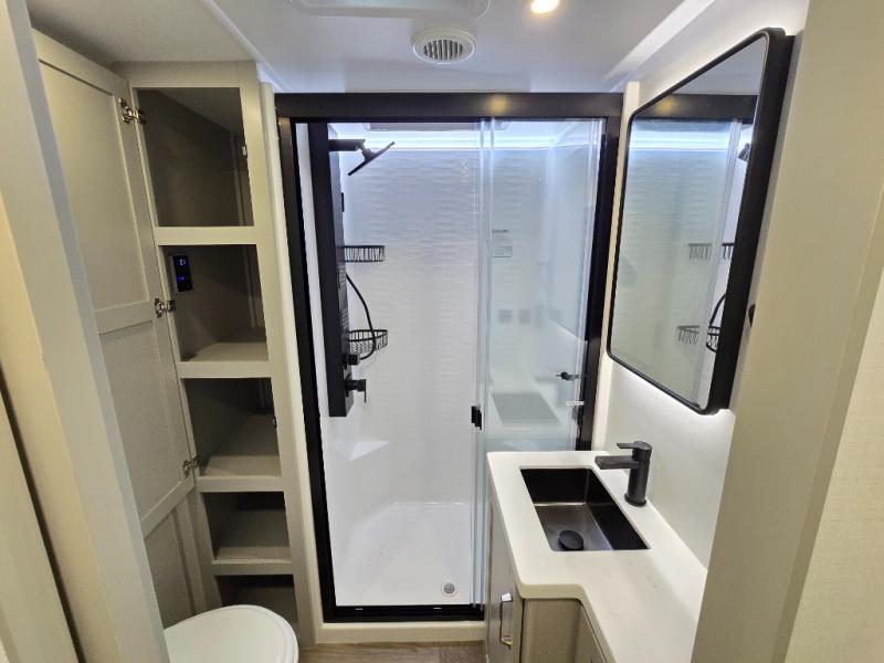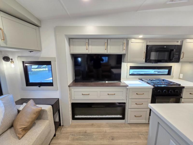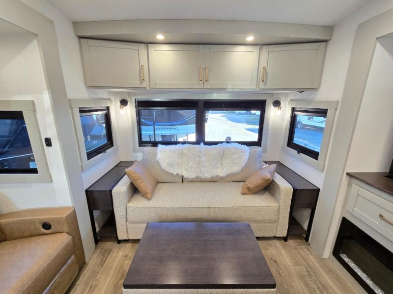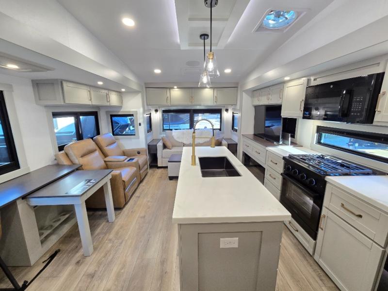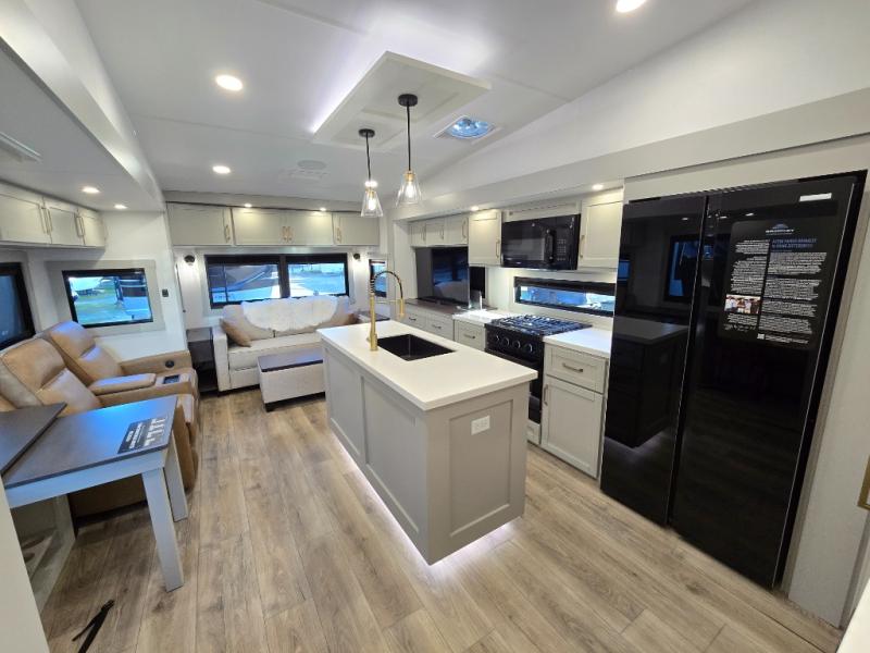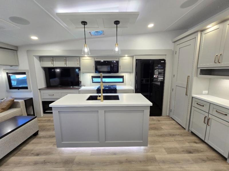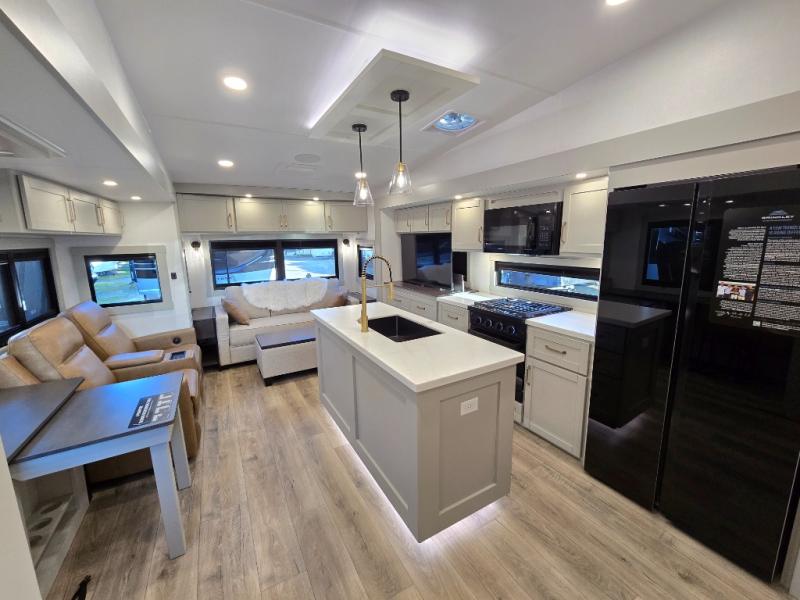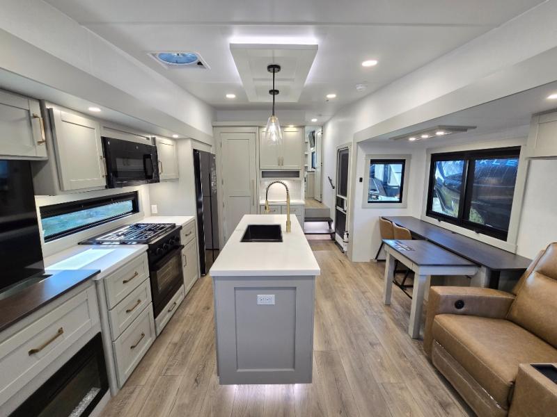 This Model Z luxury fifth wheel is bright and modern on the inside, with loads of amenities that will have you dreaming of your next trip! Enter and find a spacious combined living/kitchen space thanks to dual opposing slides. There is ample seating with a sliding desk/dining table, 62" theater seating, and a 72" tri-fold sofa along the rear wall. You can easily relax and enjoy the 50" Smart telescoping TV with a cozy fireplace below. The kitchen offers all that you need to prepare and cook meals just like home with a 16 cu. ft. refrigerator for your perishables, a 30" microwave oven, and three burner range top and oven. You will love the integrated spice rack, and the kitchen island all outfitted with dog bowls and double pull out trash bins with an integrated Stow 'N Go paper towel holder. There is also an 84" pantry with adjustable shelves for all of your canned and dry goods. Head up the steps to a private master suite with king bed slide. You can opt for the queen bed if you like. A sliding dresser top features hidden storage which is perfect for jewelry and other personal belongings. The front wardrobe features mirrored doors and the corner closet has been prepped for a stackable washer and dryer if you choose to add that option. Relax and enjoy a large bath featuring a linen cabinet, a 30" x 42" shower, and vanity with sink, plus medicine cabinet.