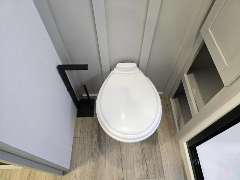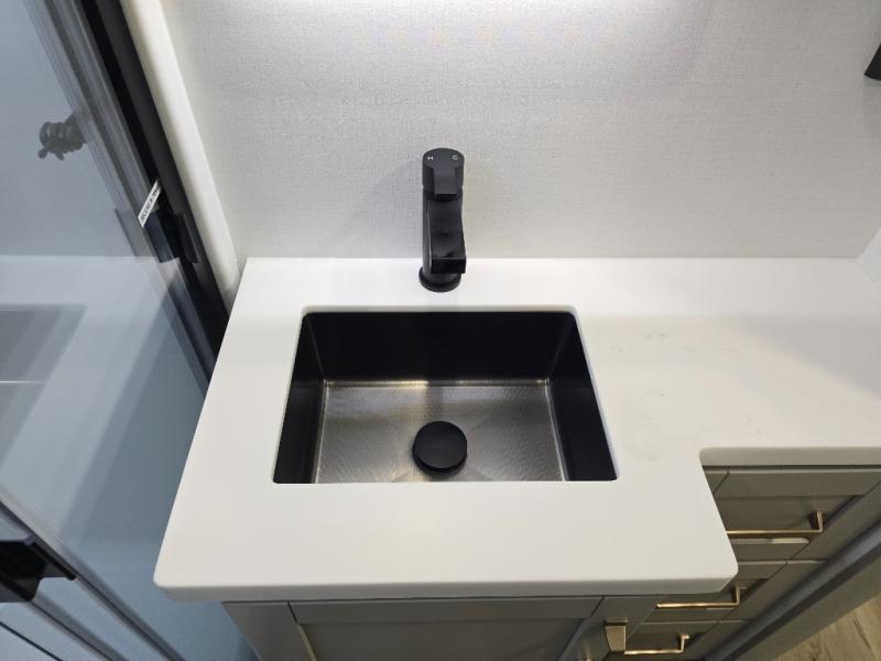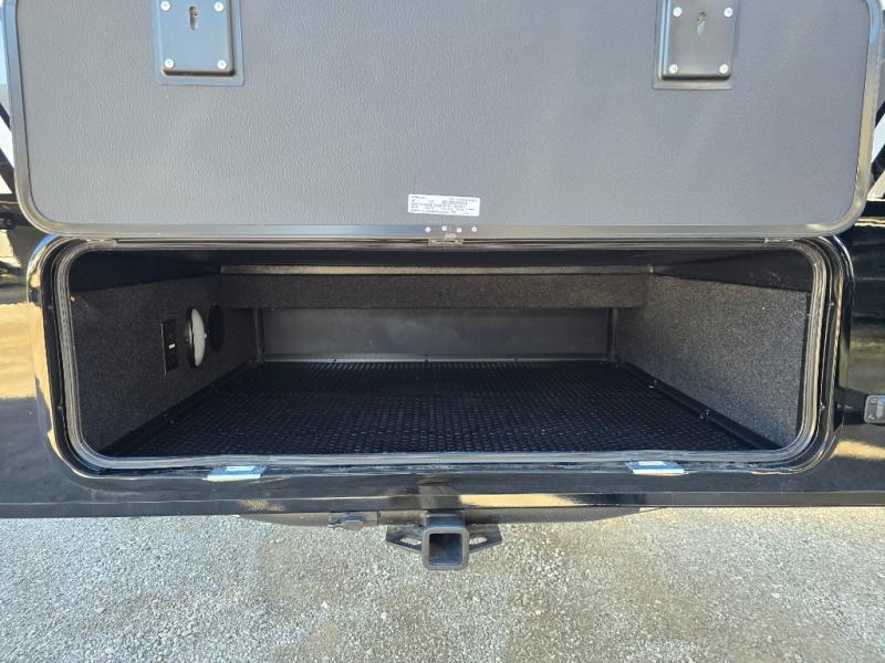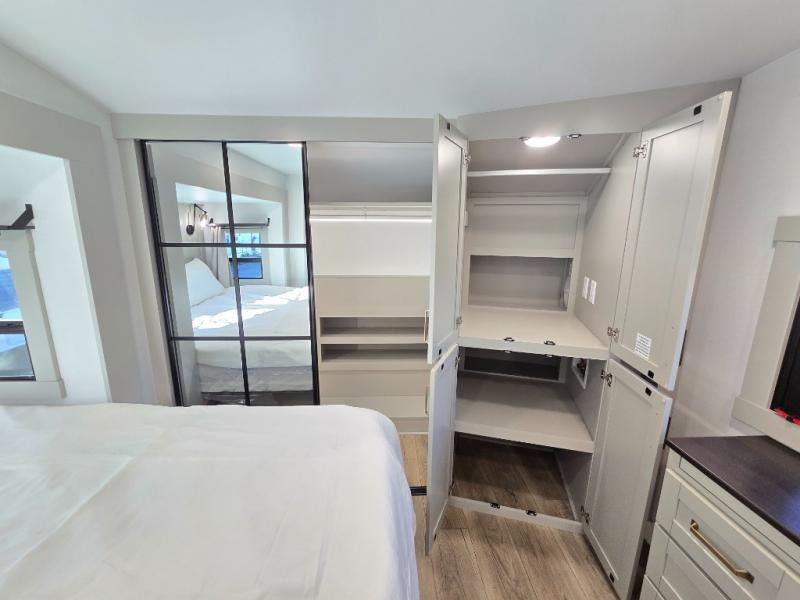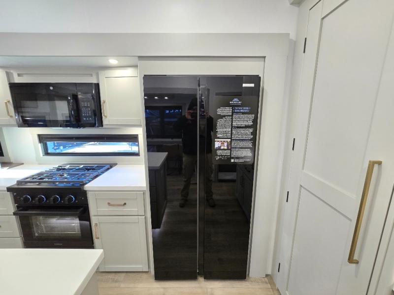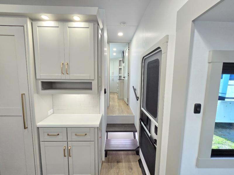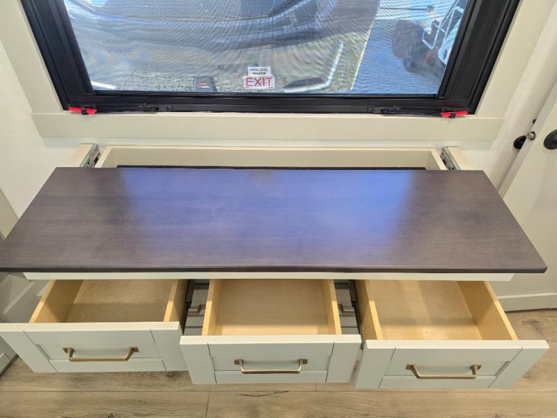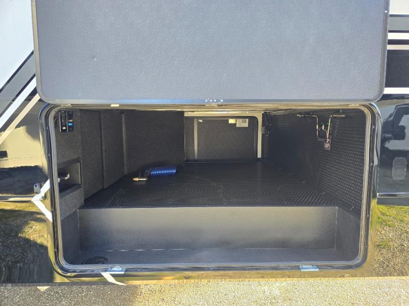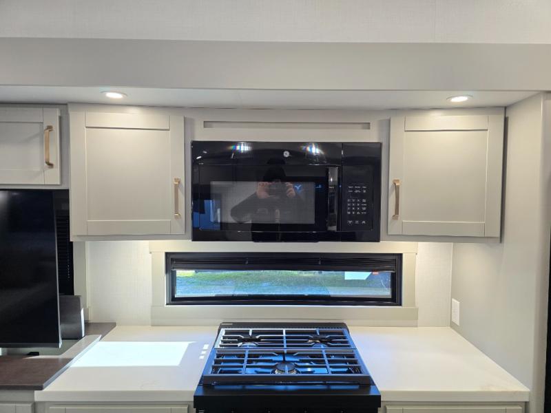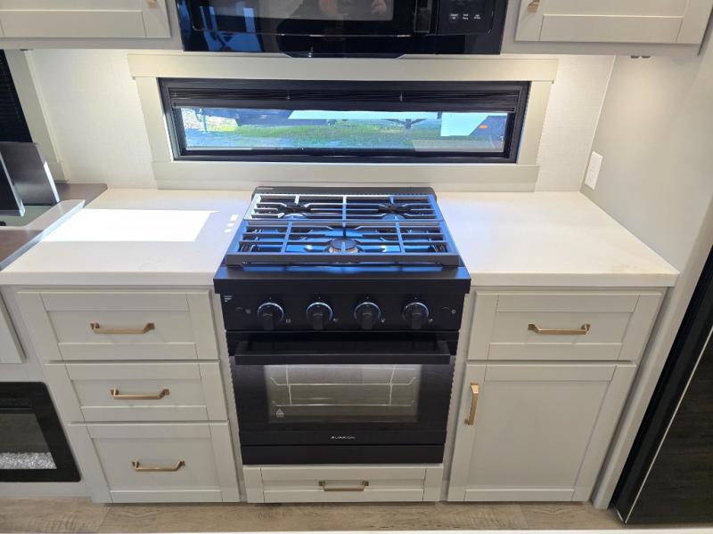 This Model Z luxury fifth wheel is bright and modern on the inside, with loads of amenities that will have you dreaming of your next trip! Enter and find a spacious combined living/kitchen space thanks to dual opposing slides. There is ample seating with a sliding desk/dining table, 62" theater seating, and a 72" tri-fold sofa along the rear wall. You can easily relax and enjoy the 50" Smart telescoping TV with a cozy fireplace below. The kitchen offers all that you need to prepare and cook meals just like home with a 16 cu. ft. refrigerator for your perishables, a 30" microwave oven, and three burner range top and oven. You will love the integrated spice rack, and the kitchen island all outfitted with dog bowls and double pull out trash bins with an integrated Stow 'N Go paper towel holder. There is also an 84" pantry with adjustable shelves for all of your canned and dry goods. Head up the steps to a private master suite with king bed slide. You can opt for the queen bed if you like. A sliding dresser top features hidden storage which is perfect for jewelry and other personal belongings. The front wardrobe features mirrored doors and the corner closet has been prepped for a stackable washer and dryer if you choose to add that option. Relax and enjoy a large bath featuring a linen cabinet, a 30" x 42" shower, and vanity with sink, plus medicine cabinet.