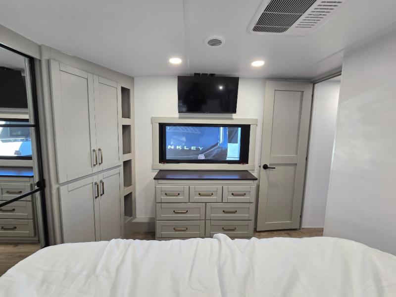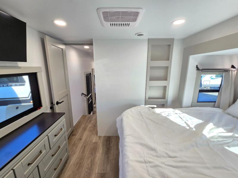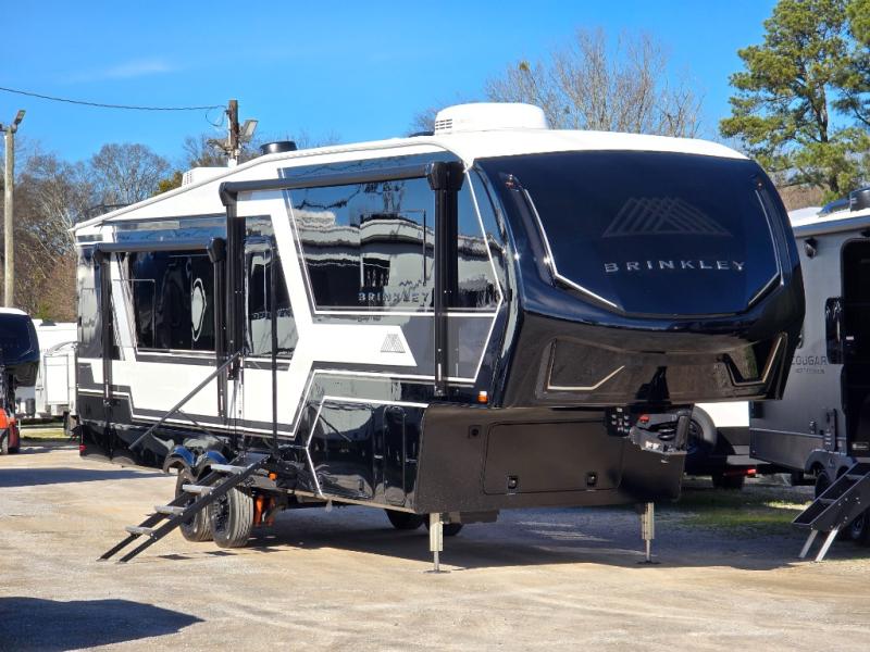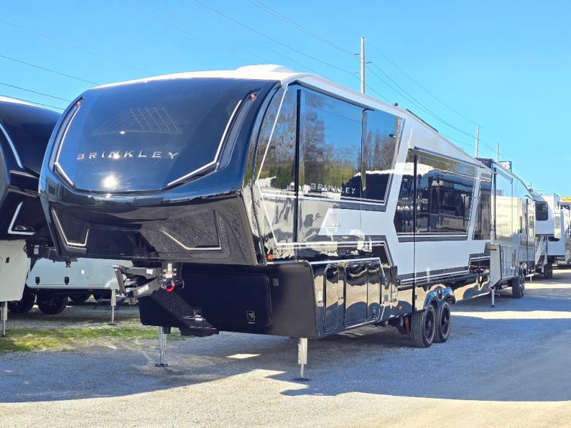 The Brinkley mid-profile Model Z fifth wheels bring you clean lines and an upscale look with plenty of style and exciting new features like the industry first brass plumbing connections. These units also feature an automotive grade front cap, plenty of exterior storage, dual exterior hot and cold showers, and wide stance leveling jacks for easy set up. Residential frameless windows provide a clean look and beautiful views, and ample electrical outlets and 6 USB/USB-C outlets allow all of your electronics and appliances to easily be used and charged.