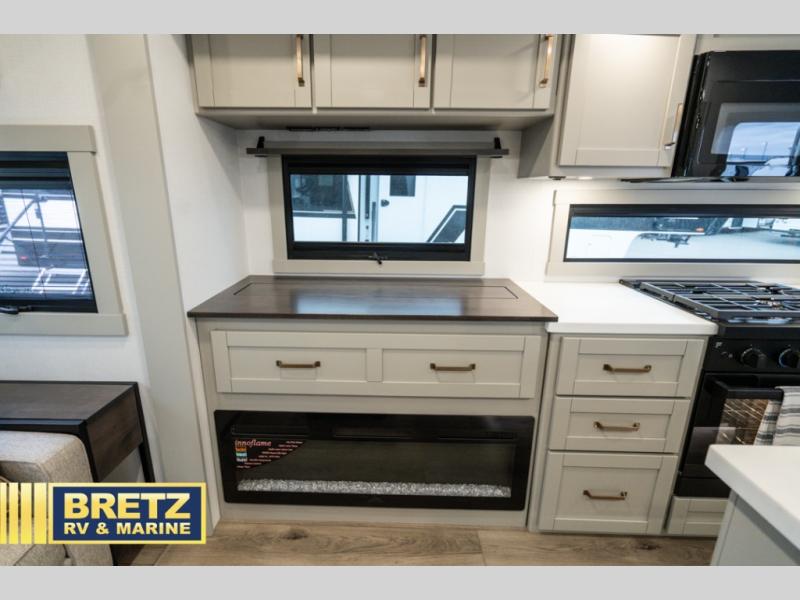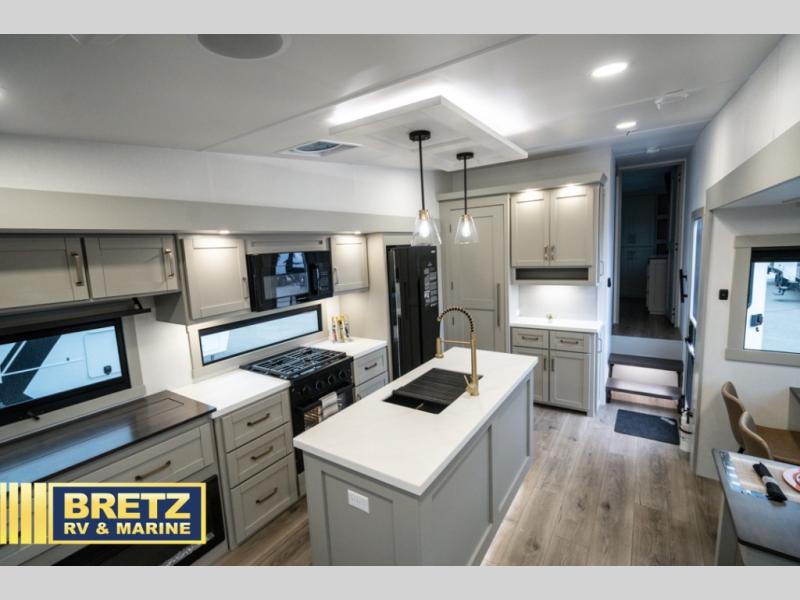 This Model Z luxury fifth wheel is bright and modern on the inside, with loads of amenities that will have you dreaming of your next trip! Enter and find a spacious combined living/kitchen space thanks to dual opposing slides. There is ample seating with a sliding desk/dining table, 62" theater seating, and a 72" tri-fold sofa along the rear wall. You can easily relax and enjoy the 50" Smart telescoping TV with a cozy fireplace below. The kitchen offers all that you need to prepare and cook meals just like home with a 16 cu. ft. refrigerator for your perishables, a 30" microwave oven, and three burner range top and oven. You will love the integrated spice rack, and the kitchen island all outfitted with dog bowls and double pull out trash bins with an integrated Stow 'N Go paper towel holder. There is also an 84" pantry with adjustable shelves for all of your canned and dry goods. Head up the steps to a private master suite with king bed slide. You can opt for the queen bed if you like. A sliding dresser top features hidden storage which is perfect for jewelry and other personal belongings. The front wardrobe features mirrored doors and the corner closet has been prepped for a stackable washer and dryer if you choose to add that option. Relax and enjoy a large bath featuring a linen cabinet, a 30" x 42" shower, and vanity with sink, plus medicine cabinet.