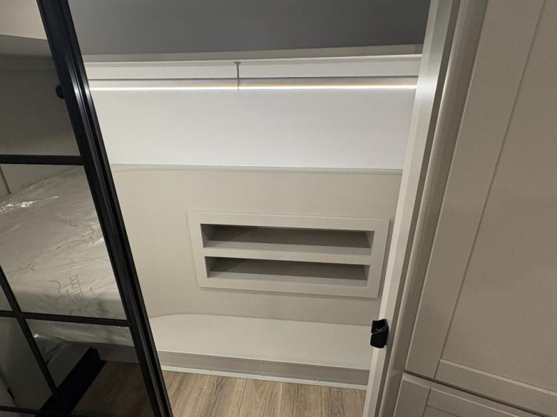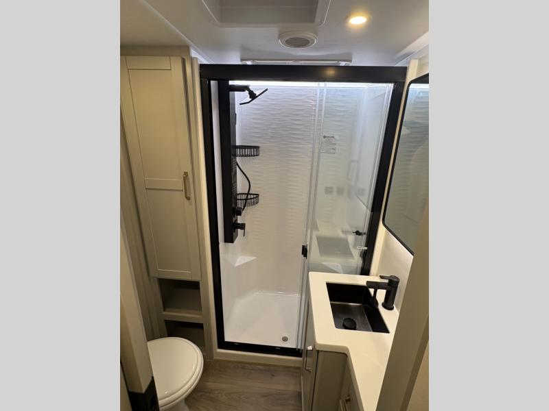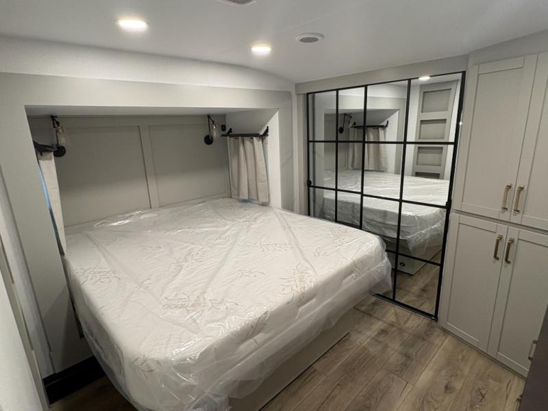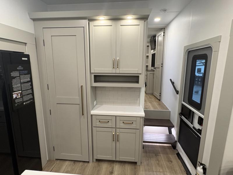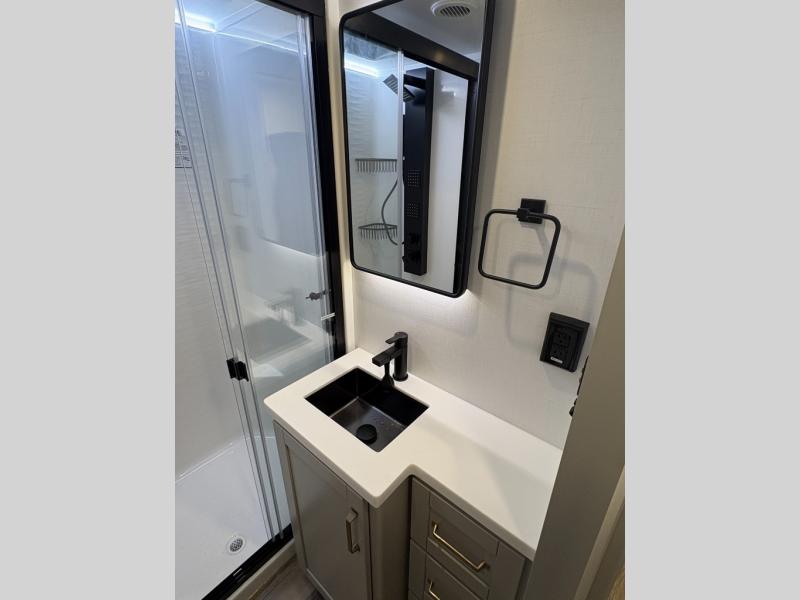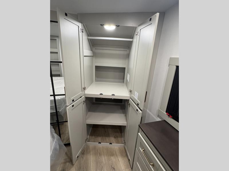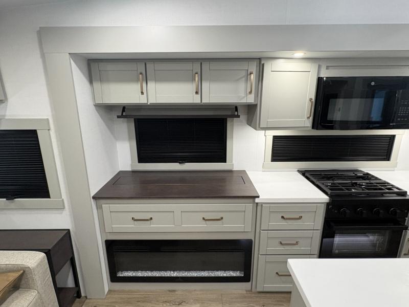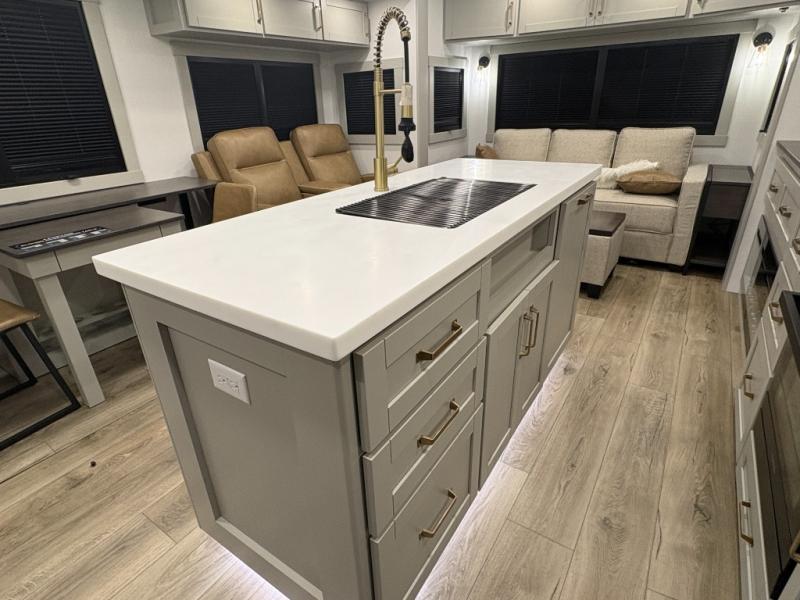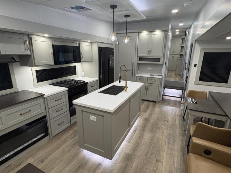 This Model Z luxury fifth wheel is bright and modern on the inside, with loads of amenities that will have you dreaming of your next trip! Enter and find a spacious combined living/kitchen space thanks to dual opposing slides. There is ample seating with a sliding desk/dining table, 62" theater seating, and a 72" tri-fold sofa along the rear wall. You can easily relax and enjoy the 50" Smart telescoping TV with a cozy fireplace below. The kitchen offers all that you need to prepare and cook meals just like home with a 16 cu. ft. refrigerator for your perishables, a 30" microwave oven, and three burner range top and oven. You will love the integrated spice rack, and the kitchen island all outfitted with dog bowls and double pull out trash bins with an integrated Stow 'N Go paper towel holder. There is also an 84" pantry with adjustable shelves for all of your canned and dry goods. Head up the steps to a private master suite with king bed slide. You can opt for the queen bed if you like. A sliding dresser top features hidden storage which is perfect for jewelry and other personal belongings. The front wardrobe features mirrored doors and the corner closet has been prepped for a stackable washer and dryer if you choose to add that option. Relax and enjoy a large bath featuring a linen cabinet, a 30" x 42" shower, and vanity with sink, plus medicine cabinet.