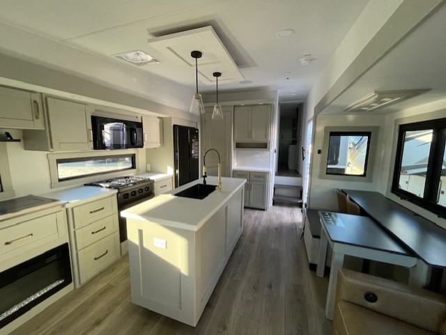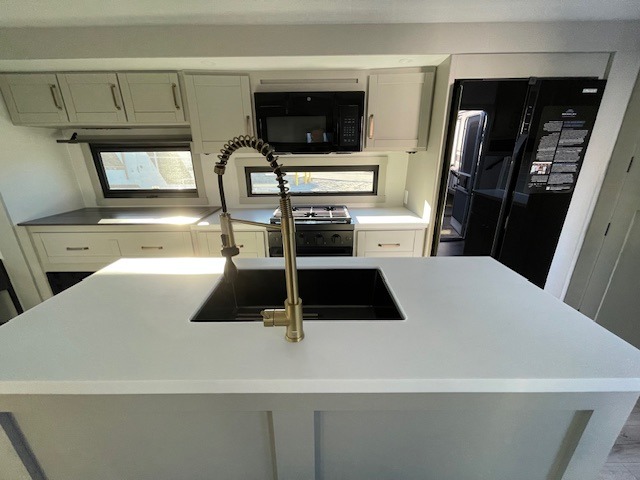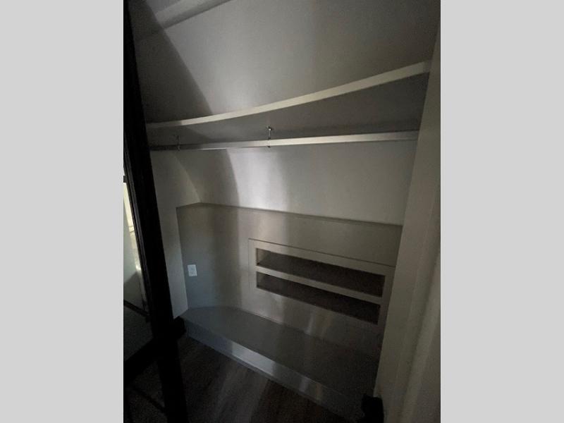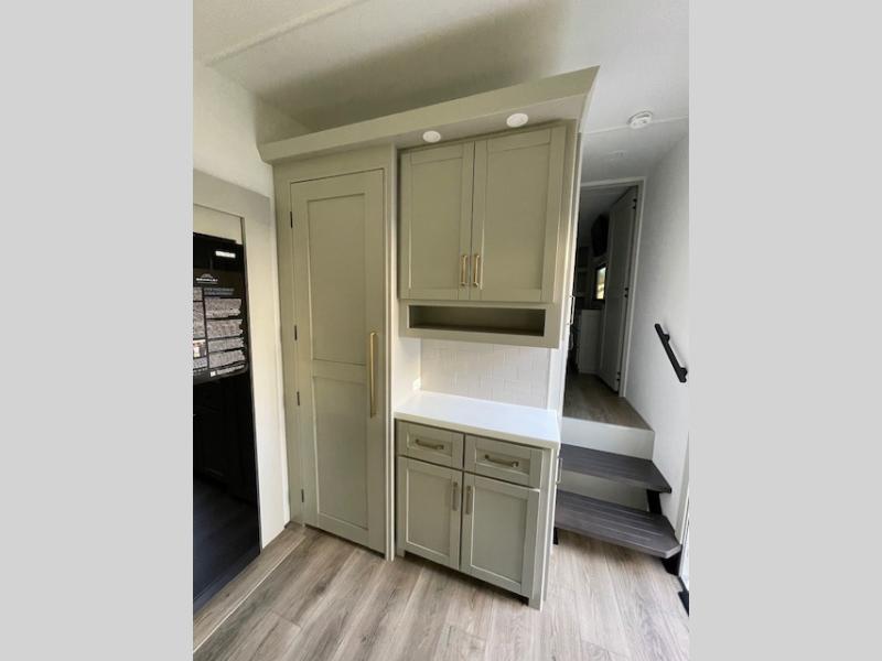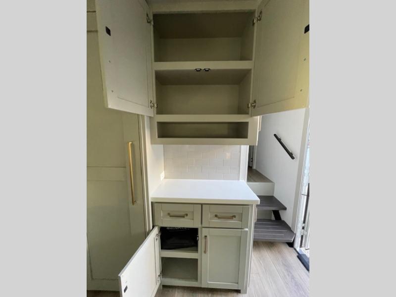 This Model Z luxury fifth wheel is bright and modern on the inside, with loads of amenities that will have you dreaming of your next trip! Enter and find a spacious combined living/kitchen space thanks to dual opposing slides. There is ample seating with a sliding desk/dining table, 62" theater seating, and a 72" tri-fold sofa along the rear wall. You can easily relax and enjoy the 50" Smart telescoping TV with a cozy fireplace below. The kitchen offers all that you need to prepare and cook meals just like home with a 16 cu. ft. refrigerator for your perishables, a 30" microwave oven, and three burner range top and oven. You will love the integrated spice rack, and the kitchen island all outfitted with dog bowls and double pull out trash bins with an integrated Stow 'N Go paper towel holder. There is also an 84" pantry with adjustable shelves for all of your canned and dry goods. Head up the steps to a private master suite with king bed slide. You can opt for the queen bed if you like. A sliding dresser top features hidden storage which is perfect for jewelry and other personal belongings. The front wardrobe features mirrored doors and the corner closet has been prepped for a stackable washer and dryer if you choose to add that option. Relax and enjoy a large bath featuring a linen cabinet, a 30" x 42" shower, and vanity with sink, plus medicine cabinet.