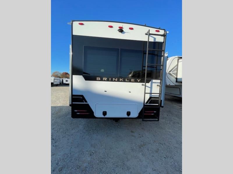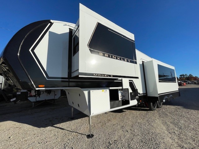 The Brinkley mid-profile Model Z fifth wheels bring you clean lines and an upscale look with plenty of style and exciting new features like the industry first brass plumbing connections. These units also feature an automotive grade front cap, plenty of exterior storage, dual exterior hot and cold showers, and wide stance leveling jacks for easy set up. Residential frameless windows provide a clean look and beautiful views, and ample electrical outlets and 6 USB/USB-C outlets allow all of your electronics and appliances to easily be used and charged.