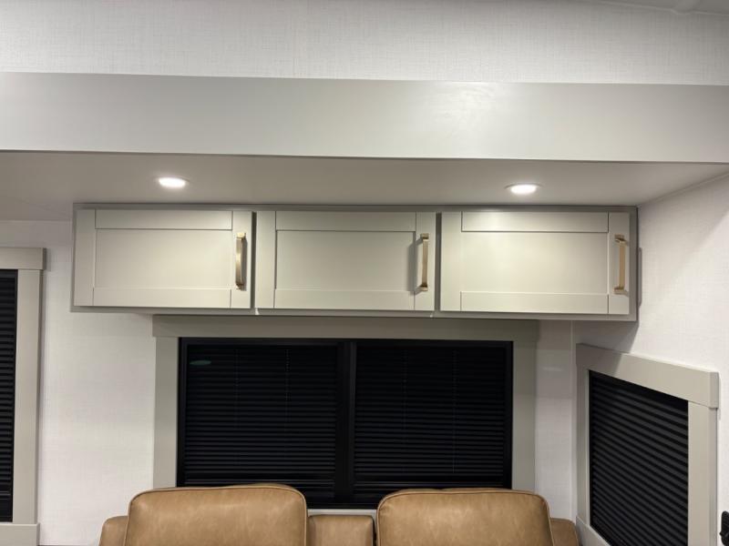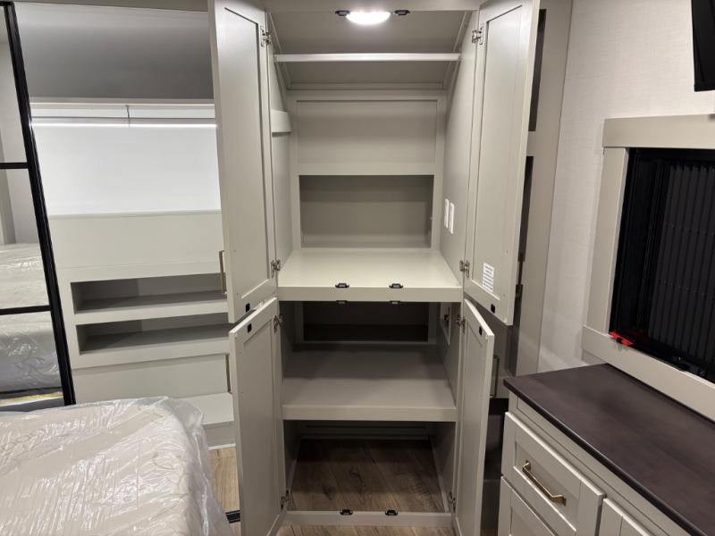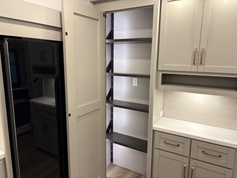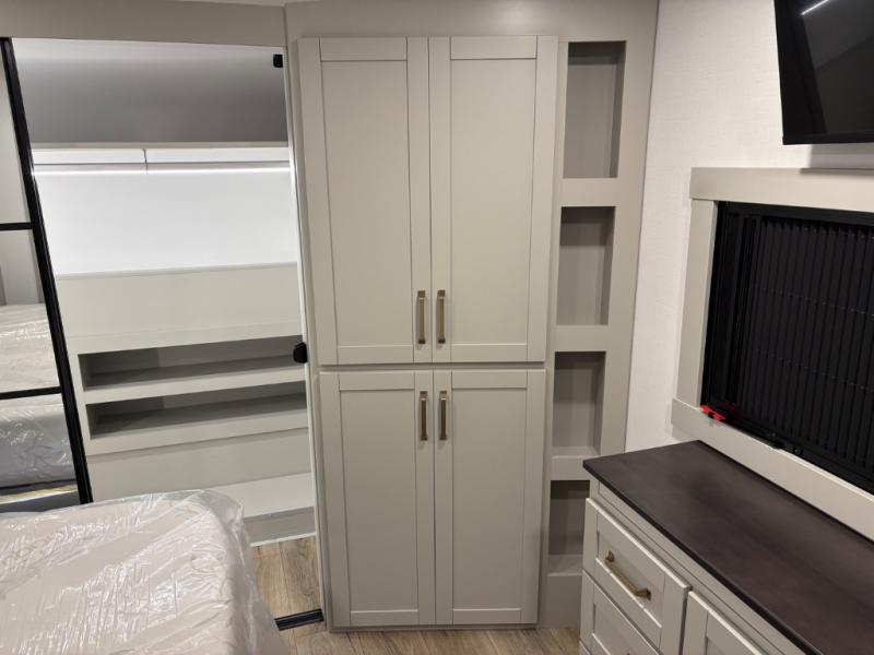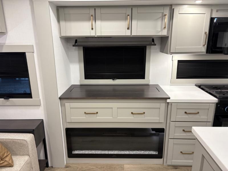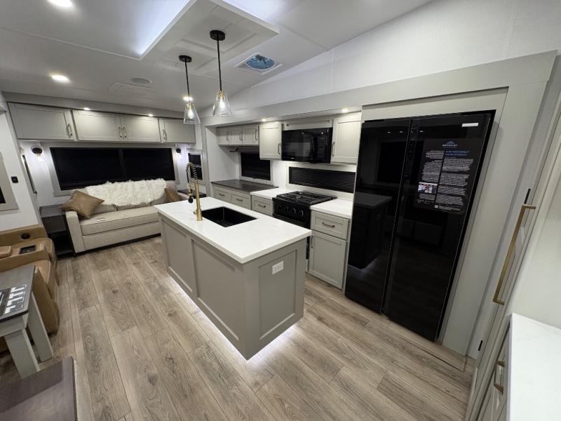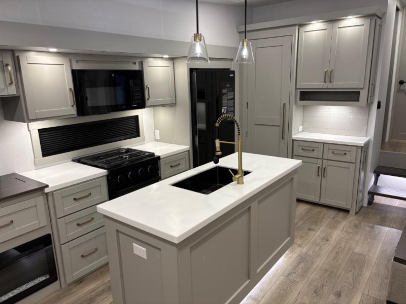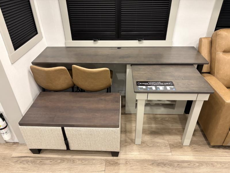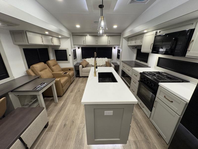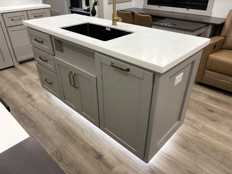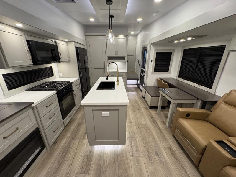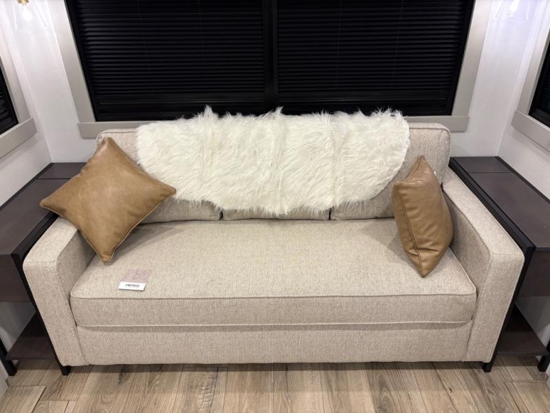 This Model Z luxury fifth wheel is bright and modern on the inside, with loads of amenities that will have you dreaming of your next trip! Enter and find a spacious combined living/kitchen space thanks to dual opposing slides. There is ample seating with a sliding desk/dining table, 62" theater seating, and a 72" tri-fold sofa along the rear wall. You can easily relax and enjoy the 50" Smart telescoping TV with a cozy fireplace below. The kitchen offers all that you need to prepare and cook meals just like home with a 16 cu. ft. refrigerator for your perishables, a 30" microwave oven, and three burner range top and oven. You will love the integrated spice rack, and the kitchen island all outfitted with dog bowls and double pull out trash bins with an integrated Stow 'N Go paper towel holder. There is also an 84" pantry with adjustable shelves for all of your canned and dry goods. Head up the steps to a private master suite with king bed slide. You can opt for the queen bed if you like. A sliding dresser top features hidden storage which is perfect for jewelry and other personal belongings. The front wardrobe features mirrored doors and the corner closet has been prepped for a stackable washer and dryer if you choose to add that option. Relax and enjoy a large bath featuring a linen cabinet, a 30" x 42" shower, and vanity with sink, plus medicine cabinet.