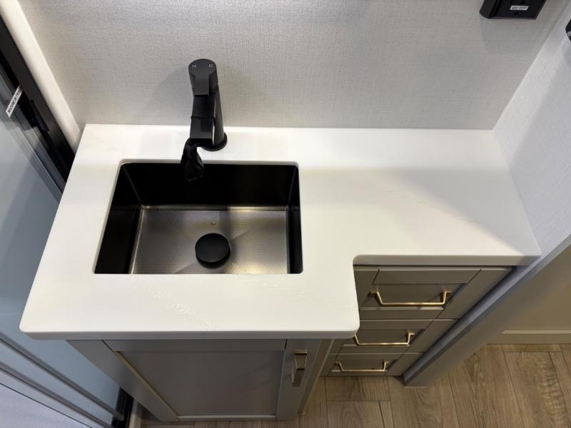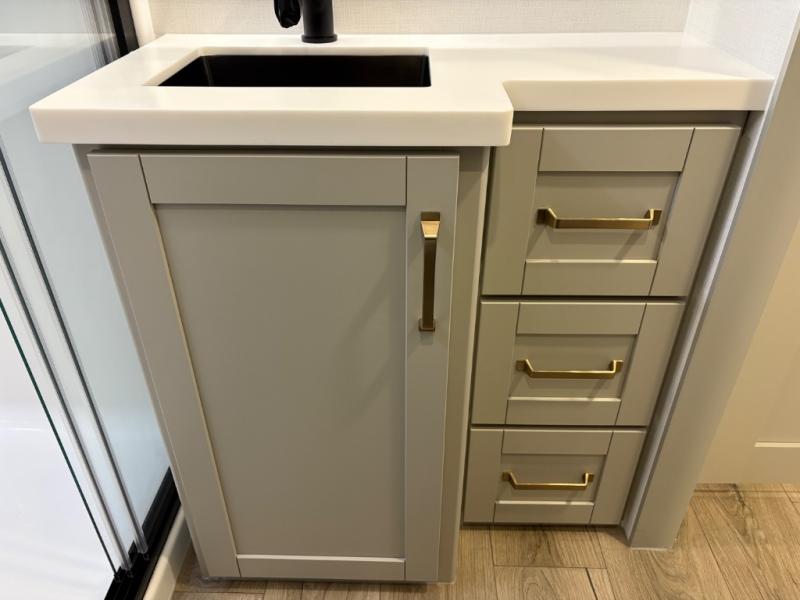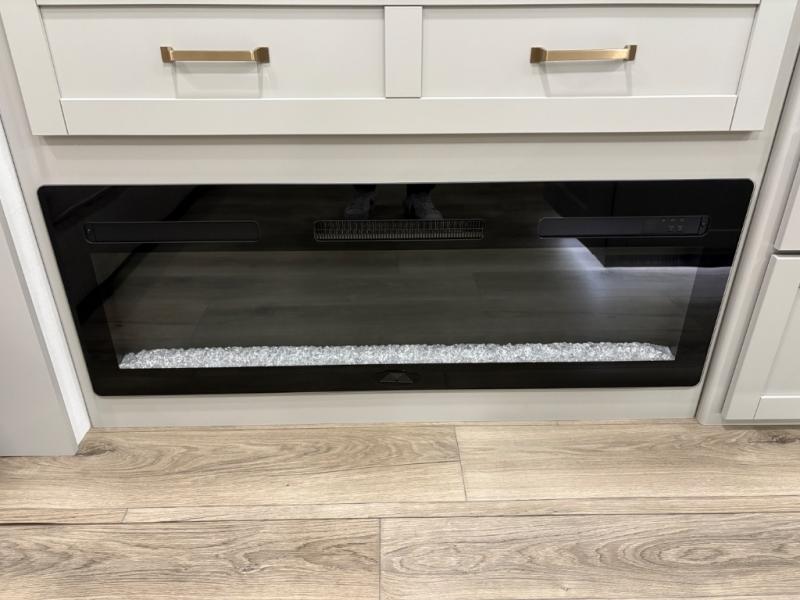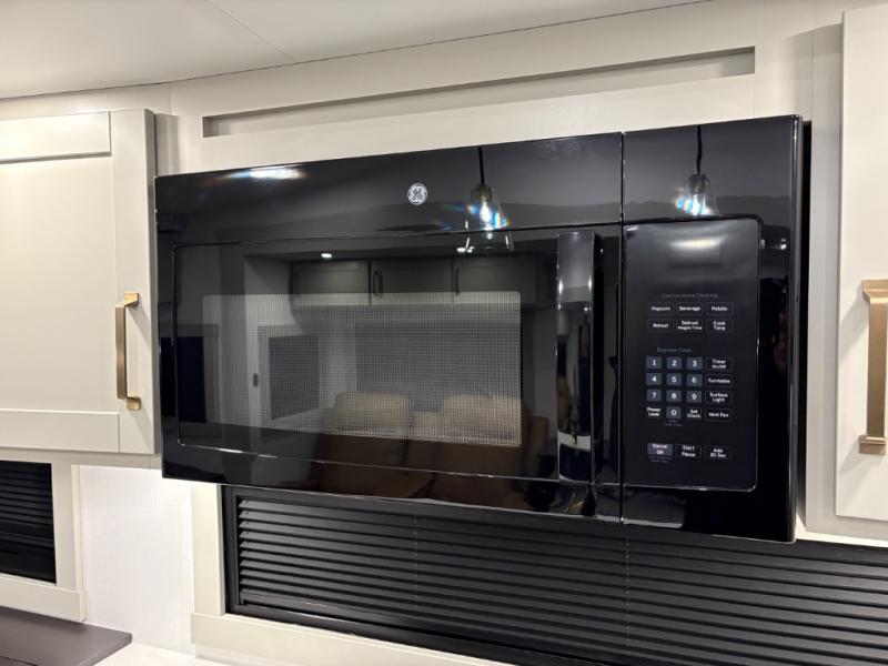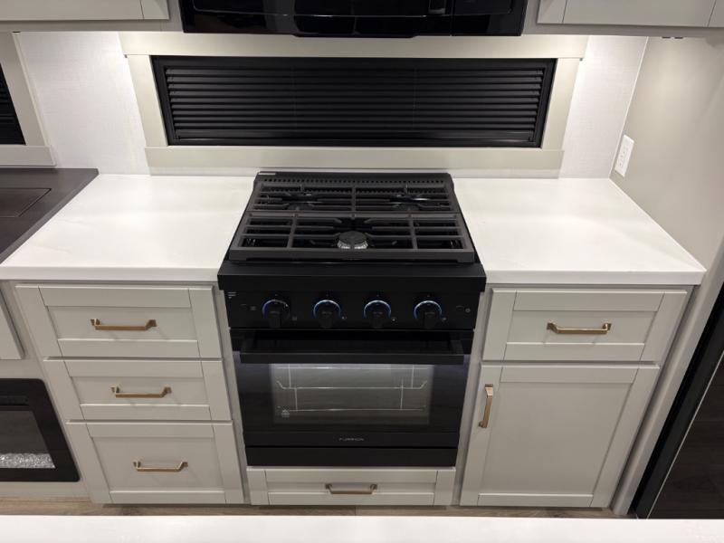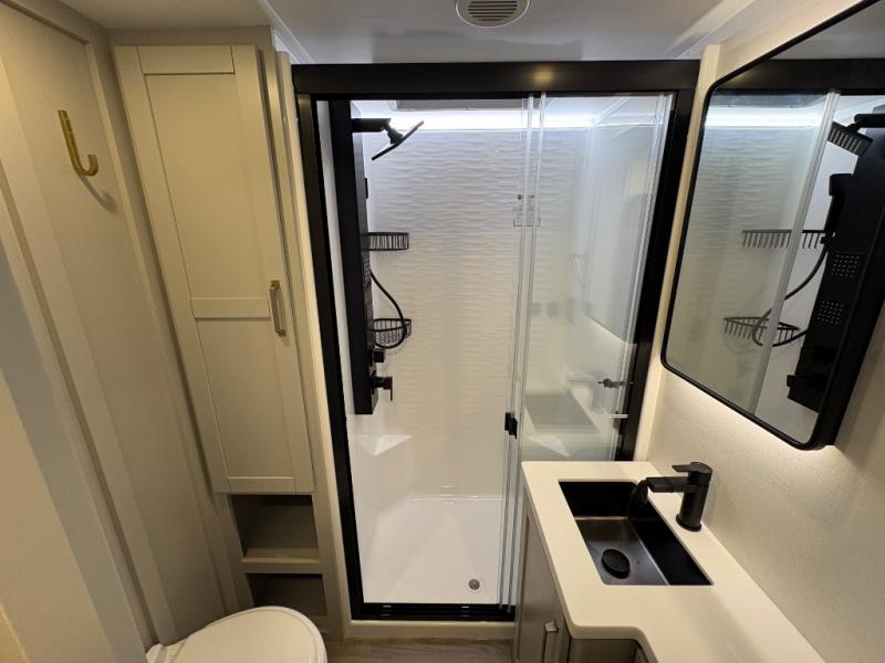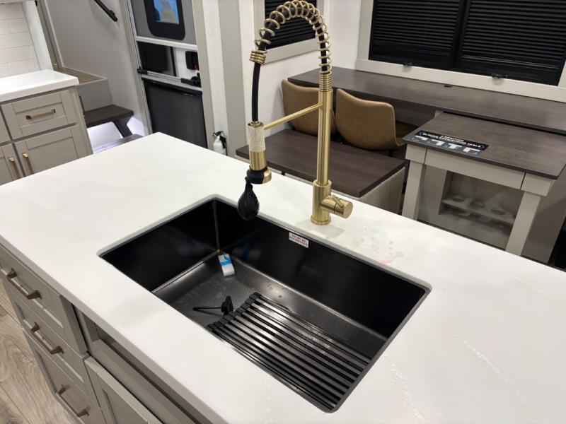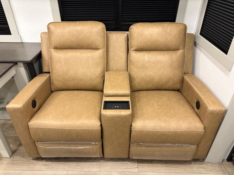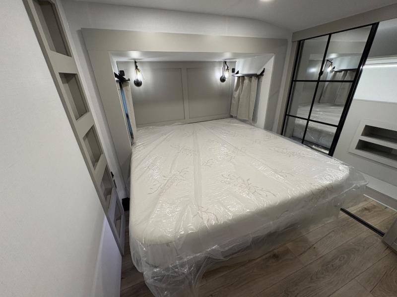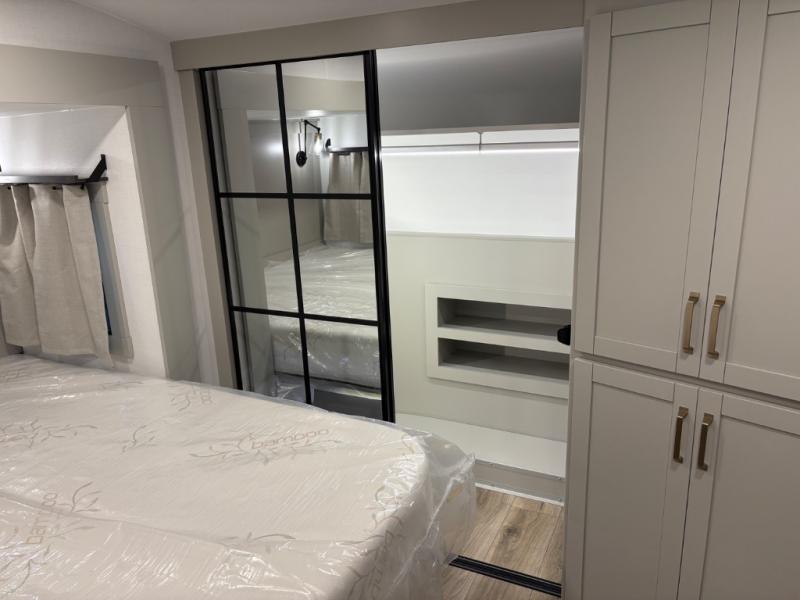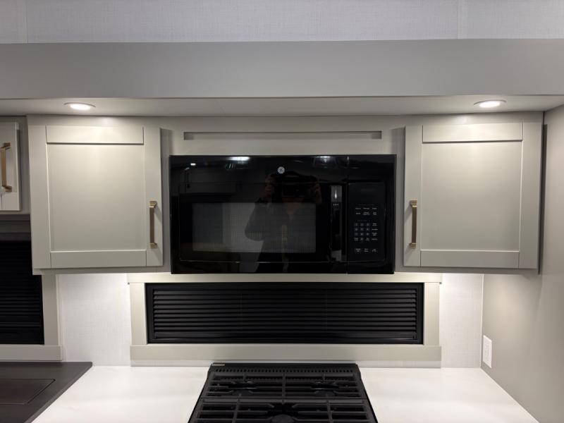 This Model Z luxury fifth wheel is bright and modern on the inside, with loads of amenities that will have you dreaming of your next trip! Enter and find a spacious combined living/kitchen space thanks to dual opposing slides. There is ample seating with a sliding desk/dining table, 62" theater seating, and a 72" tri-fold sofa along the rear wall. You can easily relax and enjoy the 50" Smart telescoping TV with a cozy fireplace below. The kitchen offers all that you need to prepare and cook meals just like home with a 16 cu. ft. refrigerator for your perishables, a 30" microwave oven, and three burner range top and oven. You will love the integrated spice rack, and the kitchen island all outfitted with dog bowls and double pull out trash bins with an integrated Stow 'N Go paper towel holder. There is also an 84" pantry with adjustable shelves for all of your canned and dry goods. Head up the steps to a private master suite with king bed slide. You can opt for the queen bed if you like. A sliding dresser top features hidden storage which is perfect for jewelry and other personal belongings. The front wardrobe features mirrored doors and the corner closet has been prepped for a stackable washer and dryer if you choose to add that option. Relax and enjoy a large bath featuring a linen cabinet, a 30" x 42" shower, and vanity with sink, plus medicine cabinet.