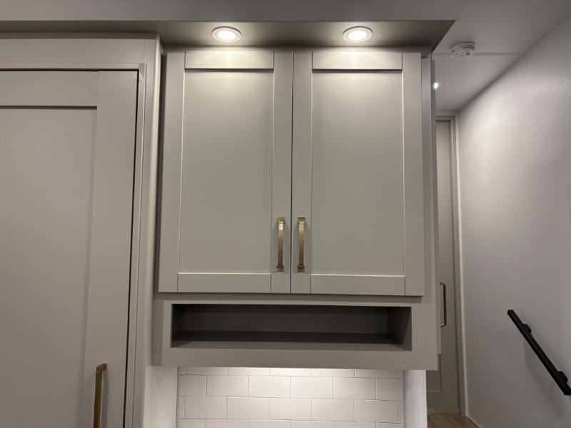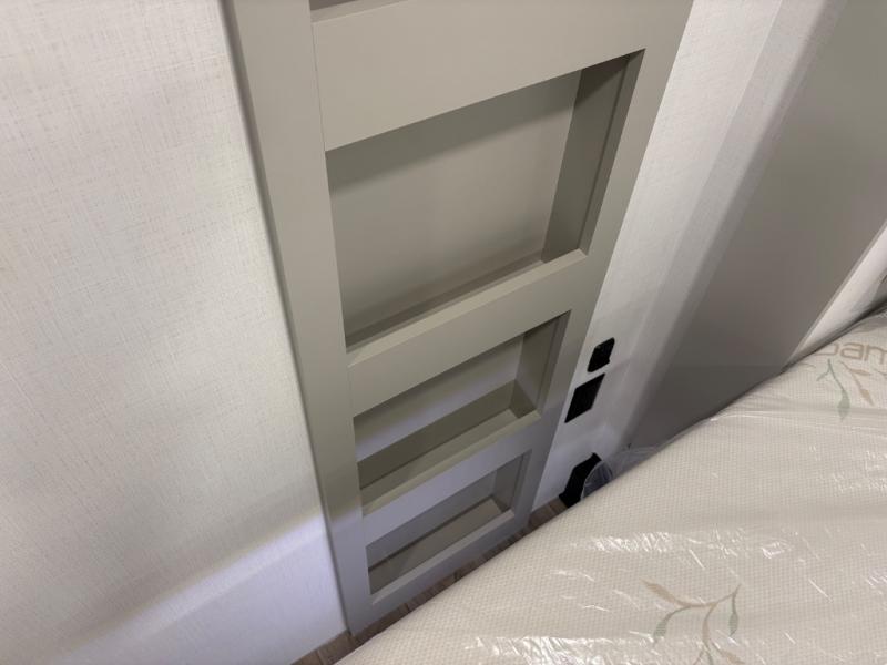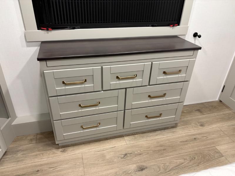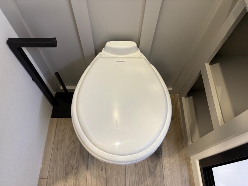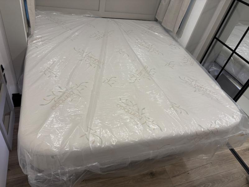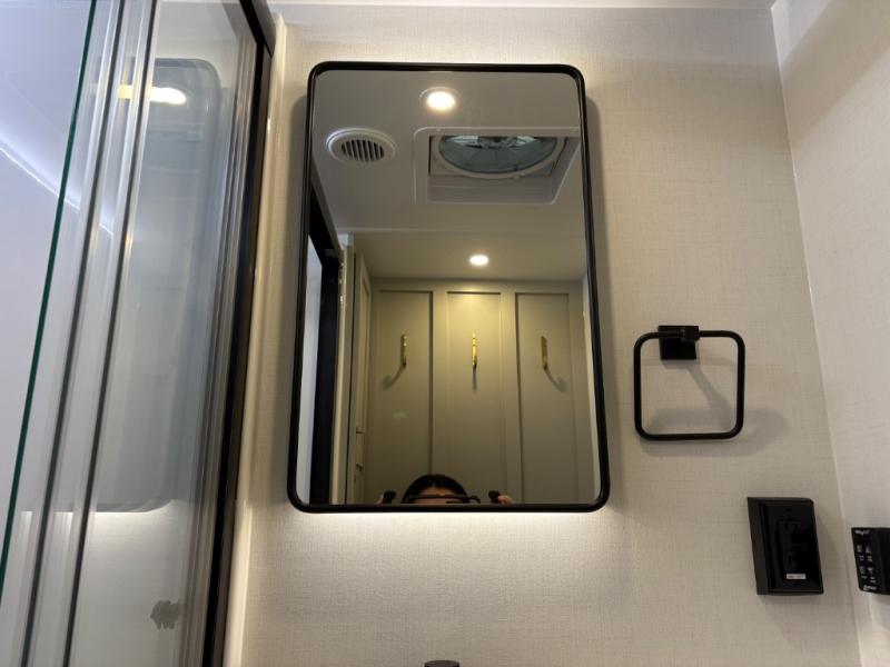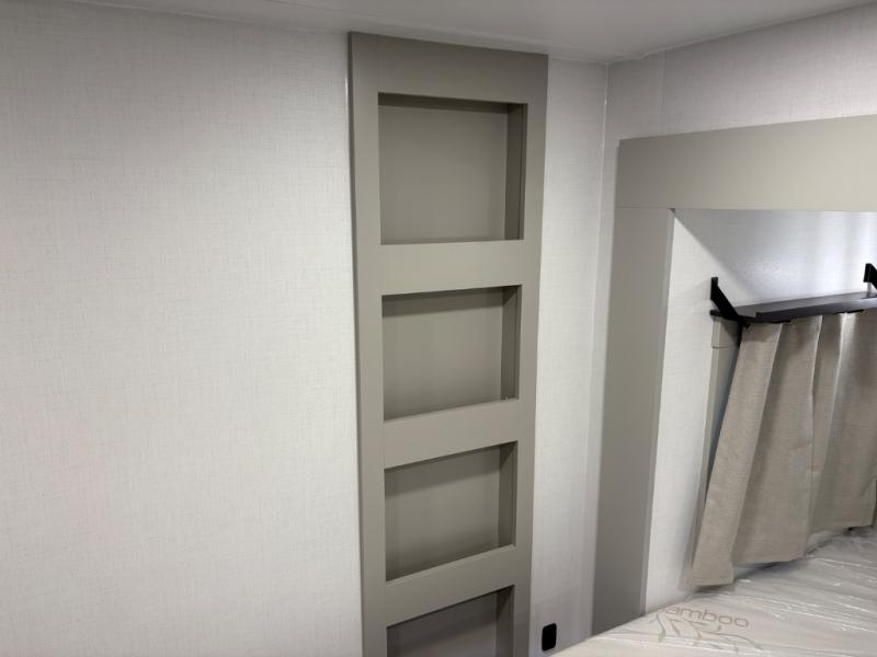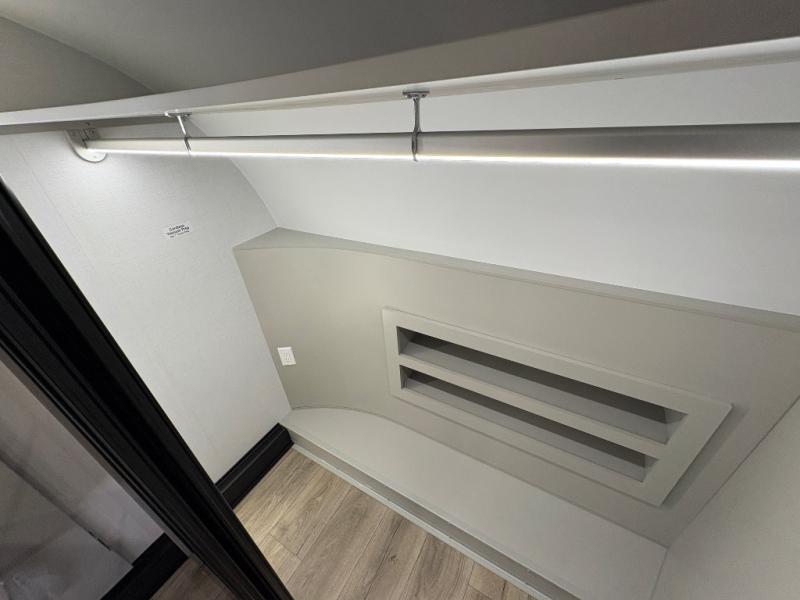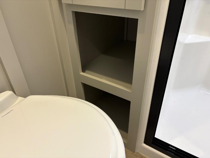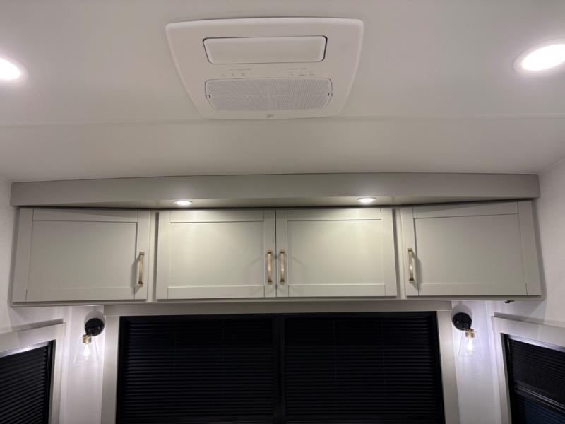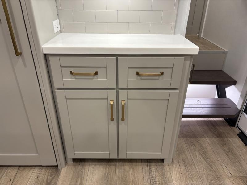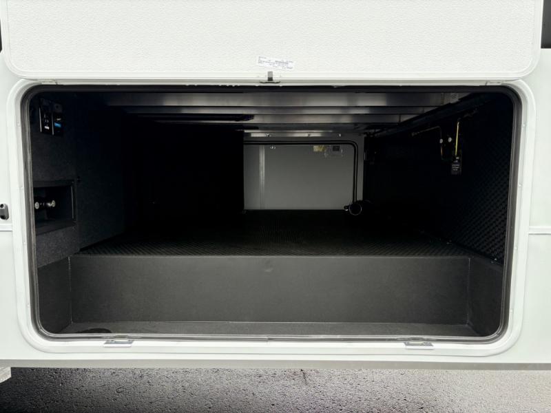 This Model Z luxury fifth wheel is bright and modern on the inside, with loads of amenities that will have you dreaming of your next trip! Enter and find a spacious combined living/kitchen space thanks to dual opposing slides. There is ample seating with a sliding desk/dining table, 62" theater seating, and a 72" tri-fold sofa along the rear wall. You can easily relax and enjoy the 50" Smart telescoping TV with a cozy fireplace below. The kitchen offers all that you need to prepare and cook meals just like home with a 16 cu. ft. refrigerator for your perishables, a 30" microwave oven, and three burner range top and oven. You will love the integrated spice rack, and the kitchen island all outfitted with dog bowls and double pull out trash bins with an integrated Stow 'N Go paper towel holder. There is also an 84" pantry with adjustable shelves for all of your canned and dry goods. Head up the steps to a private master suite with king bed slide. You can opt for the queen bed if you like. A sliding dresser top features hidden storage which is perfect for jewelry and other personal belongings. The front wardrobe features mirrored doors and the corner closet has been prepped for a stackable washer and dryer if you choose to add that option. Relax and enjoy a large bath featuring a linen cabinet, a 30" x 42" shower, and vanity with sink, plus medicine cabinet.