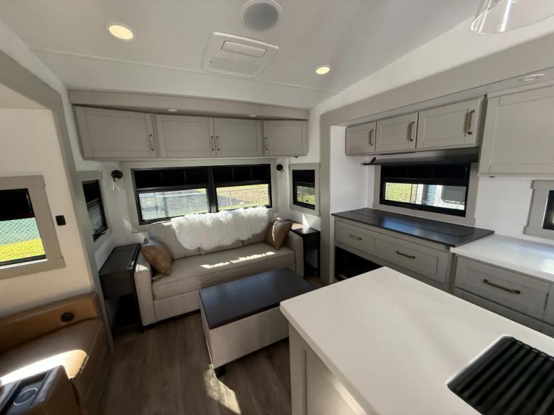 This Model Z luxury fifth wheel is bright and modern on the inside, with loads of amenities that will have you dreaming of your next trip! Enter and find a spacious combined living/kitchen space thanks to dual opposing slides. There is ample seating with a sliding desk/dining table, 62" theater seating, and a 72" tri-fold sofa along the rear wall. You can easily relax and enjoy the 50" Smart telescoping TV with a cozy fireplace below. The kitchen offers all that you need to prepare and cook meals just like home with a 16 cu. ft. refrigerator for your perishables, a 30" microwave oven, and three burner range top and oven. You will love the integrated spice rack, and the kitchen island all outfitted with dog bowls and double pull out trash bins with an integrated Stow 'N Go paper towel holder. There is also an 84" pantry with adjustable shelves for all of your canned and dry goods. Head up the steps to a private master suite with king bed slide. You can opt for the queen bed if you like. A sliding dresser top features hidden storage which is perfect for jewelry and other personal belongings. The front wardrobe features mirrored doors and the corner closet has been prepped for a stackable washer and dryer if you choose to add that option. Relax and enjoy a large bath featuring a linen cabinet, a 30" x 42" shower, and vanity with sink, plus medicine cabinet.