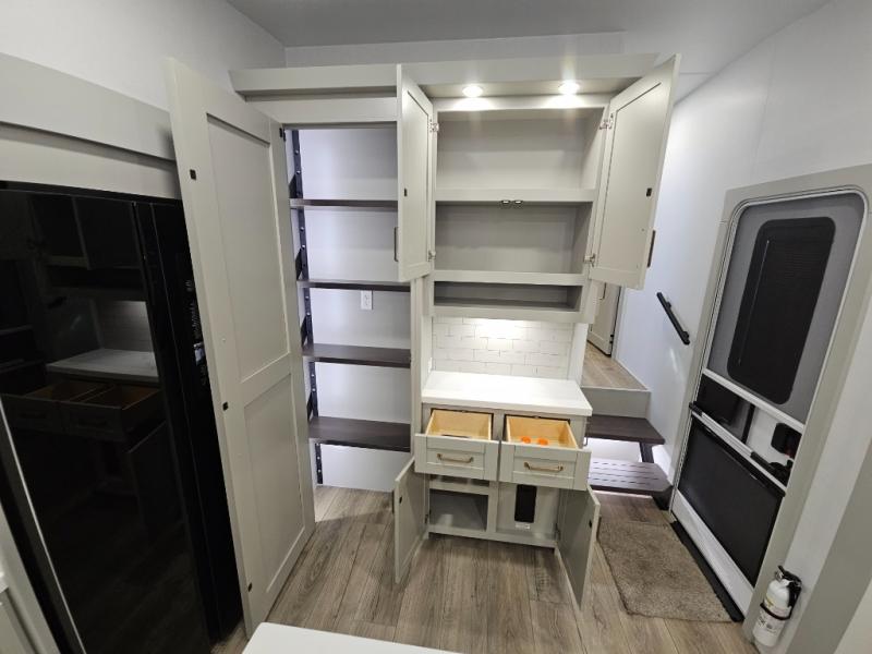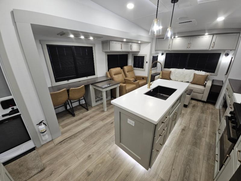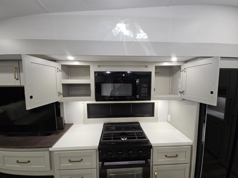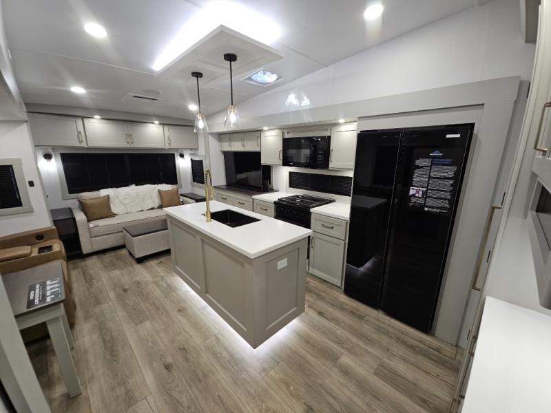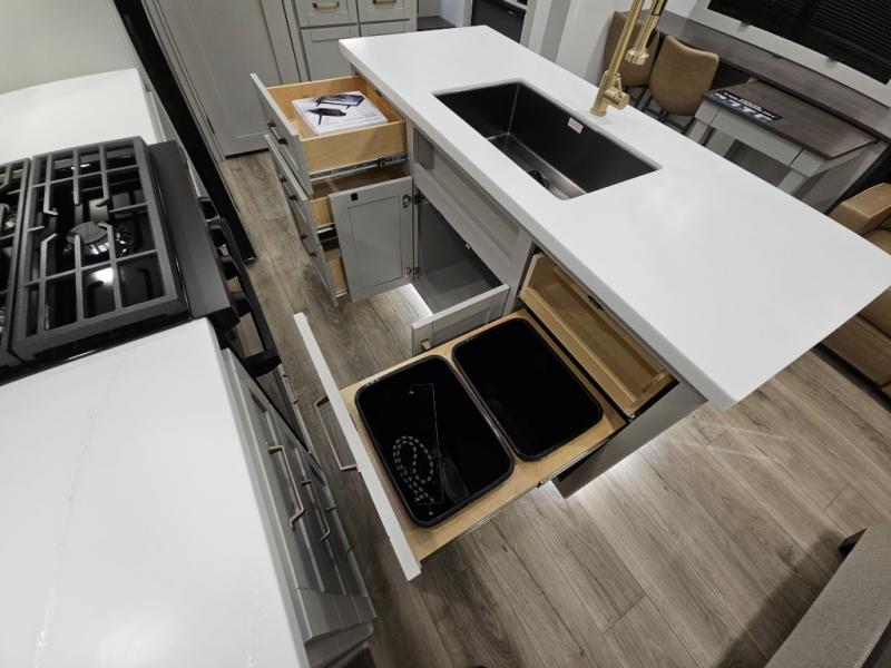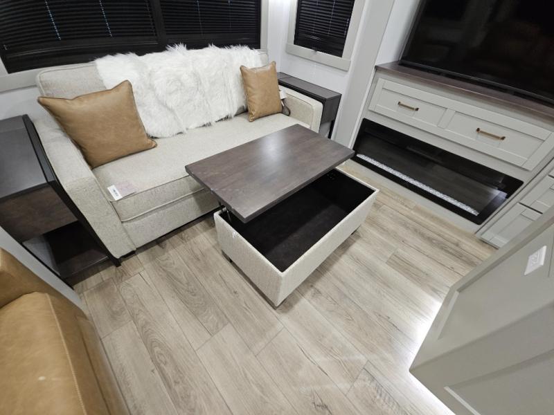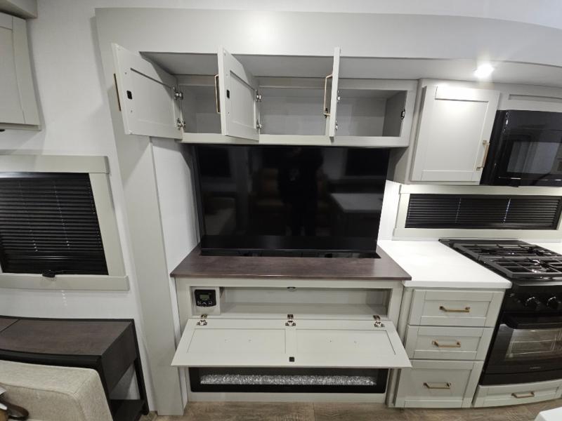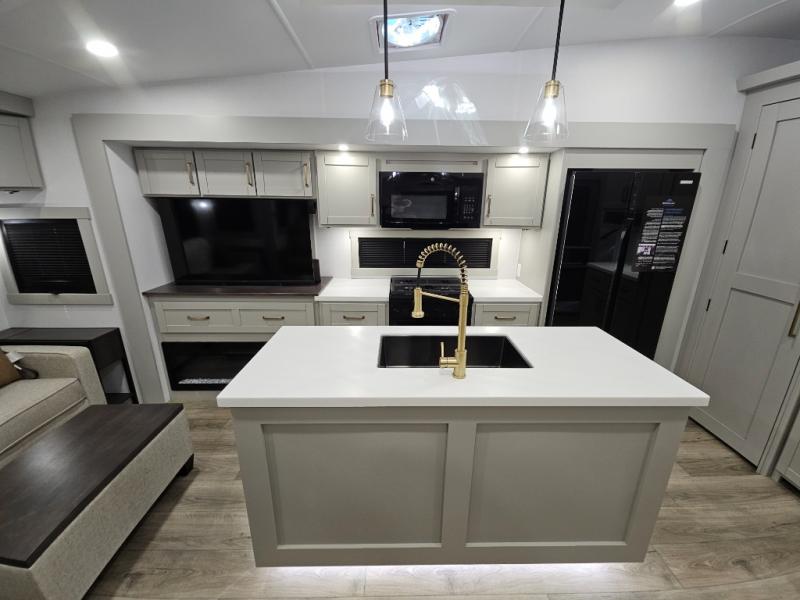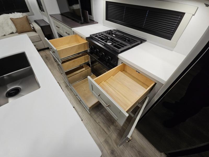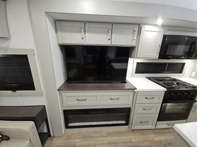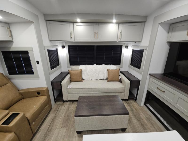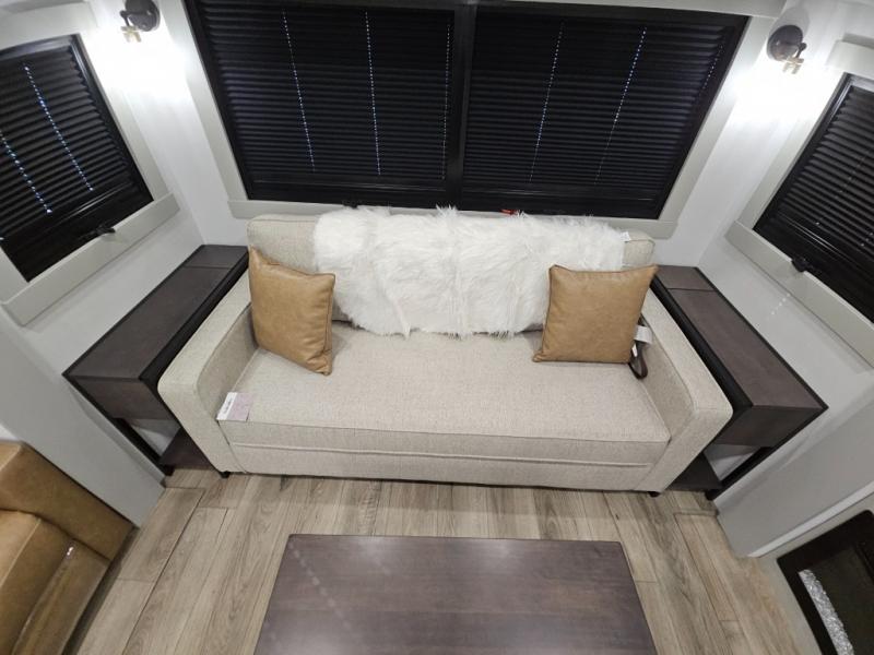 This Model Z luxury fifth wheel is bright and modern on the inside, with loads of amenities that will have you dreaming of your next trip! Enter and find a spacious combined living/kitchen space thanks to dual opposing slides. There is ample seating with a sliding desk/dining table, 62" theater seating, and a 72" tri-fold sofa along the rear wall. You can easily relax and enjoy the 50" Smart telescoping TV with a cozy fireplace below. The kitchen offers all that you need to prepare and cook meals just like home with a 16 cu. ft. refrigerator for your perishables, a 30" microwave oven, and three burner range top and oven. You will love the integrated spice rack, and the kitchen island all outfitted with dog bowls and double pull out trash bins with an integrated Stow 'N Go paper towel holder. There is also an 84" pantry with adjustable shelves for all of your canned and dry goods. Head up the steps to a private master suite with king bed slide. You can opt for the queen bed if you like. A sliding dresser top features hidden storage which is perfect for jewelry and other personal belongings. The front wardrobe features mirrored doors and the corner closet has been prepped for a stackable washer and dryer if you choose to add that option. Relax and enjoy a large bath featuring a linen cabinet, a 30" x 42" shower, and vanity with sink, plus medicine cabinet.