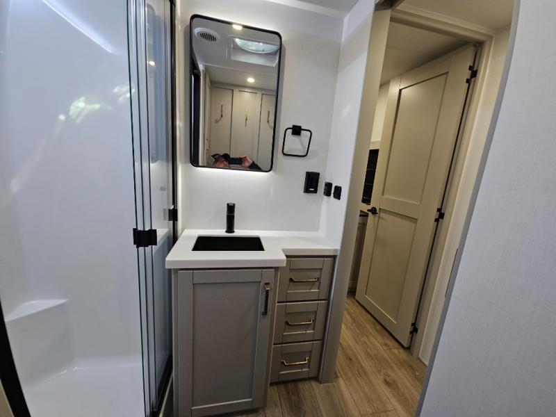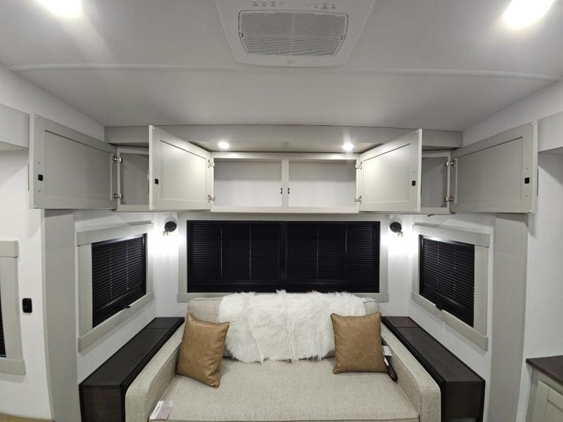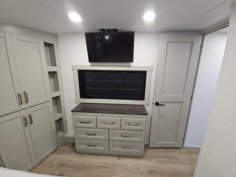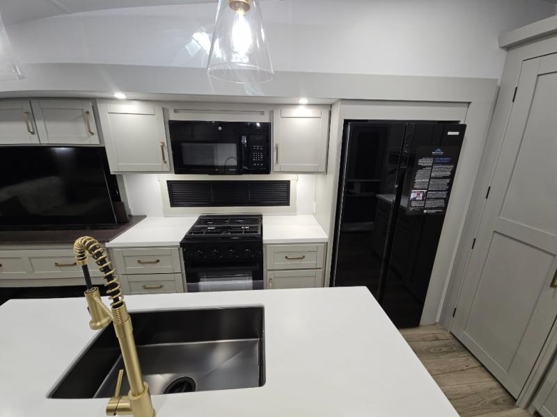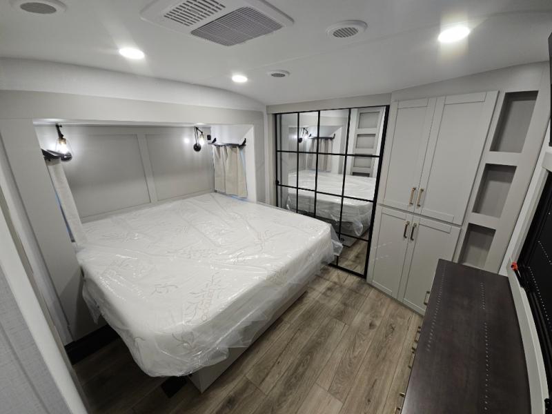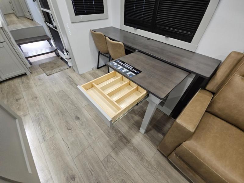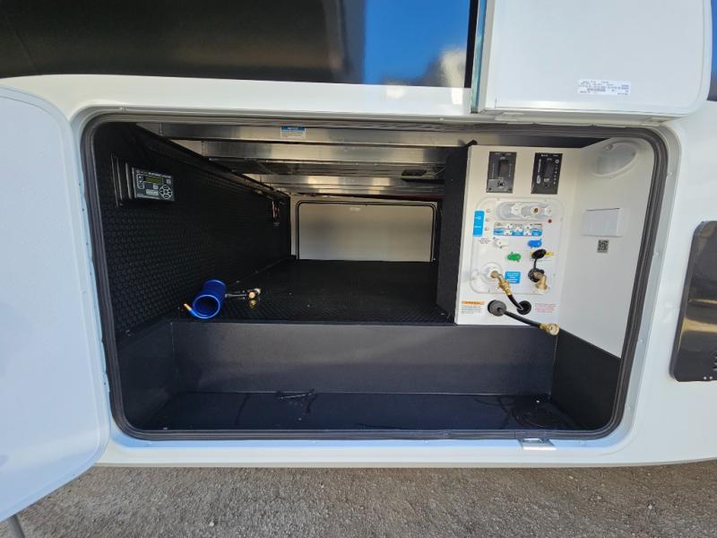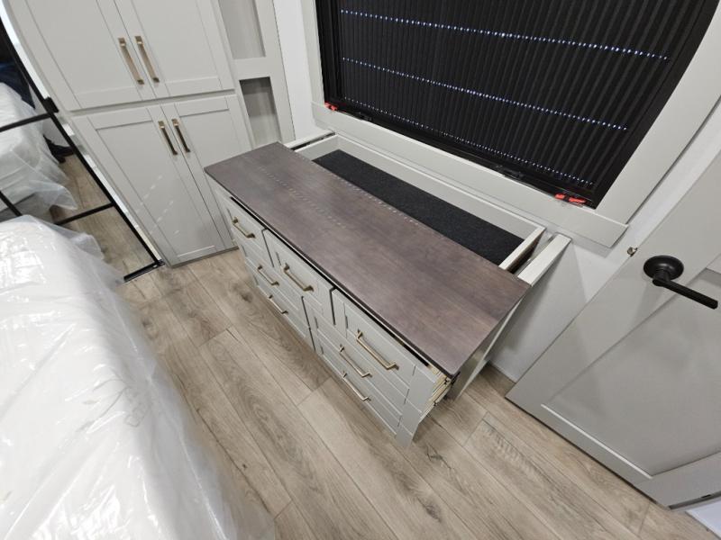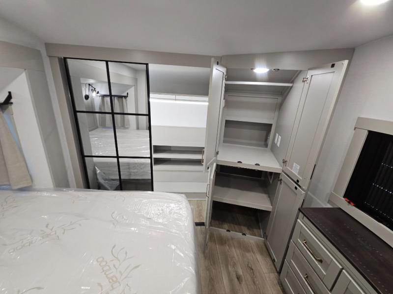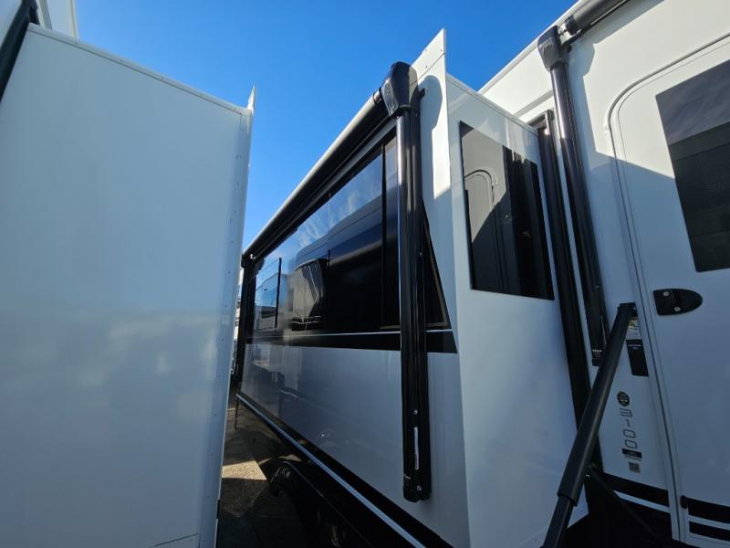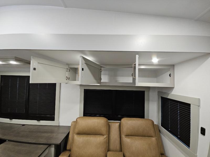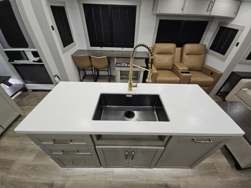 This Model Z luxury fifth wheel is bright and modern on the inside, with loads of amenities that will have you dreaming of your next trip! Enter and find a spacious combined living/kitchen space thanks to dual opposing slides. There is ample seating with a sliding desk/dining table, 62" theater seating, and a 72" tri-fold sofa along the rear wall. You can easily relax and enjoy the 50" Smart telescoping TV with a cozy fireplace below. The kitchen offers all that you need to prepare and cook meals just like home with a 16 cu. ft. refrigerator for your perishables, a 30" microwave oven, and three burner range top and oven. You will love the integrated spice rack, and the kitchen island all outfitted with dog bowls and double pull out trash bins with an integrated Stow 'N Go paper towel holder. There is also an 84" pantry with adjustable shelves for all of your canned and dry goods. Head up the steps to a private master suite with king bed slide. You can opt for the queen bed if you like. A sliding dresser top features hidden storage which is perfect for jewelry and other personal belongings. The front wardrobe features mirrored doors and the corner closet has been prepped for a stackable washer and dryer if you choose to add that option. Relax and enjoy a large bath featuring a linen cabinet, a 30" x 42" shower, and vanity with sink, plus medicine cabinet.