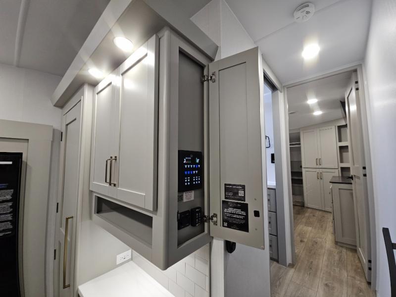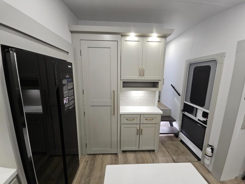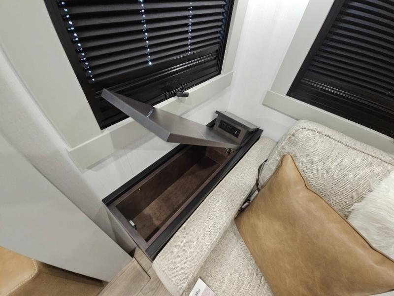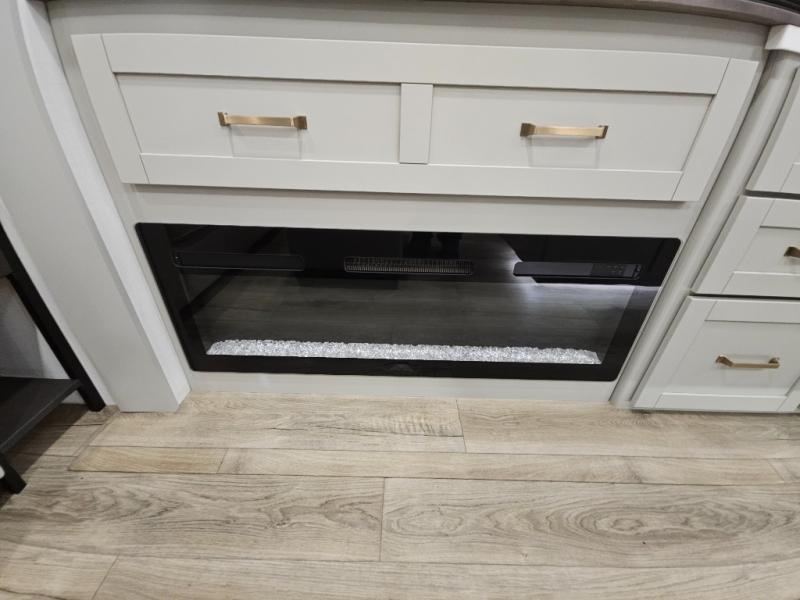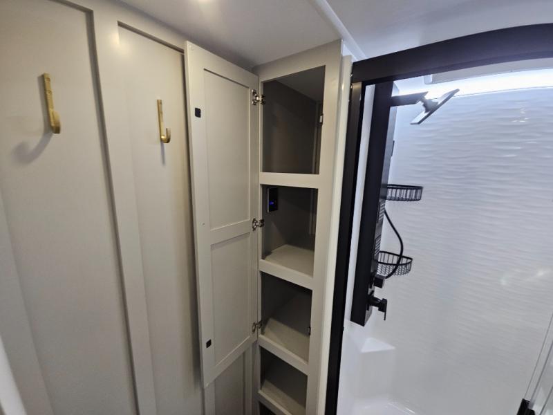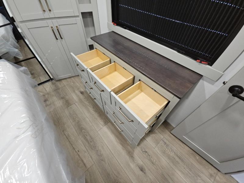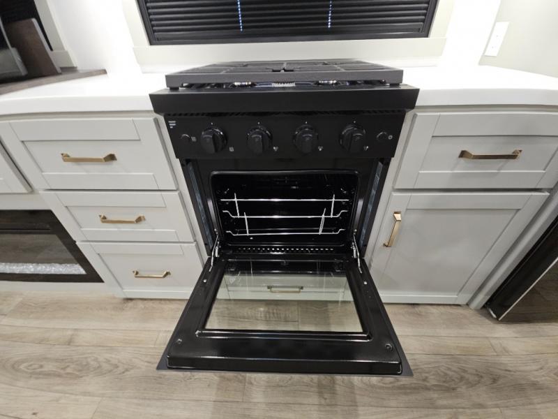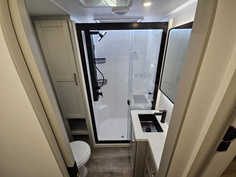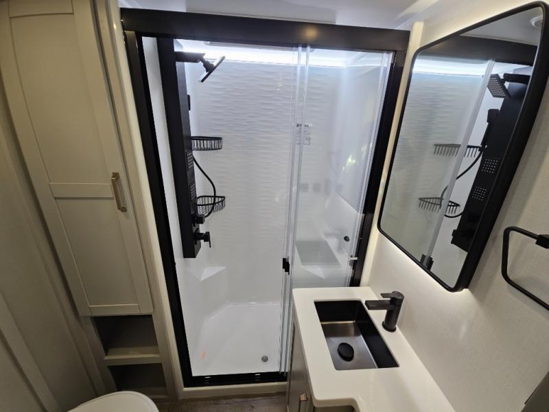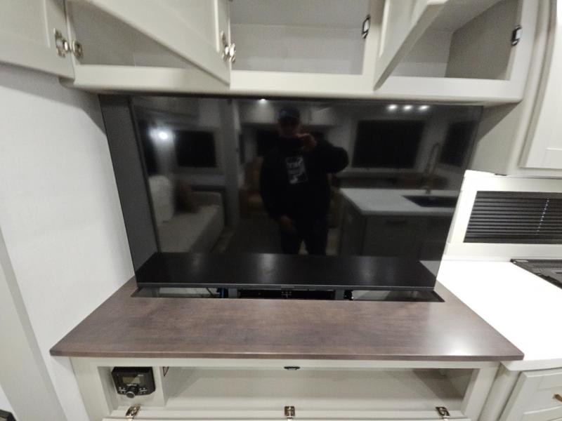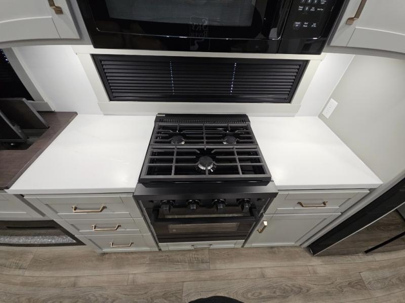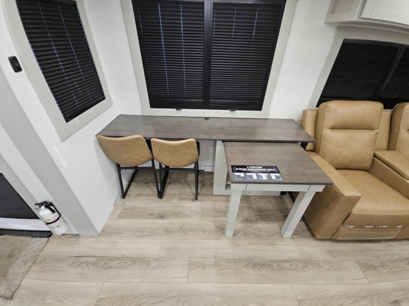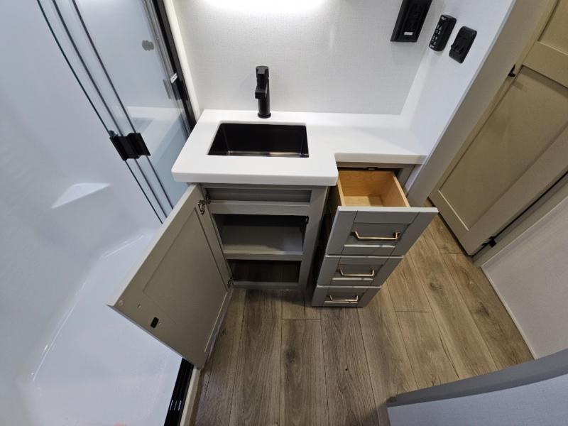 This Model Z luxury fifth wheel is bright and modern on the inside, with loads of amenities that will have you dreaming of your next trip! Enter and find a spacious combined living/kitchen space thanks to dual opposing slides. There is ample seating with a sliding desk/dining table, 62" theater seating, and a 72" tri-fold sofa along the rear wall. You can easily relax and enjoy the 50" Smart telescoping TV with a cozy fireplace below. The kitchen offers all that you need to prepare and cook meals just like home with a 16 cu. ft. refrigerator for your perishables, a 30" microwave oven, and three burner range top and oven. You will love the integrated spice rack, and the kitchen island all outfitted with dog bowls and double pull out trash bins with an integrated Stow 'N Go paper towel holder. There is also an 84" pantry with adjustable shelves for all of your canned and dry goods. Head up the steps to a private master suite with king bed slide. You can opt for the queen bed if you like. A sliding dresser top features hidden storage which is perfect for jewelry and other personal belongings. The front wardrobe features mirrored doors and the corner closet has been prepped for a stackable washer and dryer if you choose to add that option. Relax and enjoy a large bath featuring a linen cabinet, a 30" x 42" shower, and vanity with sink, plus medicine cabinet.