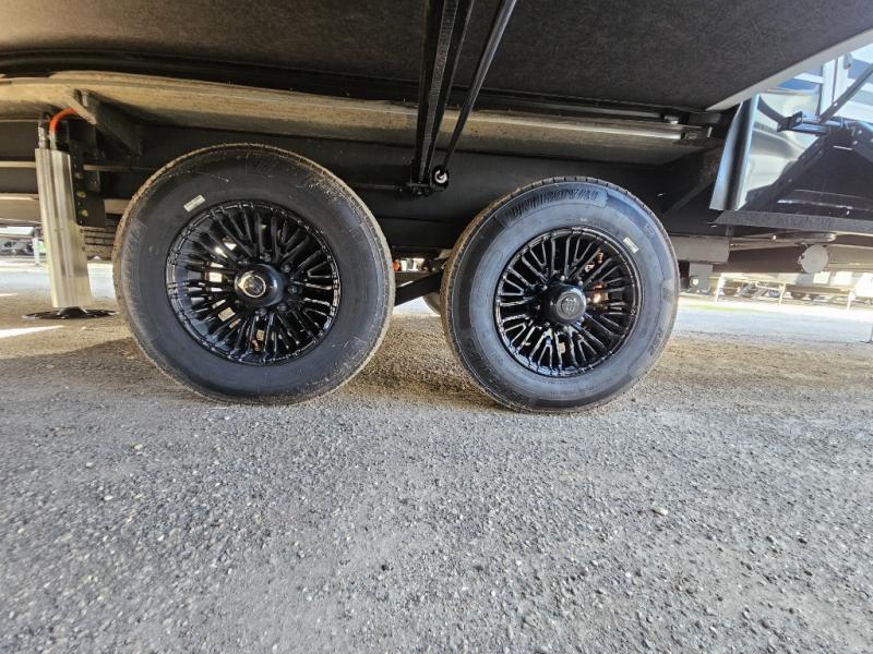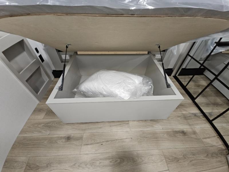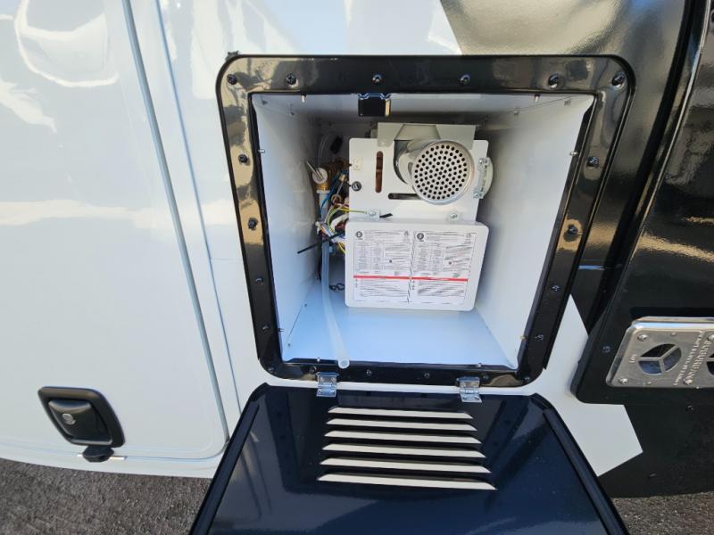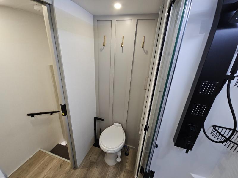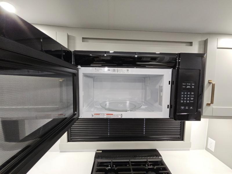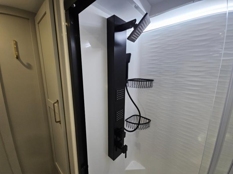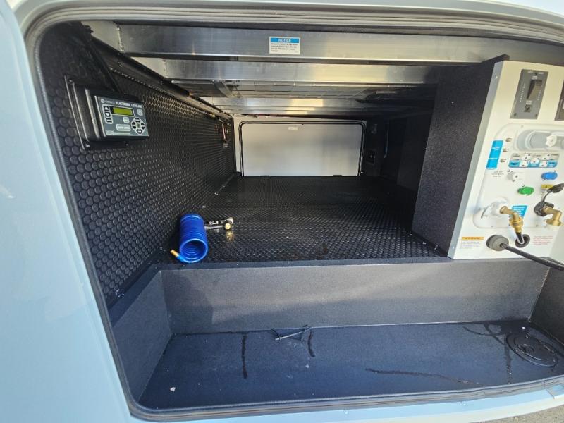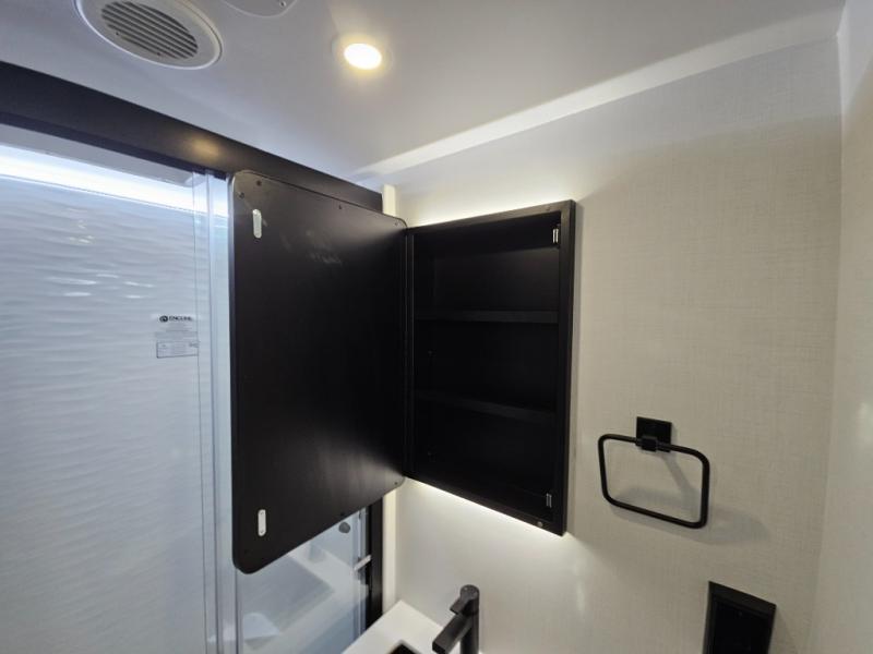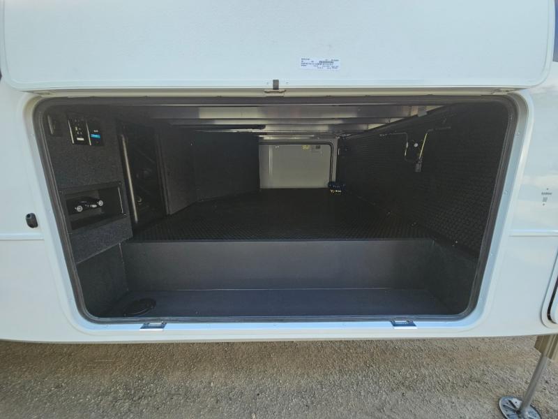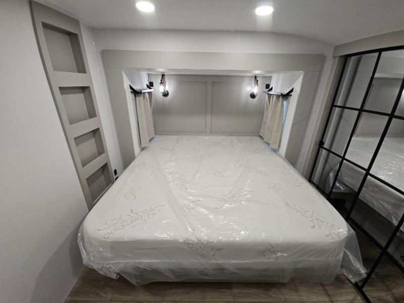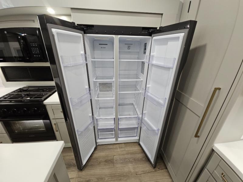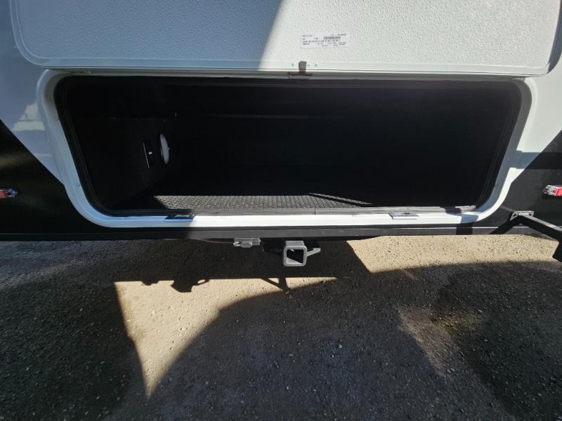 This Model Z luxury fifth wheel is bright and modern on the inside, with loads of amenities that will have you dreaming of your next trip! Enter and find a spacious combined living/kitchen space thanks to dual opposing slides. There is ample seating with a sliding desk/dining table, 62" theater seating, and a 72" tri-fold sofa along the rear wall. You can easily relax and enjoy the 50" Smart telescoping TV with a cozy fireplace below. The kitchen offers all that you need to prepare and cook meals just like home with a 16 cu. ft. refrigerator for your perishables, a 30" microwave oven, and three burner range top and oven. You will love the integrated spice rack, and the kitchen island all outfitted with dog bowls and double pull out trash bins with an integrated Stow 'N Go paper towel holder. There is also an 84" pantry with adjustable shelves for all of your canned and dry goods. Head up the steps to a private master suite with king bed slide. You can opt for the queen bed if you like. A sliding dresser top features hidden storage which is perfect for jewelry and other personal belongings. The front wardrobe features mirrored doors and the corner closet has been prepped for a stackable washer and dryer if you choose to add that option. Relax and enjoy a large bath featuring a linen cabinet, a 30" x 42" shower, and vanity with sink, plus medicine cabinet.