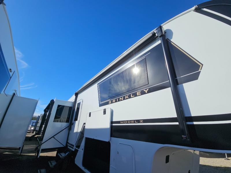 The Brinkley mid-profile Model Z fifth wheels bring you clean lines and an upscale look with plenty of style and exciting new features like the industry first brass plumbing connections. These units also feature an automotive grade front cap, plenty of exterior storage, dual exterior hot and cold showers, and wide stance leveling jacks for easy set up. Residential frameless windows provide a clean look and beautiful views, and ample electrical outlets and 6 USB/USB-C outlets allow all of your electronics and appliances to easily be used and charged.