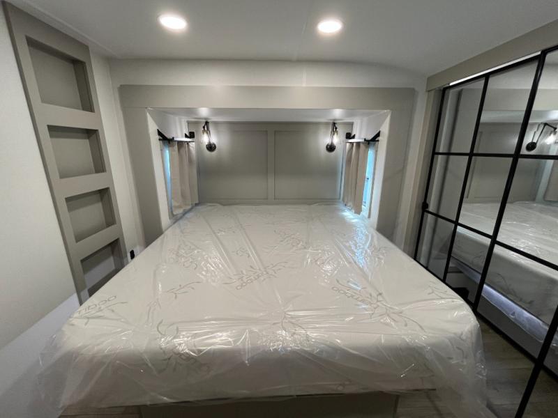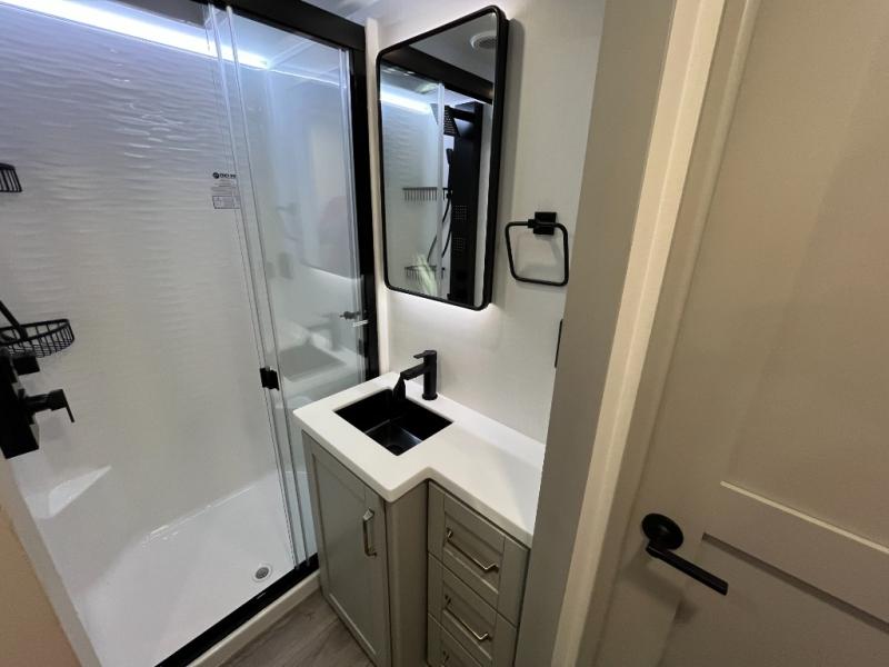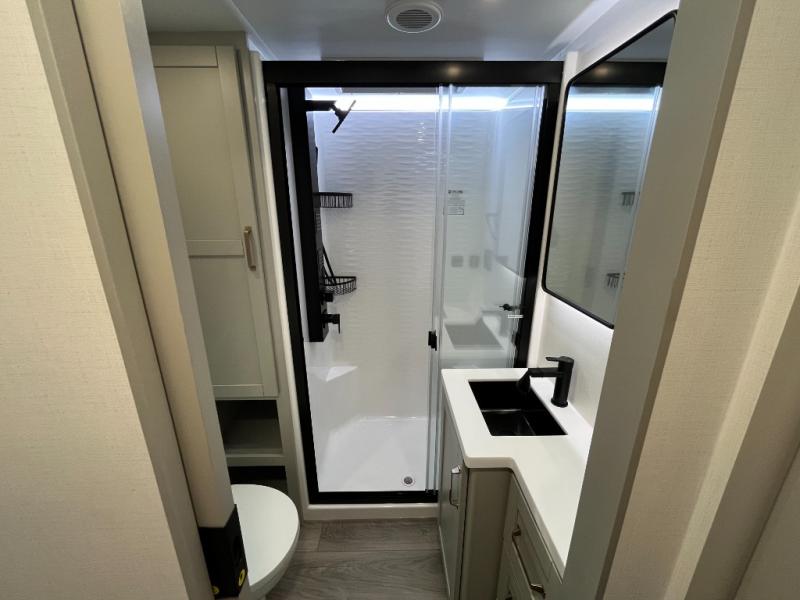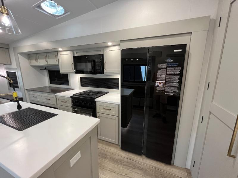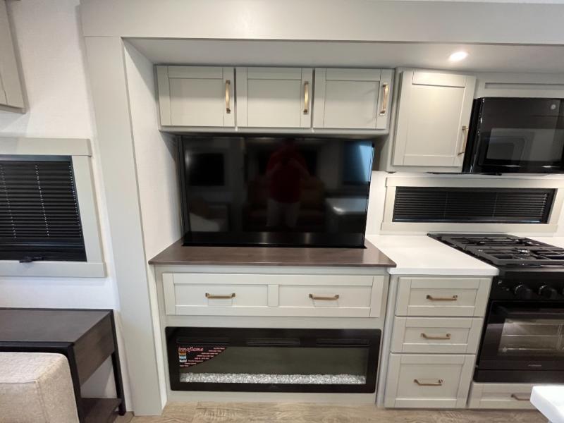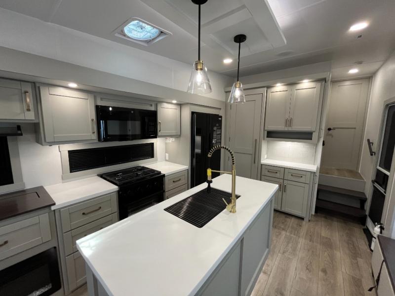 This Model Z luxury fifth wheel is bright and modern on the inside, with loads of amenities that will have you dreaming of your next trip! Enter and find a spacious combined living/kitchen space thanks to dual opposing slides. There is ample seating with a sliding desk/dining table, 62" theater seating, and a 72" tri-fold sofa along the rear wall. You can easily relax and enjoy the 50" Smart telescoping TV with a cozy fireplace below. The kitchen offers all that you need to prepare and cook meals just like home with a 16 cu. ft. refrigerator for your perishables, a 30" microwave oven, and three burner range top and oven. You will love the integrated spice rack, and the kitchen island all outfitted with dog bowls and double pull out trash bins with an integrated Stow 'N Go paper towel holder. There is also an 84" pantry with adjustable shelves for all of your canned and dry goods. Head up the steps to a private master suite with king bed slide. You can opt for the queen bed if you like. A sliding dresser top features hidden storage which is perfect for jewelry and other personal belongings. The front wardrobe features mirrored doors and the corner closet has been prepped for a stackable washer and dryer if you choose to add that option. Relax and enjoy a large bath featuring a linen cabinet, a 30" x 42" shower, and vanity with sink, plus medicine cabinet.