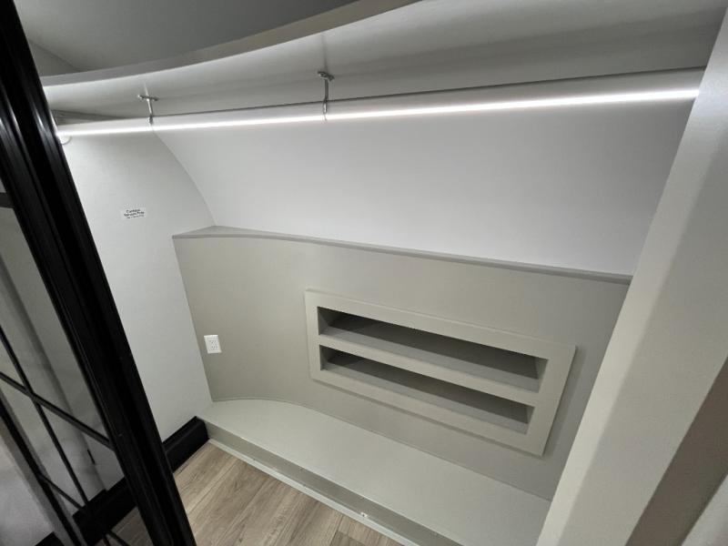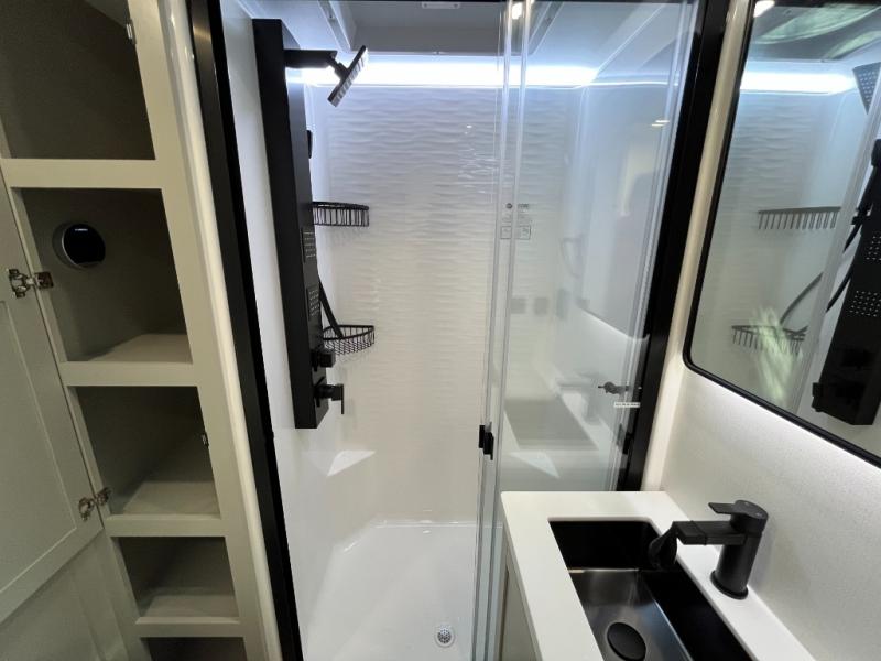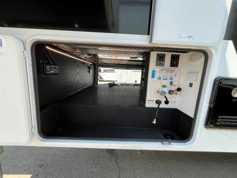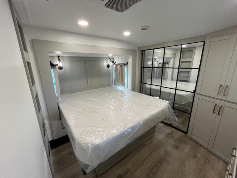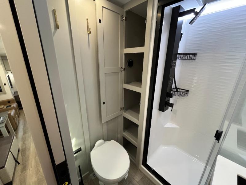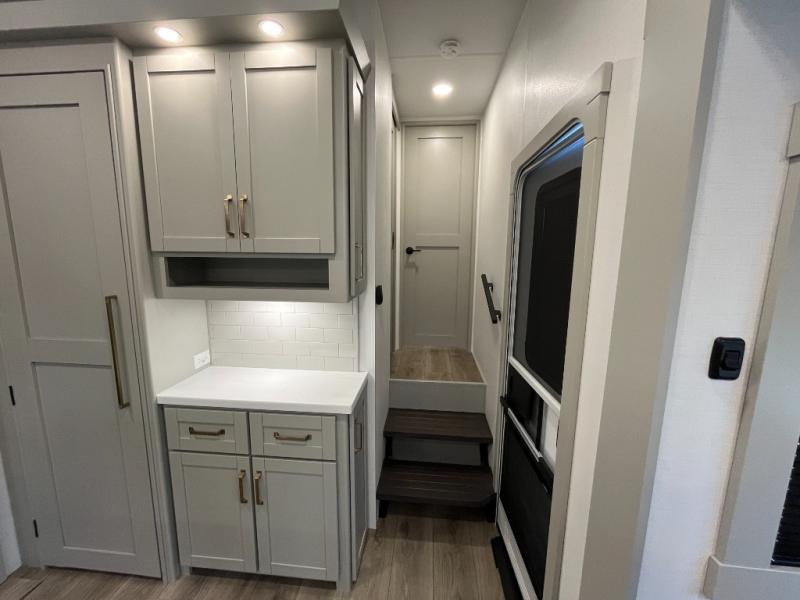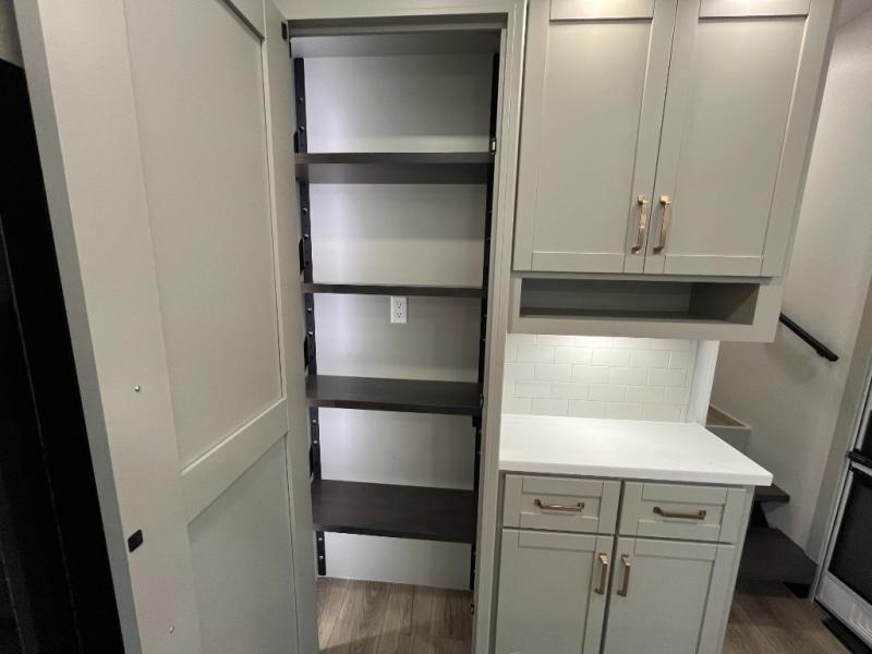 This Model Z luxury fifth wheel is bright and modern on the inside, with loads of amenities that will have you dreaming of your next trip! Enter and find a spacious combined living/kitchen space thanks to dual opposing slides. There is ample seating with a sliding desk/dining table, 62" theater seating, and a 72" tri-fold sofa along the rear wall. You can easily relax and enjoy the 50" Smart telescoping TV with a cozy fireplace below. The kitchen offers all that you need to prepare and cook meals just like home with a 16 cu. ft. refrigerator for your perishables, a 30" microwave oven, and three burner range top and oven. You will love the integrated spice rack, and the kitchen island all outfitted with dog bowls and double pull out trash bins with an integrated Stow 'N Go paper towel holder. There is also an 84" pantry with adjustable shelves for all of your canned and dry goods. Head up the steps to a private master suite with king bed slide. You can opt for the queen bed if you like. A sliding dresser top features hidden storage which is perfect for jewelry and other personal belongings. The front wardrobe features mirrored doors and the corner closet has been prepped for a stackable washer and dryer if you choose to add that option. Relax and enjoy a large bath featuring a linen cabinet, a 30" x 42" shower, and vanity with sink, plus medicine cabinet.