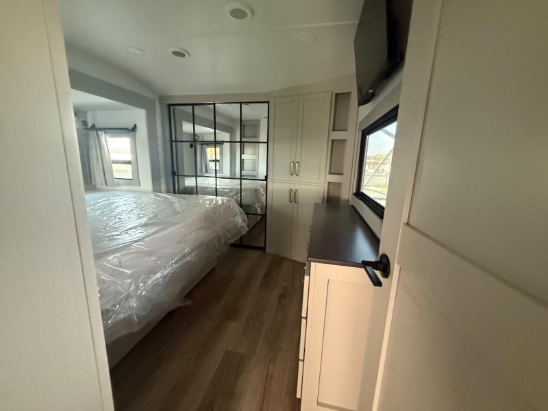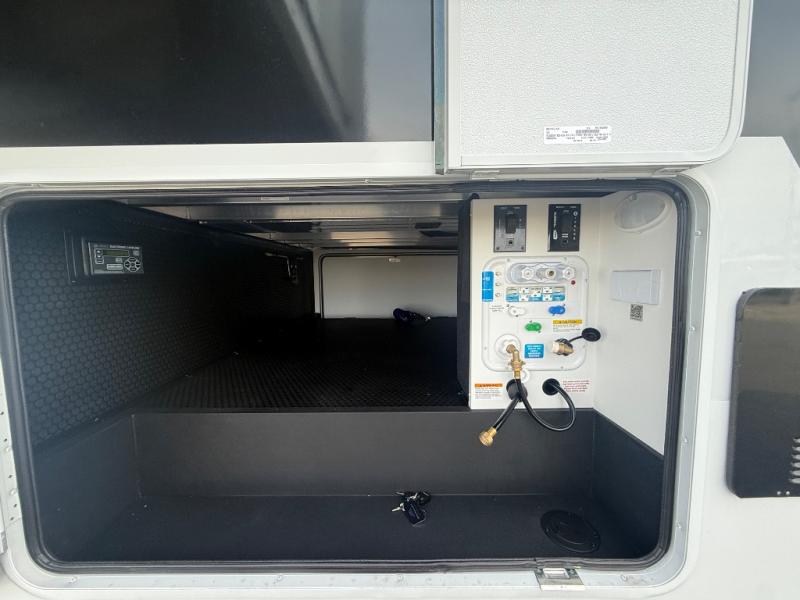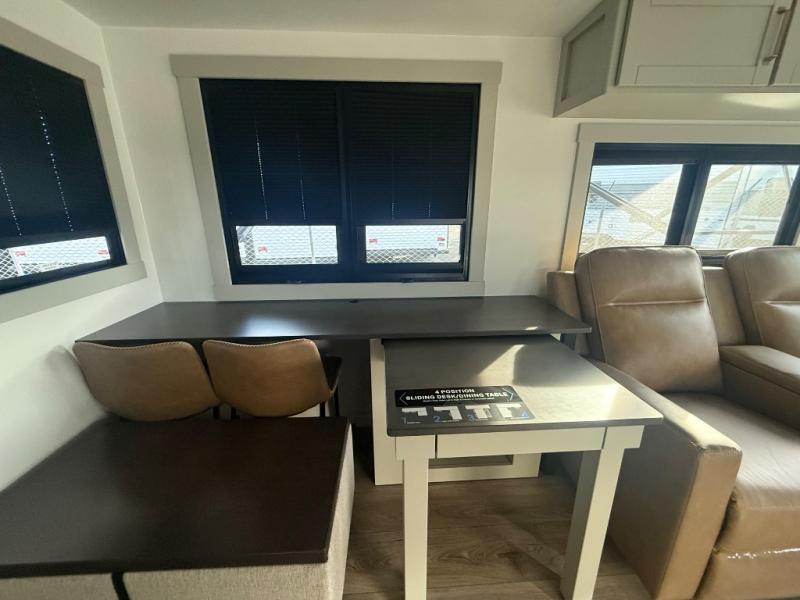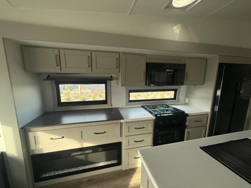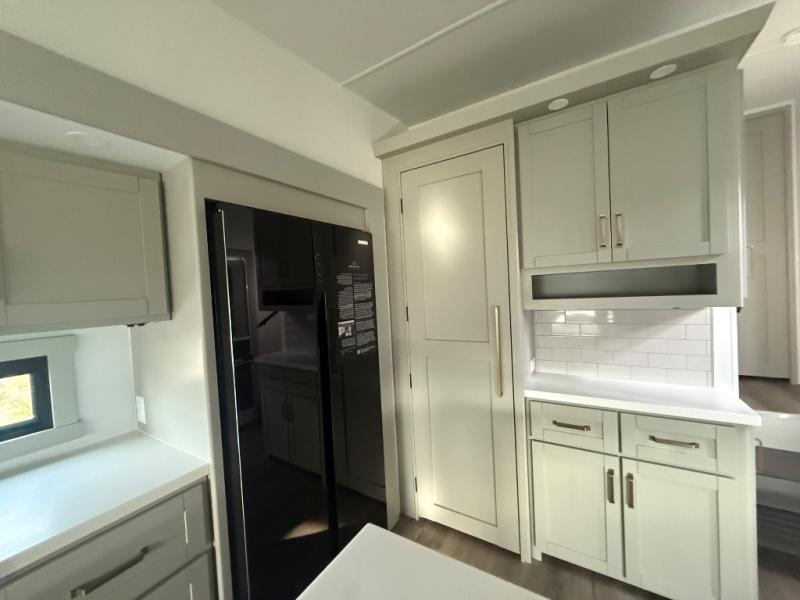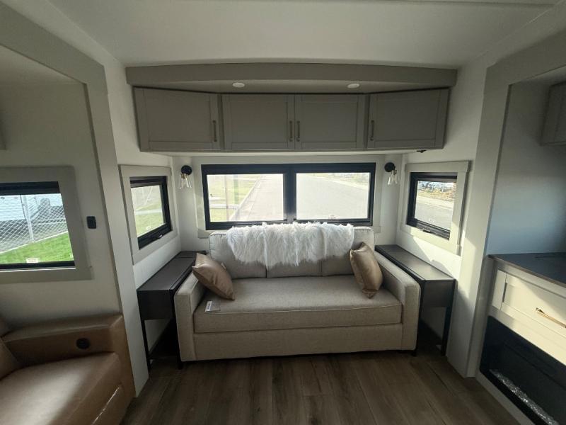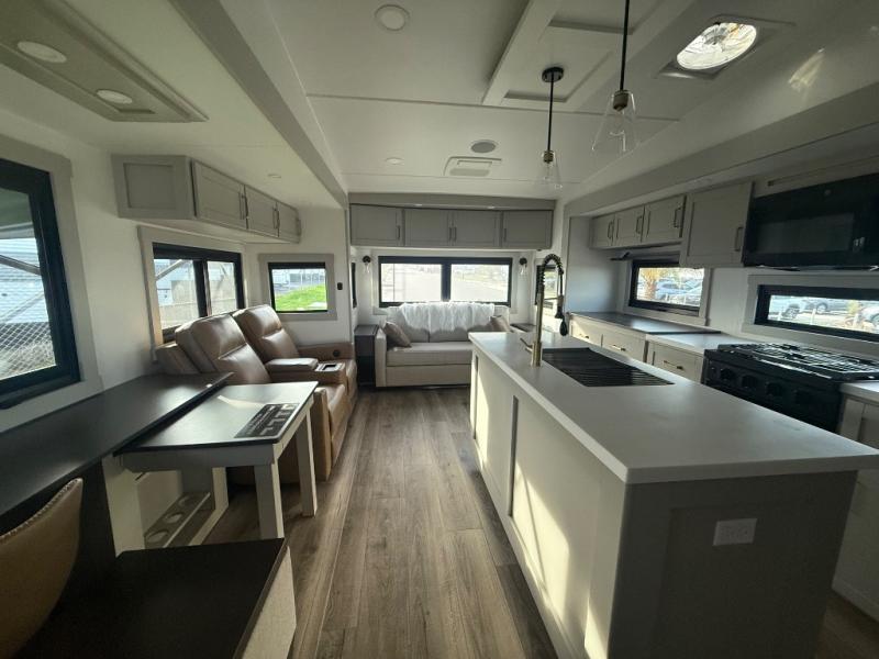 This Model Z luxury fifth wheel is bright and modern on the inside, with loads of amenities that will have you dreaming of your next trip! Enter and find a spacious combined living/kitchen space thanks to dual opposing slides. There is ample seating with a sliding desk/dining table, 62" theater seating, and a 72" tri-fold sofa along the rear wall. You can easily relax and enjoy the 50" Smart telescoping TV with a cozy fireplace below. The kitchen offers all that you need to prepare and cook meals just like home with a 16 cu. ft. refrigerator for your perishables, a 30" microwave oven, and three burner range top and oven. You will love the integrated spice rack, and the kitchen island all outfitted with dog bowls and double pull out trash bins with an integrated Stow 'N Go paper towel holder. There is also an 84" pantry with adjustable shelves for all of your canned and dry goods. Head up the steps to a private master suite with king bed slide. You can opt for the queen bed if you like. A sliding dresser top features hidden storage which is perfect for jewelry and other personal belongings. The front wardrobe features mirrored doors and the corner closet has been prepped for a stackable washer and dryer if you choose to add that option. Relax and enjoy a large bath featuring a linen cabinet, a 30" x 42" shower, and vanity with sink, plus medicine cabinet.