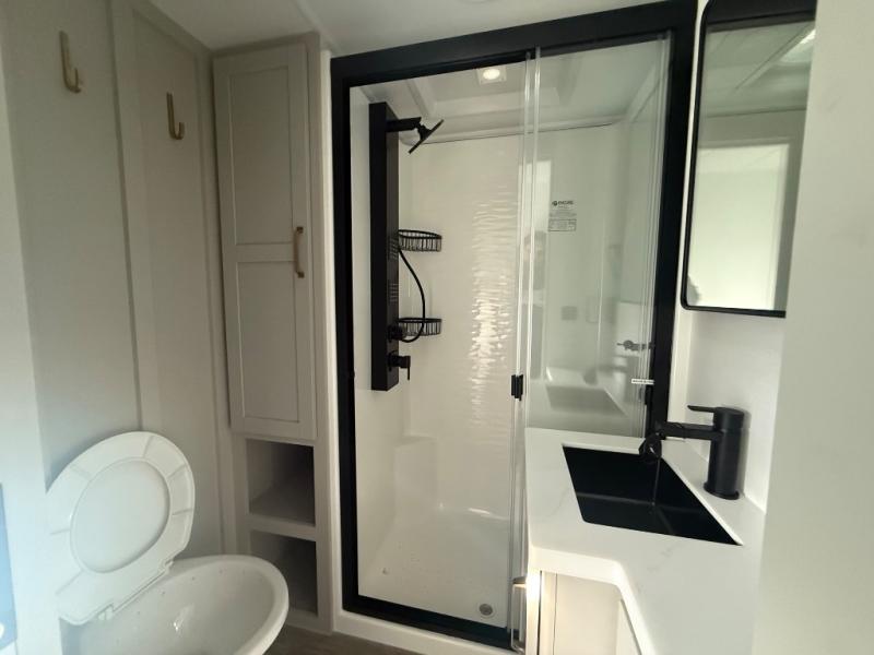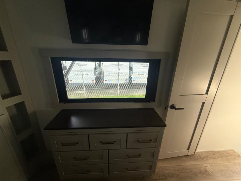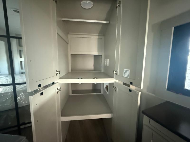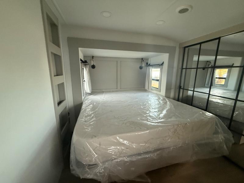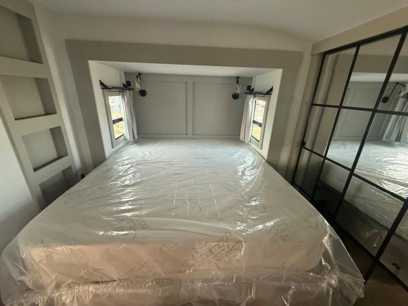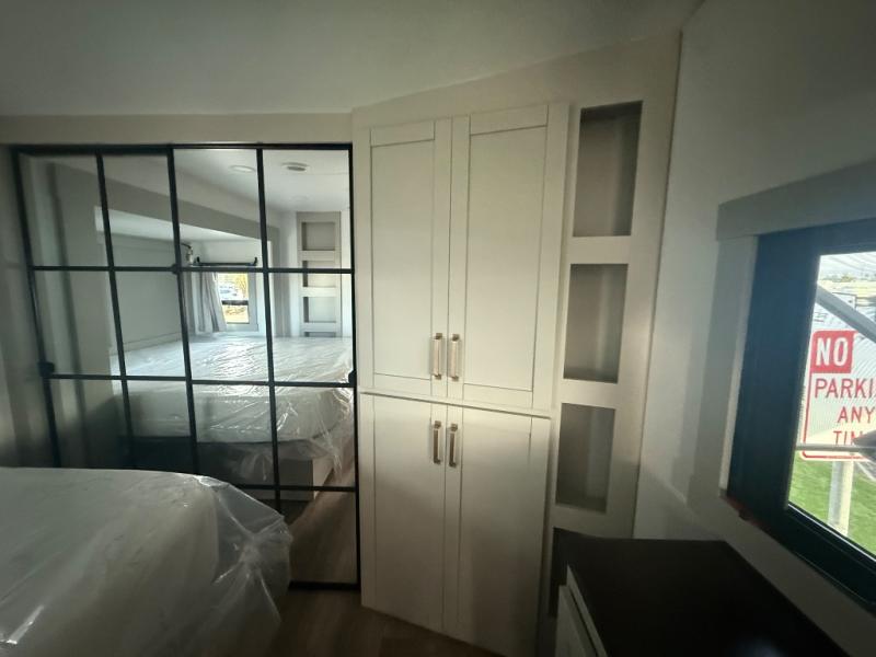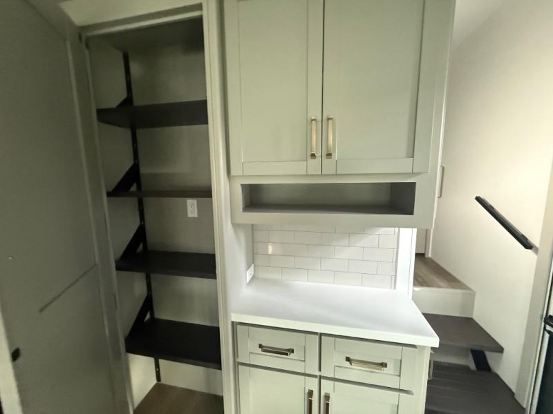 This Model Z luxury fifth wheel is bright and modern on the inside, with loads of amenities that will have you dreaming of your next trip! Enter and find a spacious combined living/kitchen space thanks to dual opposing slides. There is ample seating with a sliding desk/dining table, 62" theater seating, and a 72" tri-fold sofa along the rear wall. You can easily relax and enjoy the 50" Smart telescoping TV with a cozy fireplace below. The kitchen offers all that you need to prepare and cook meals just like home with a 16 cu. ft. refrigerator for your perishables, a 30" microwave oven, and three burner range top and oven. You will love the integrated spice rack, and the kitchen island all outfitted with dog bowls and double pull out trash bins with an integrated Stow 'N Go paper towel holder. There is also an 84" pantry with adjustable shelves for all of your canned and dry goods. Head up the steps to a private master suite with king bed slide. You can opt for the queen bed if you like. A sliding dresser top features hidden storage which is perfect for jewelry and other personal belongings. The front wardrobe features mirrored doors and the corner closet has been prepped for a stackable washer and dryer if you choose to add that option. Relax and enjoy a large bath featuring a linen cabinet, a 30" x 42" shower, and vanity with sink, plus medicine cabinet.